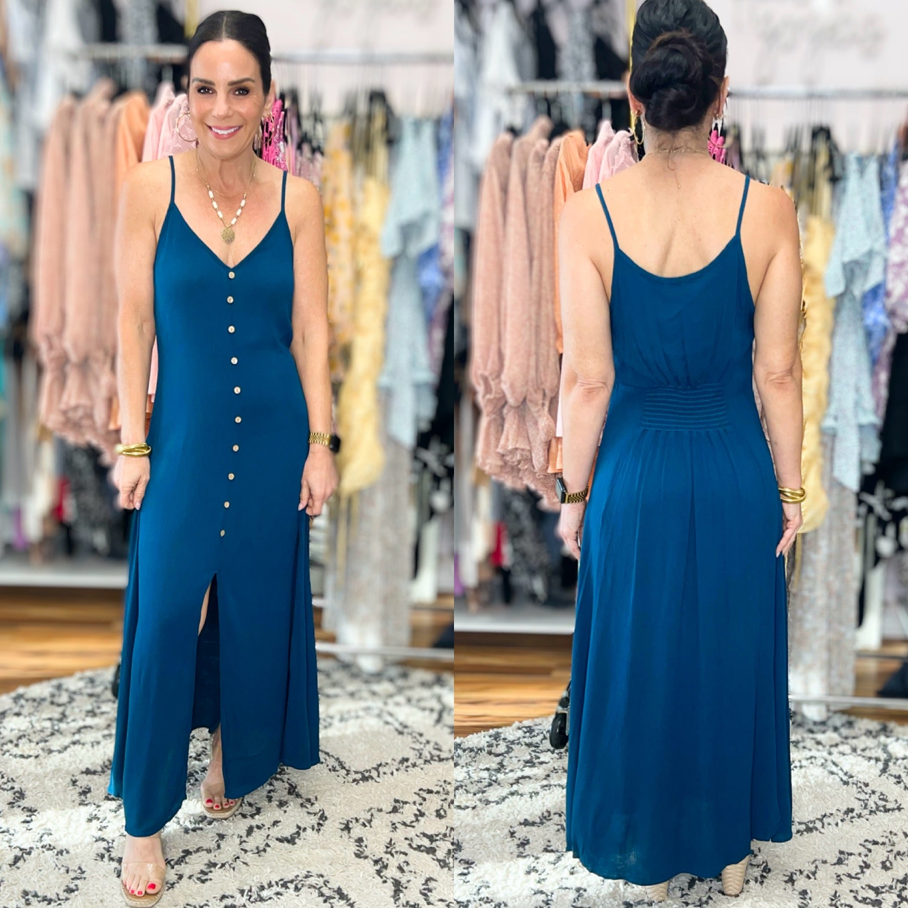 Introducing our captivating Adeline deep teal dress, exquisitely crafted from washed rayon gauze for a luxurious feel. Adorned with delicate button and trim detailing along the front, this dress exudes elegance with its subtle yet enchanting design. The front slit adds a touch of allure while ensuring effortless movement, making it ideal for any occasion. Embrace the graceful flow of this enchanting dress, destined to make a statement wherever you go.