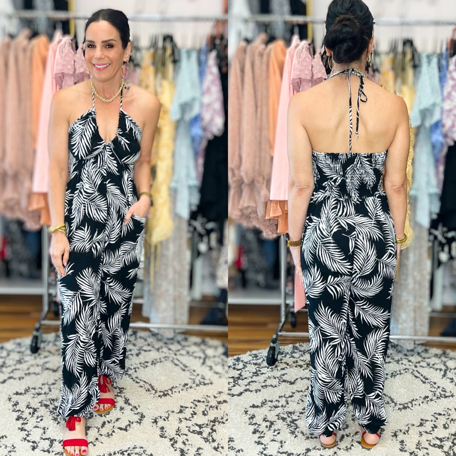 The Aloha jumpsuit not only boasts a leaf motif and a printed deep V-neck tie but also includes a smocked back for added comfort and versatility. Additionally, the tie can be styled in several ways, allowing for various looks to suit different occasions. Material is 100% rayon gauze and features generous pockets.