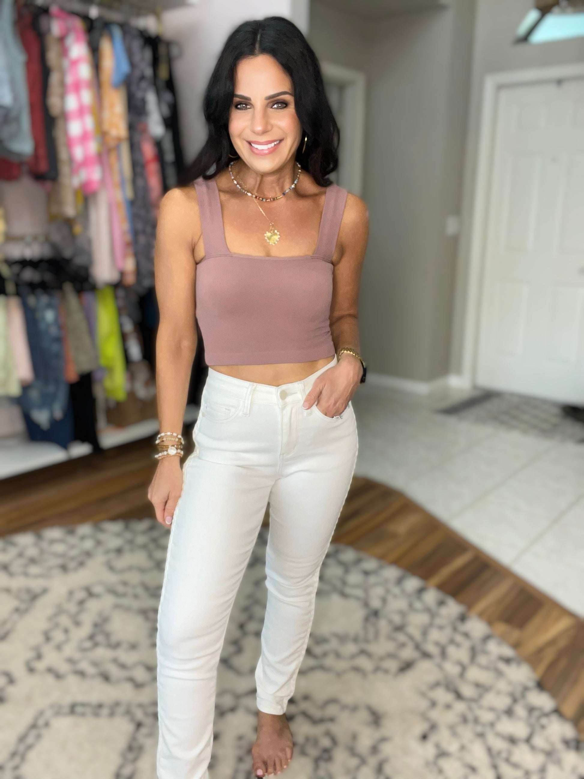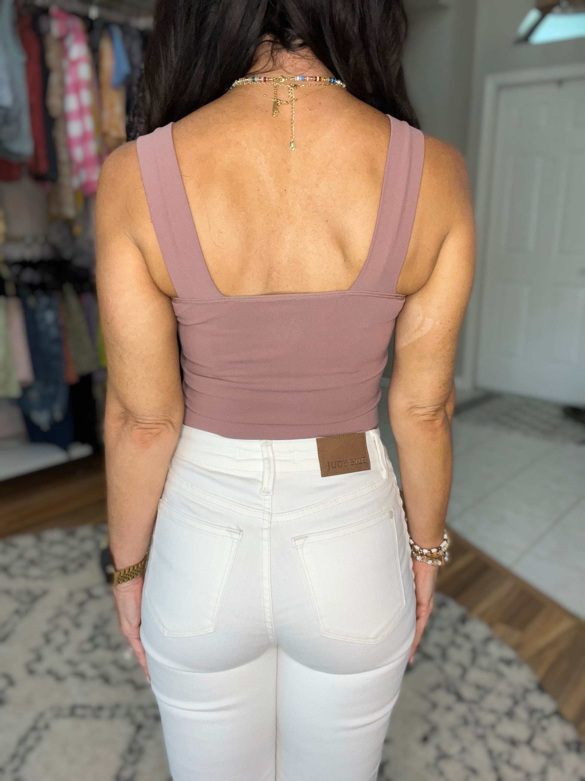 A high quality seamless thick shoulder strapped cami crop top in a beautiful new mauve color