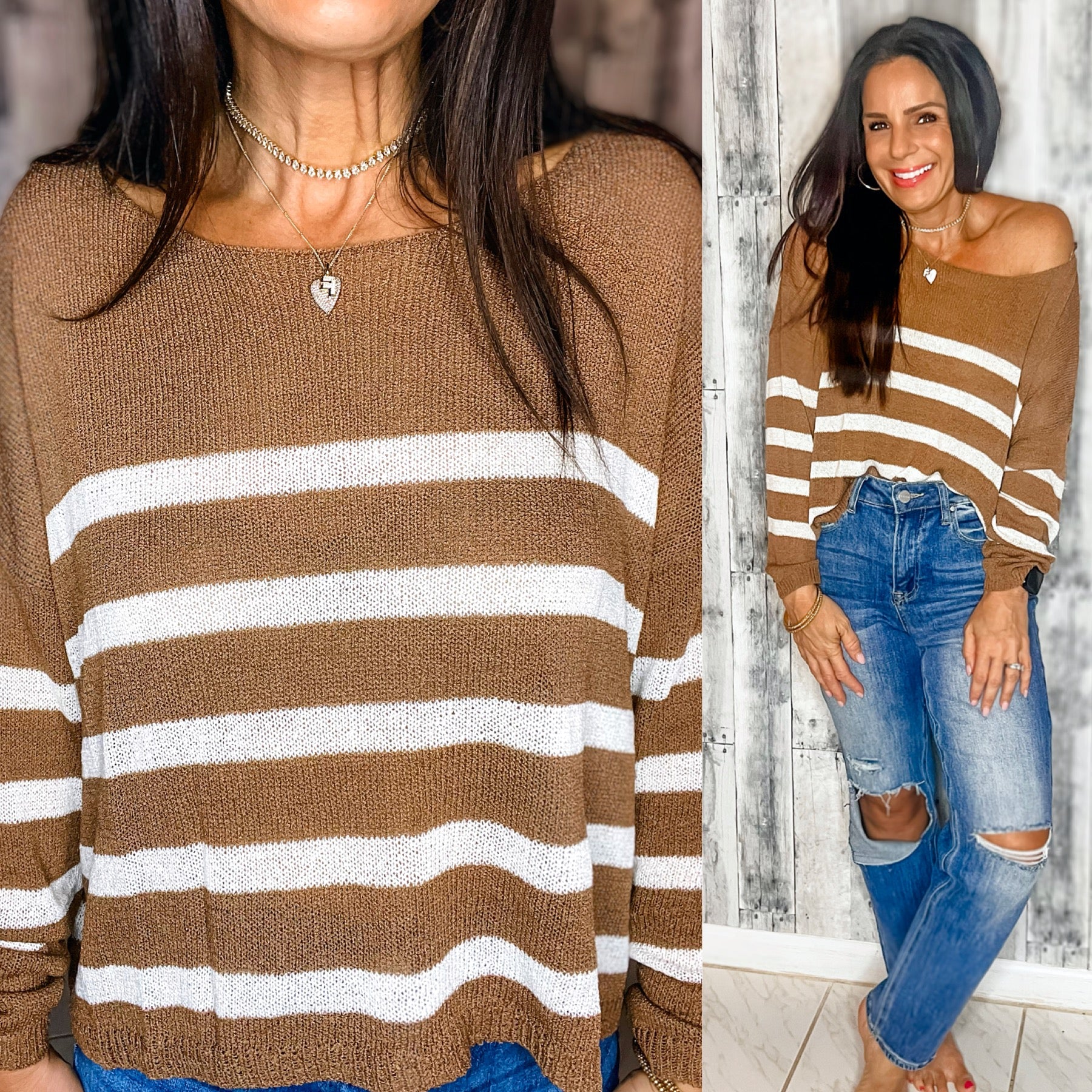 Brown sugar striped sweater. Soft, stretchy and extremely lightweight. Wide neck can also be pulled down off one shoulder.