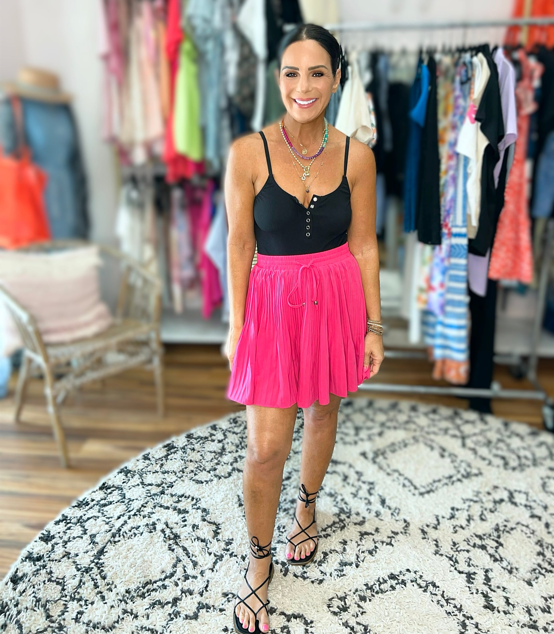 Effortlessly elevate your style with our Bet Your Bottom Dollar Skirt in hot pink! Made with luxurious Bulgari fabric, this skirt features a comfortable cased elastic waistband and a functional drawstring for the perfect fit. The pleated design adds a touch of elegance, while the attached shorts beneath provide maximum coverage.