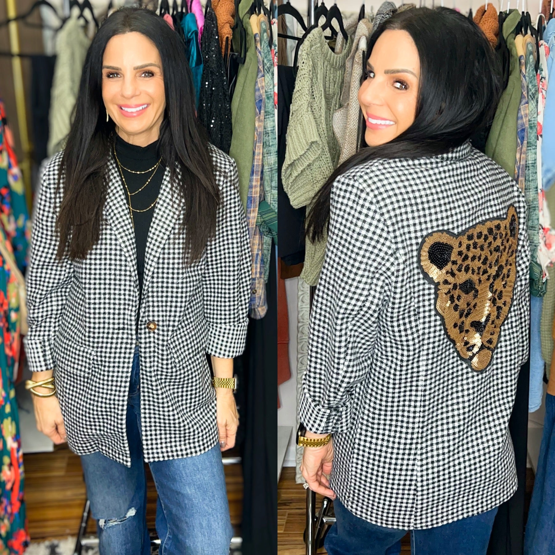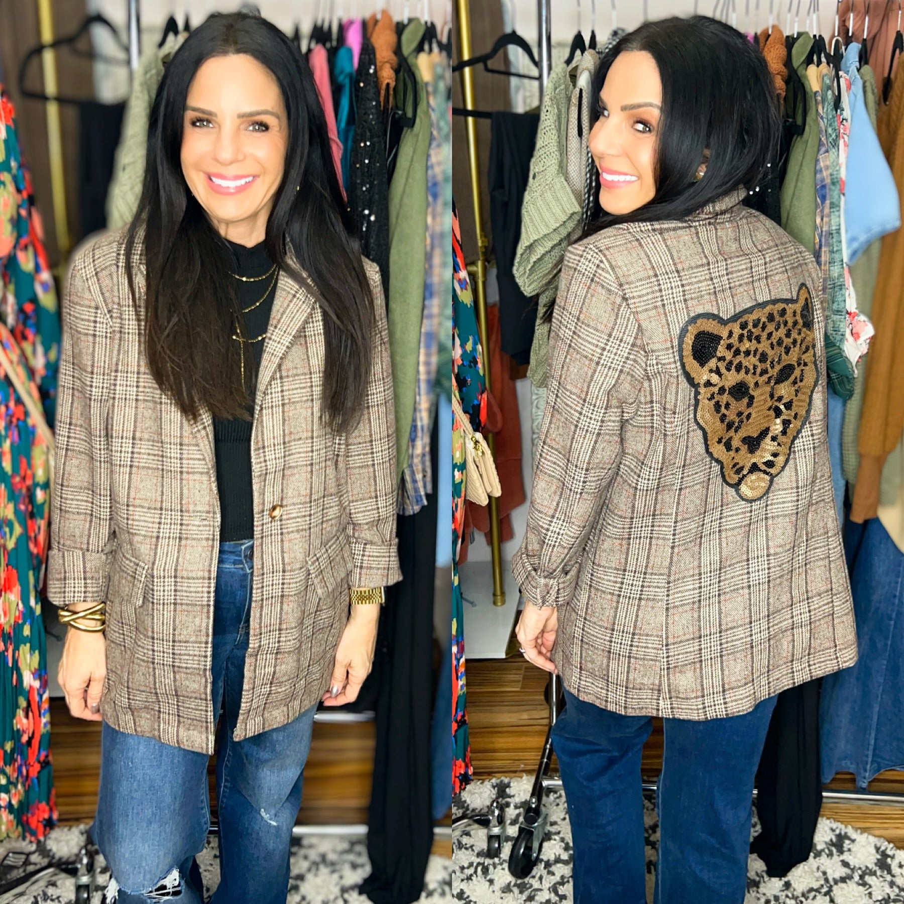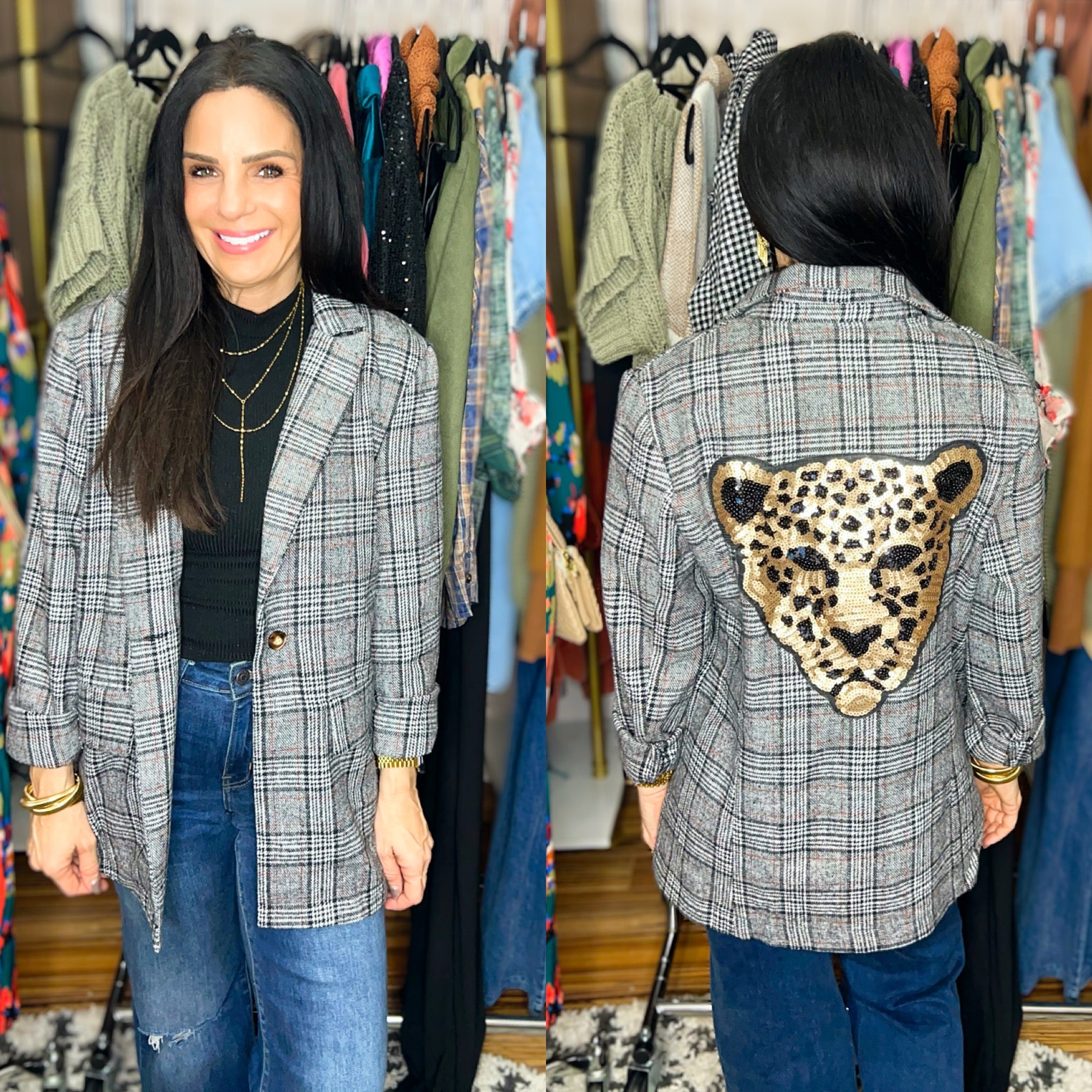 The perfect blazer that everyone has been searching for! Features working front pockets and a large sequin leopard patch on the back.