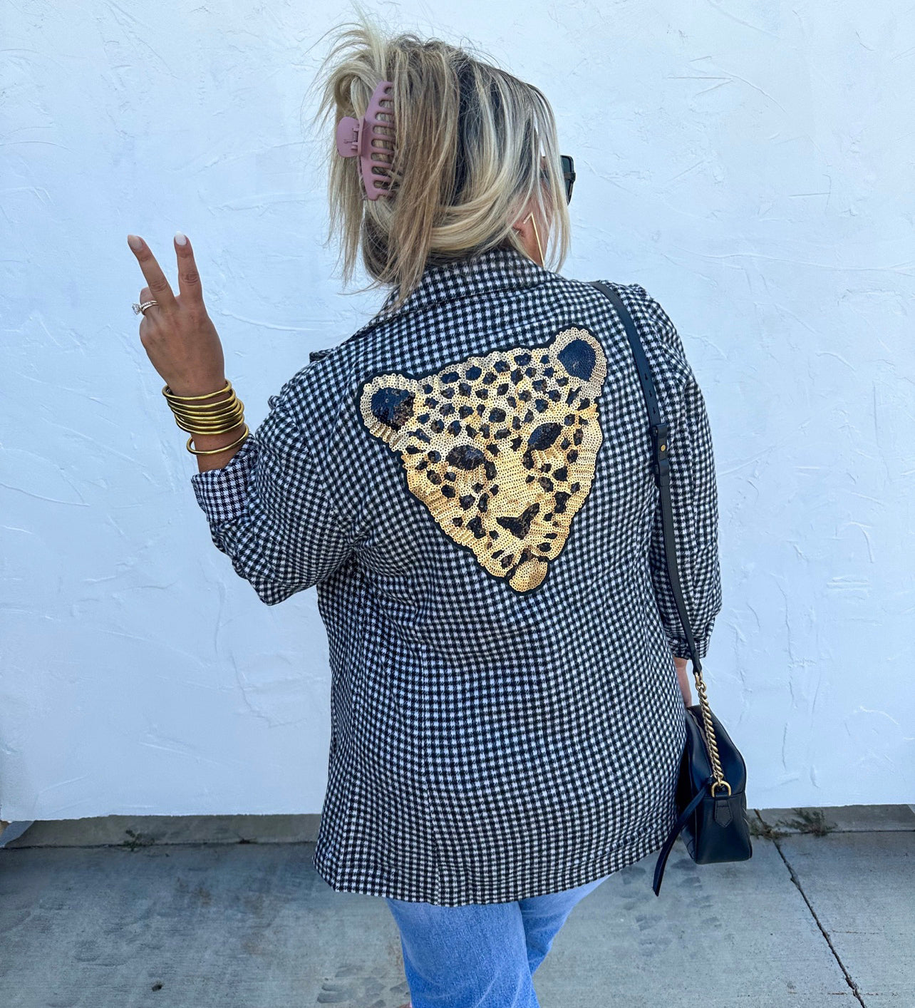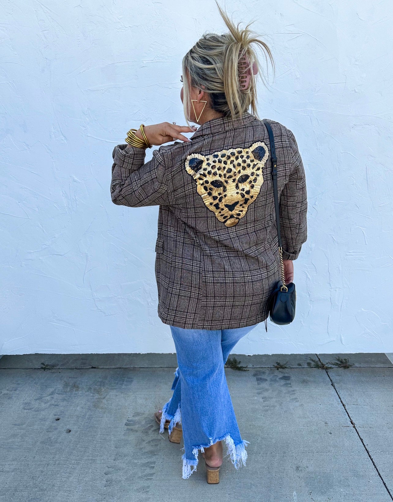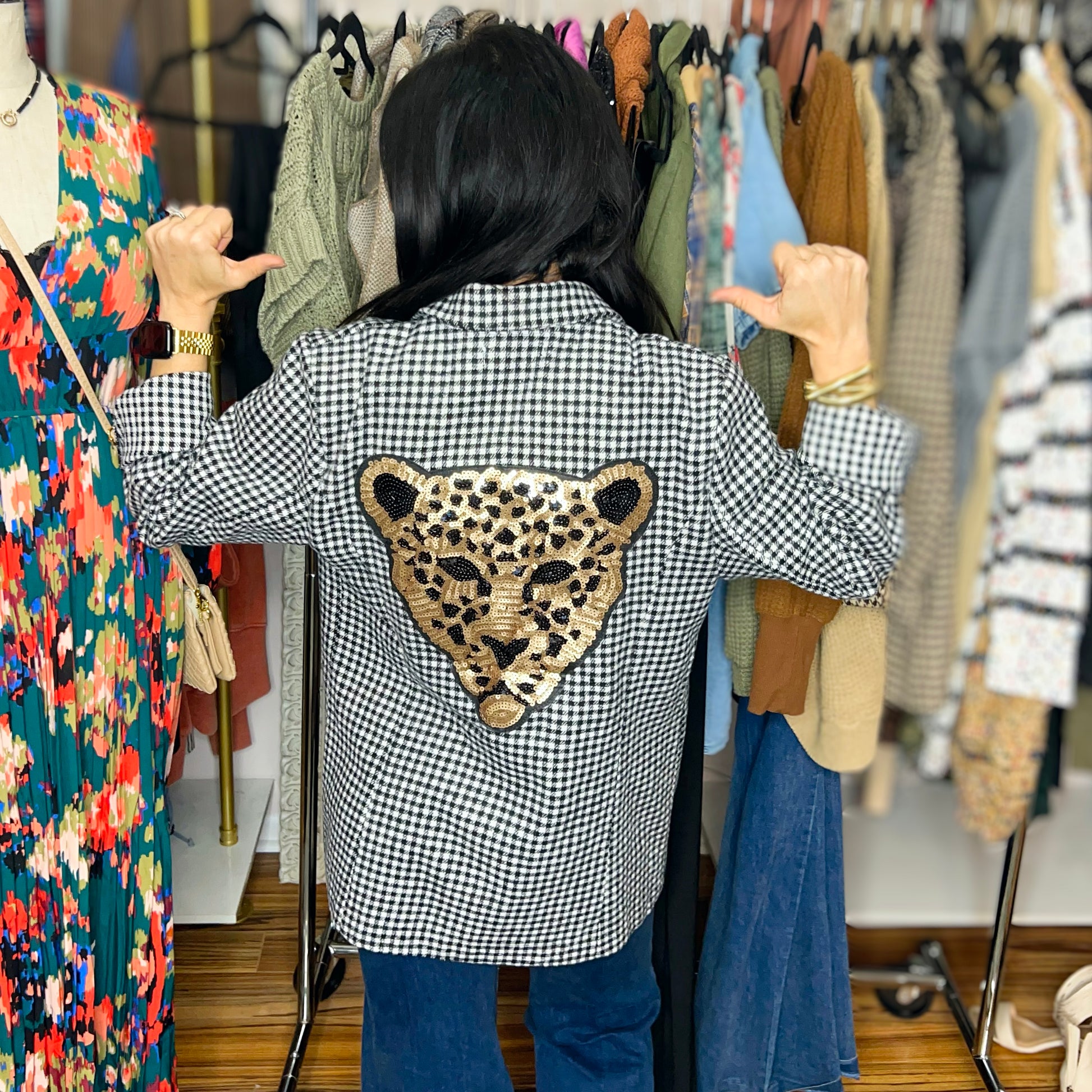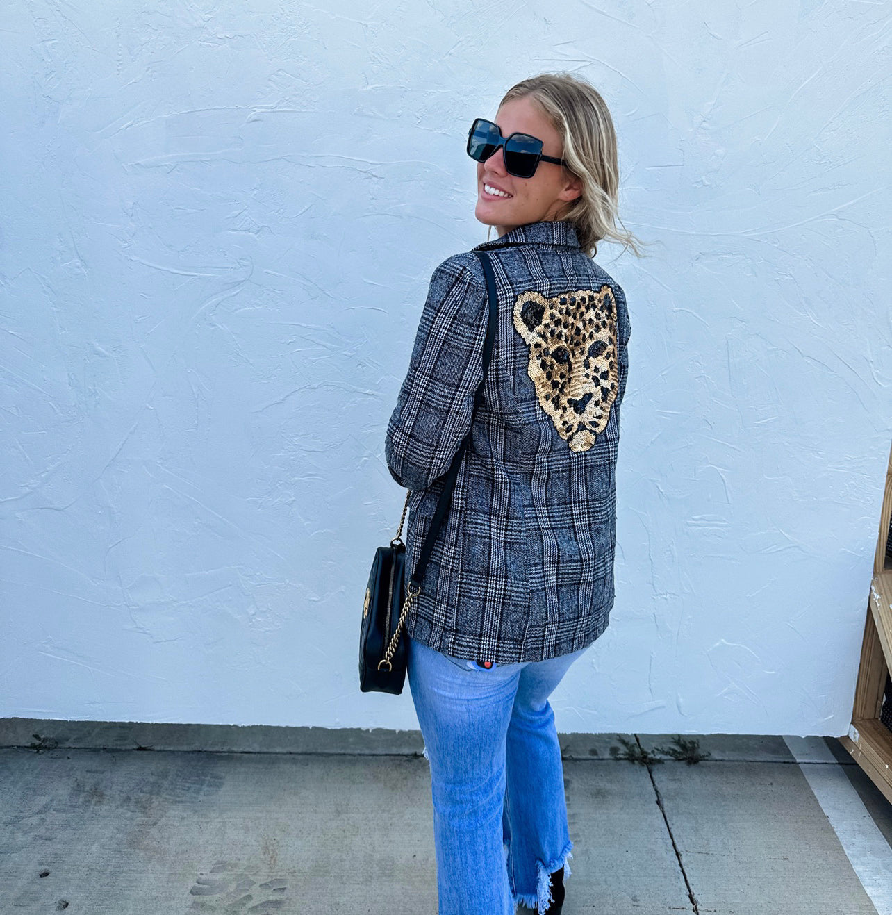 The perfect blazer that everyone has been searching for! Features working front pockets and a large sequin leopard patch on the back.