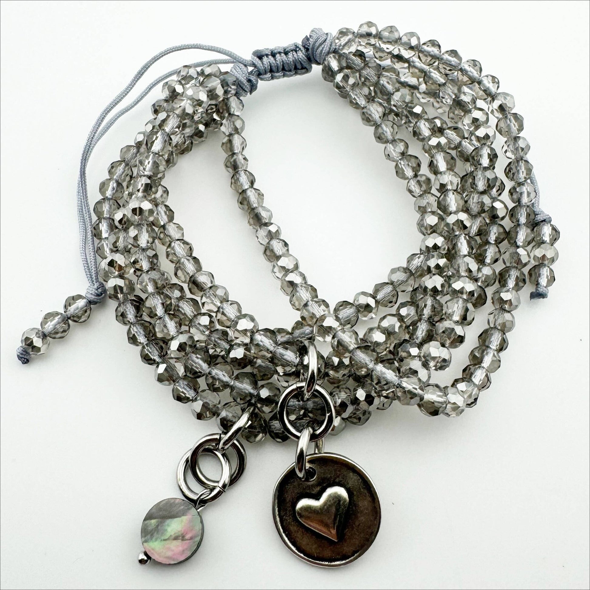 * 4mm multi-strand (6) crystal bead bracelet * Adjustable with a pull of a string - fits most wrists * Choose a silver or gold finish pendant * Wear by itself or layer with another bracelet Choose from: * Beige crystal beads with crystal quartz OR * Silver-gray crystal beads with black lip pearl beaded bracelet
