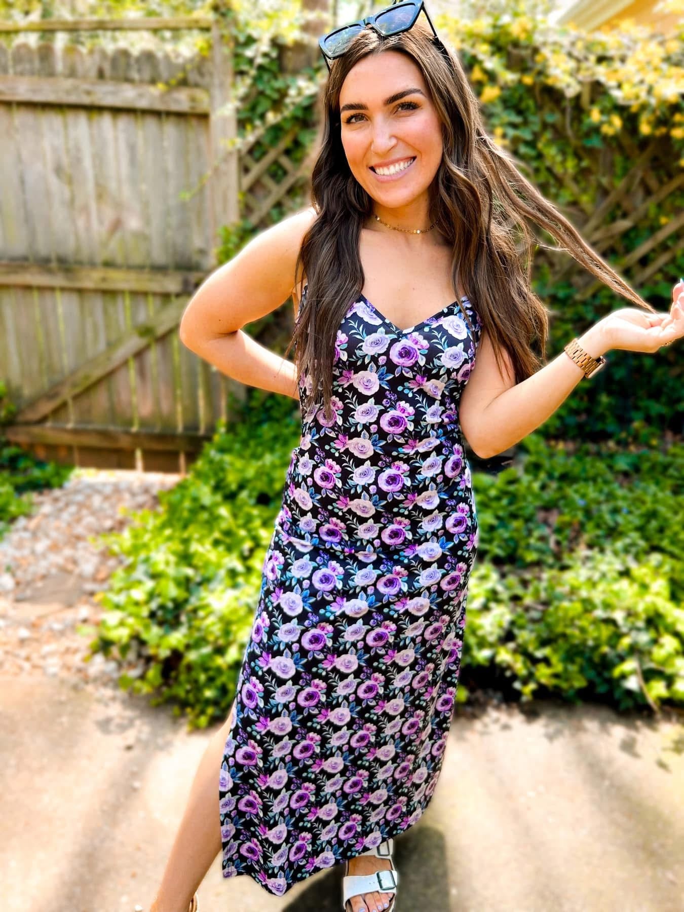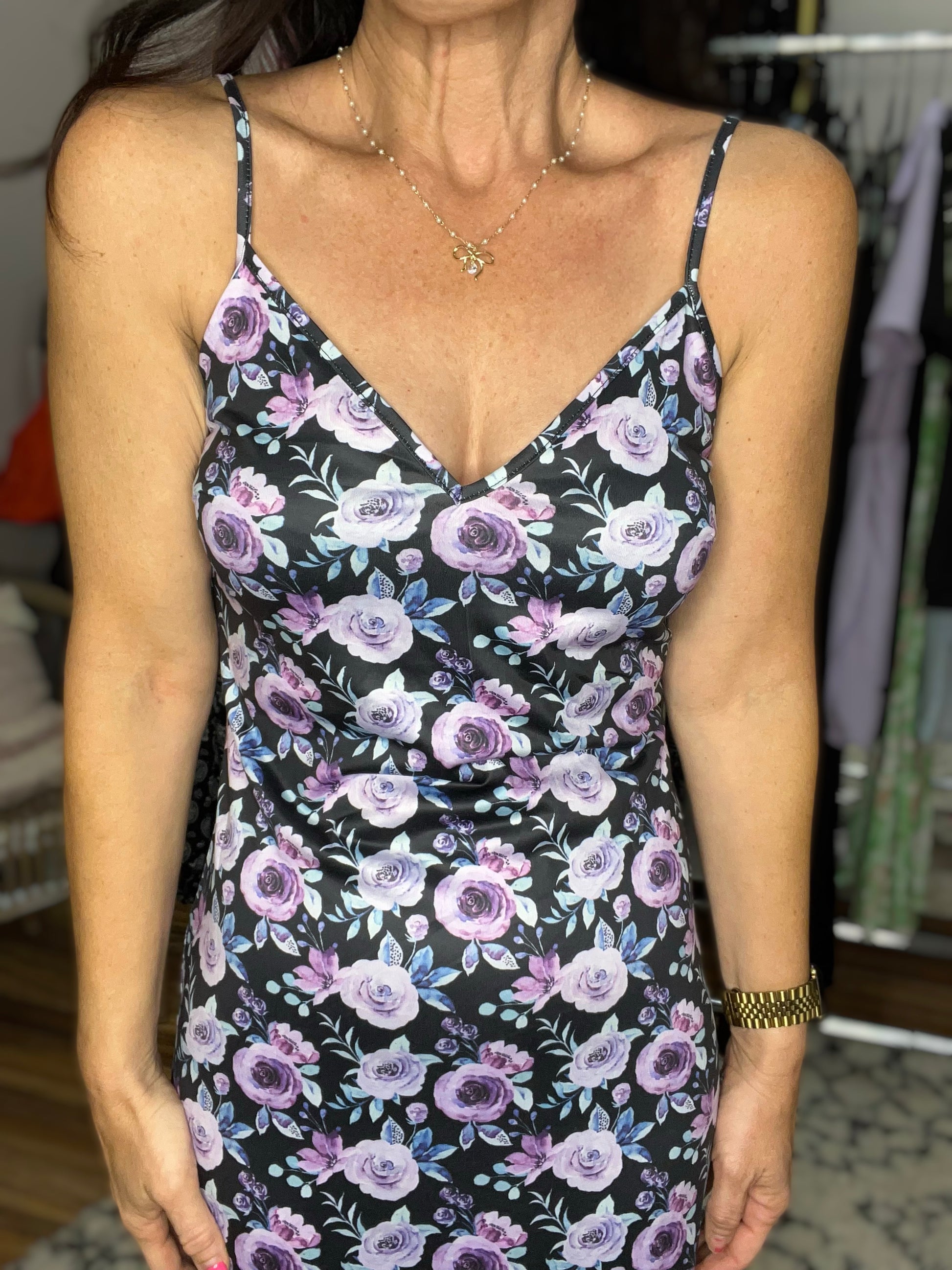 The best-selling Brooklyn dress is back in a gorgeous floral print! So be sure to flaunt what your mama gave you in this fun, bright, and ultra versatile bodycon dress. Made with a fitness-style fabric to not only keep the spring & summer heat at bay on your skin, but to also create a skin smoothing camouflage effect 🙌 Adjustable straps, deep v cut, single side slit for mobility, fitted yet stretchy, and flood length (yes, you can actually walk in her 🤣).