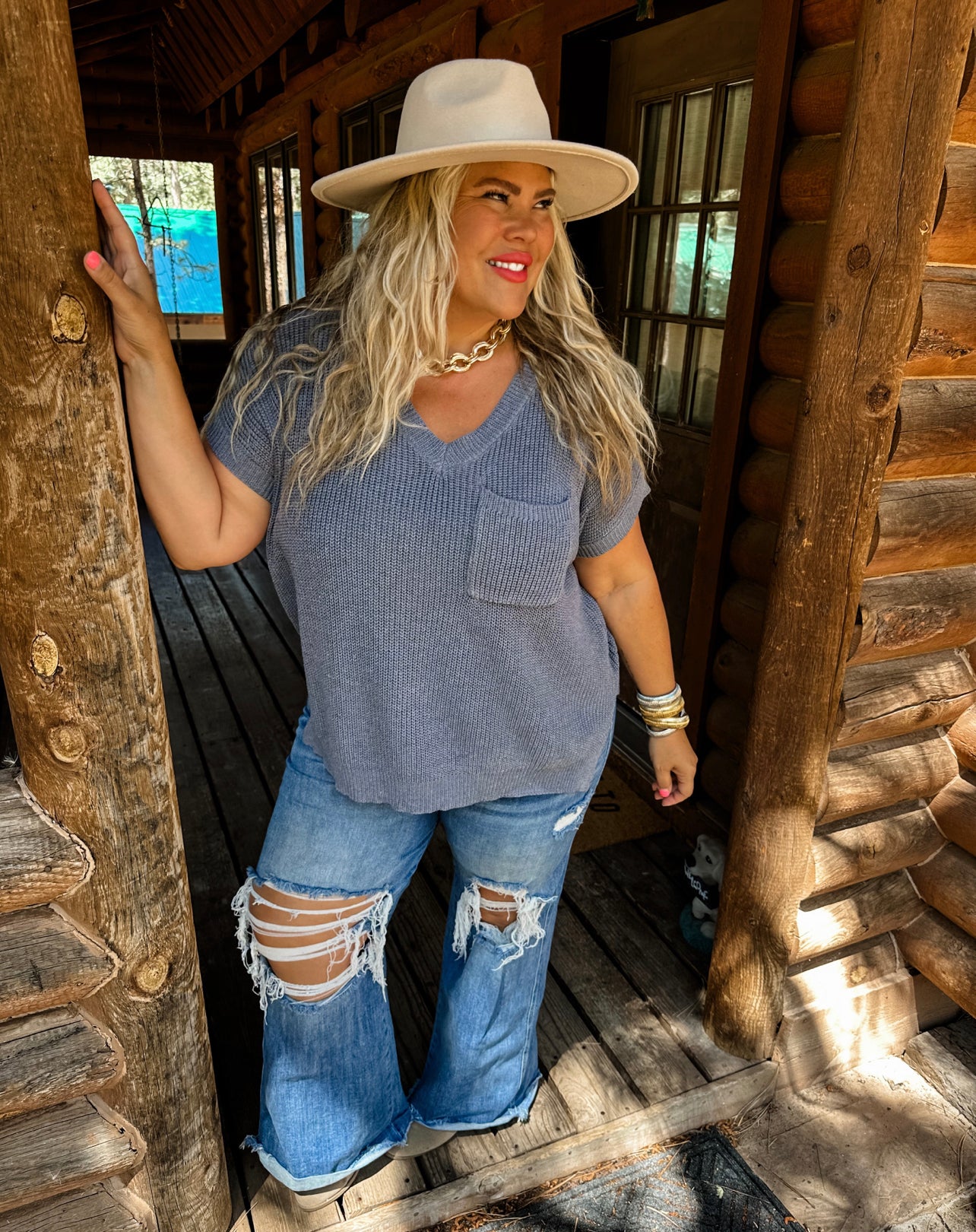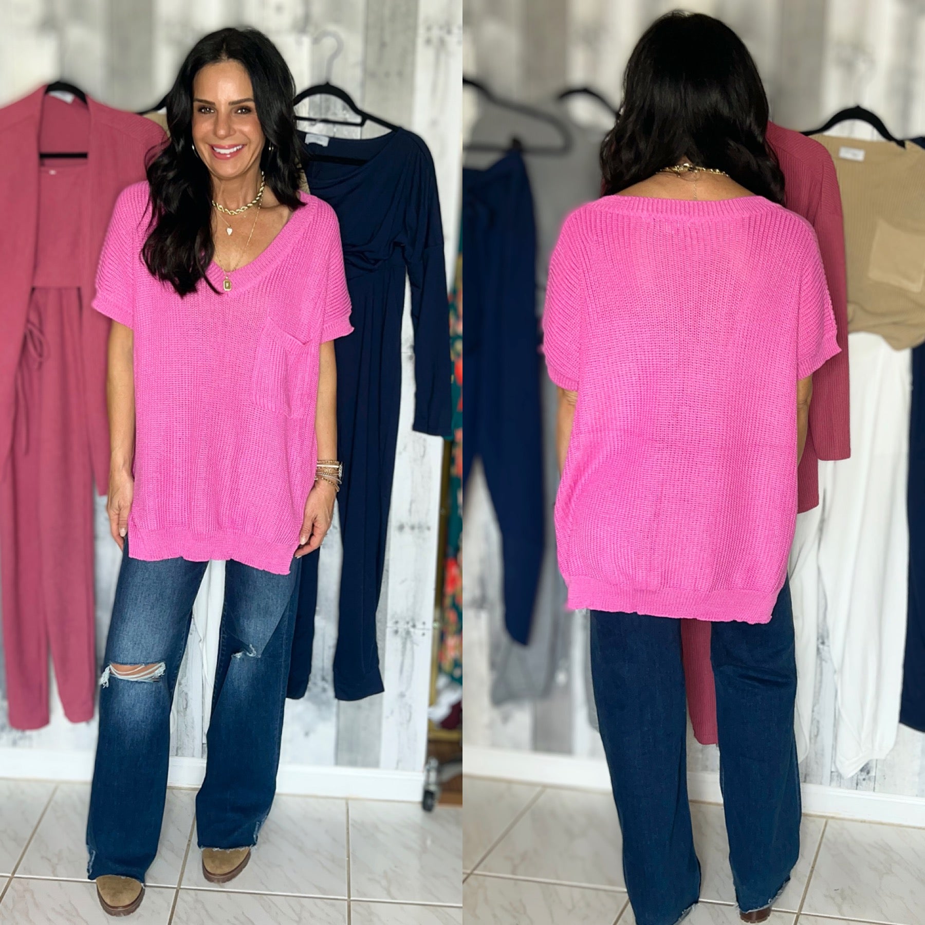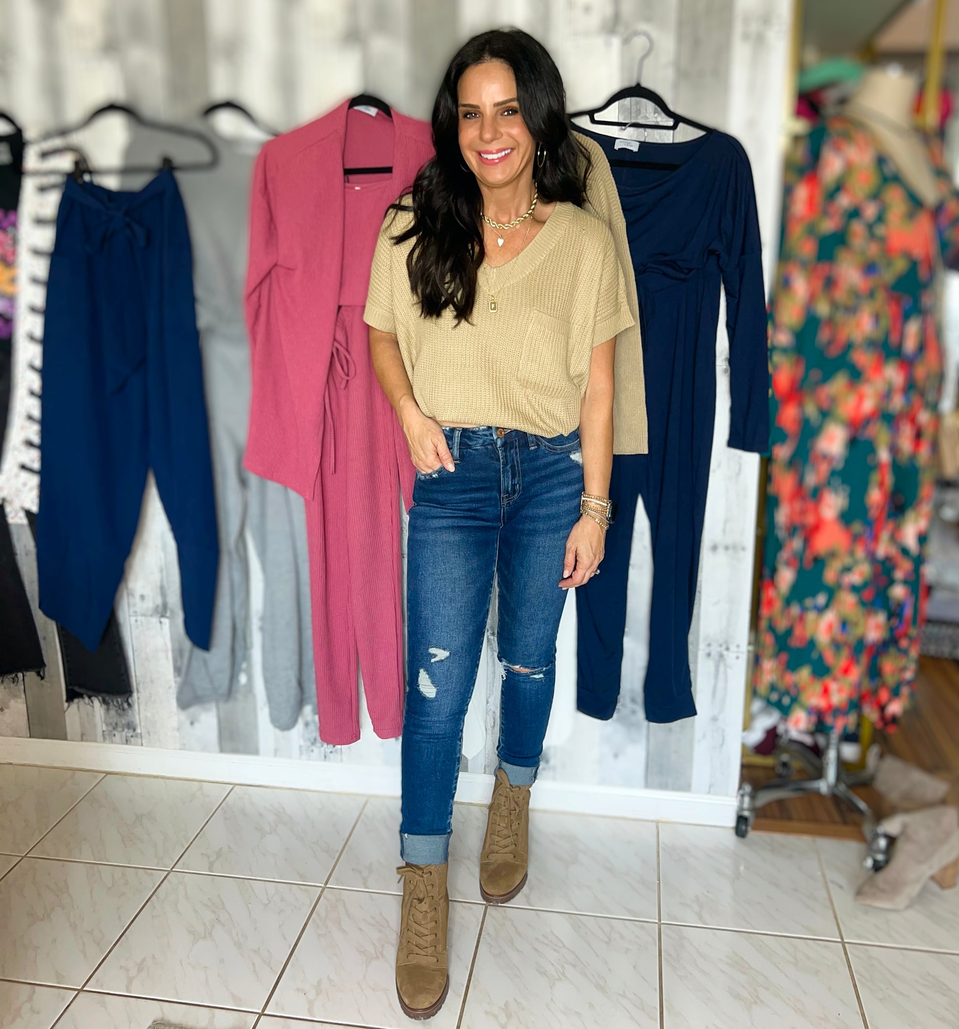 The perfect V-Neck, pocket knit sweater! So casual, yet so classy! This is a medium weight knit and perfect for the Fall/Winter transition. Wear it long, or give it a tuck for a more fitted look!