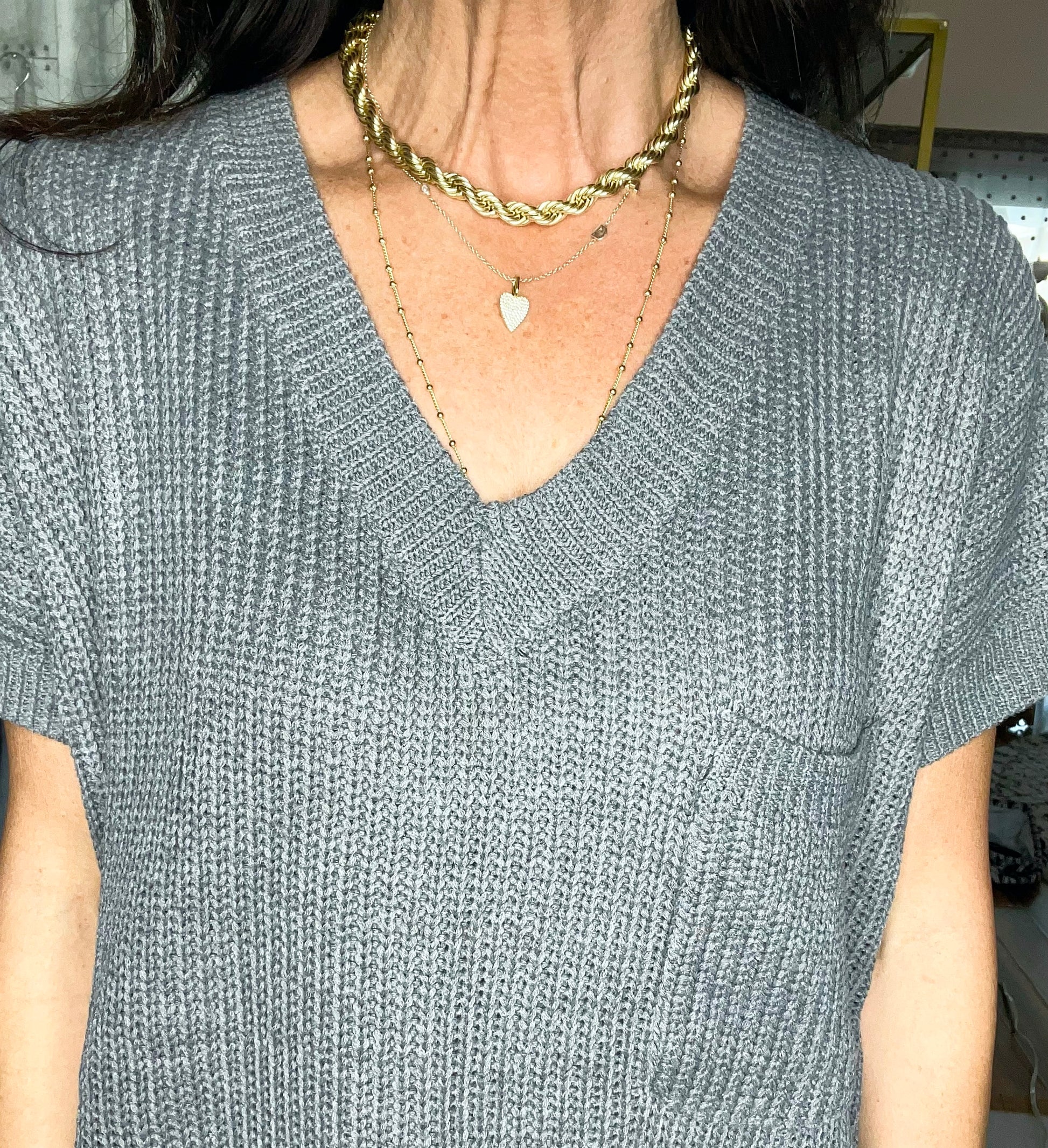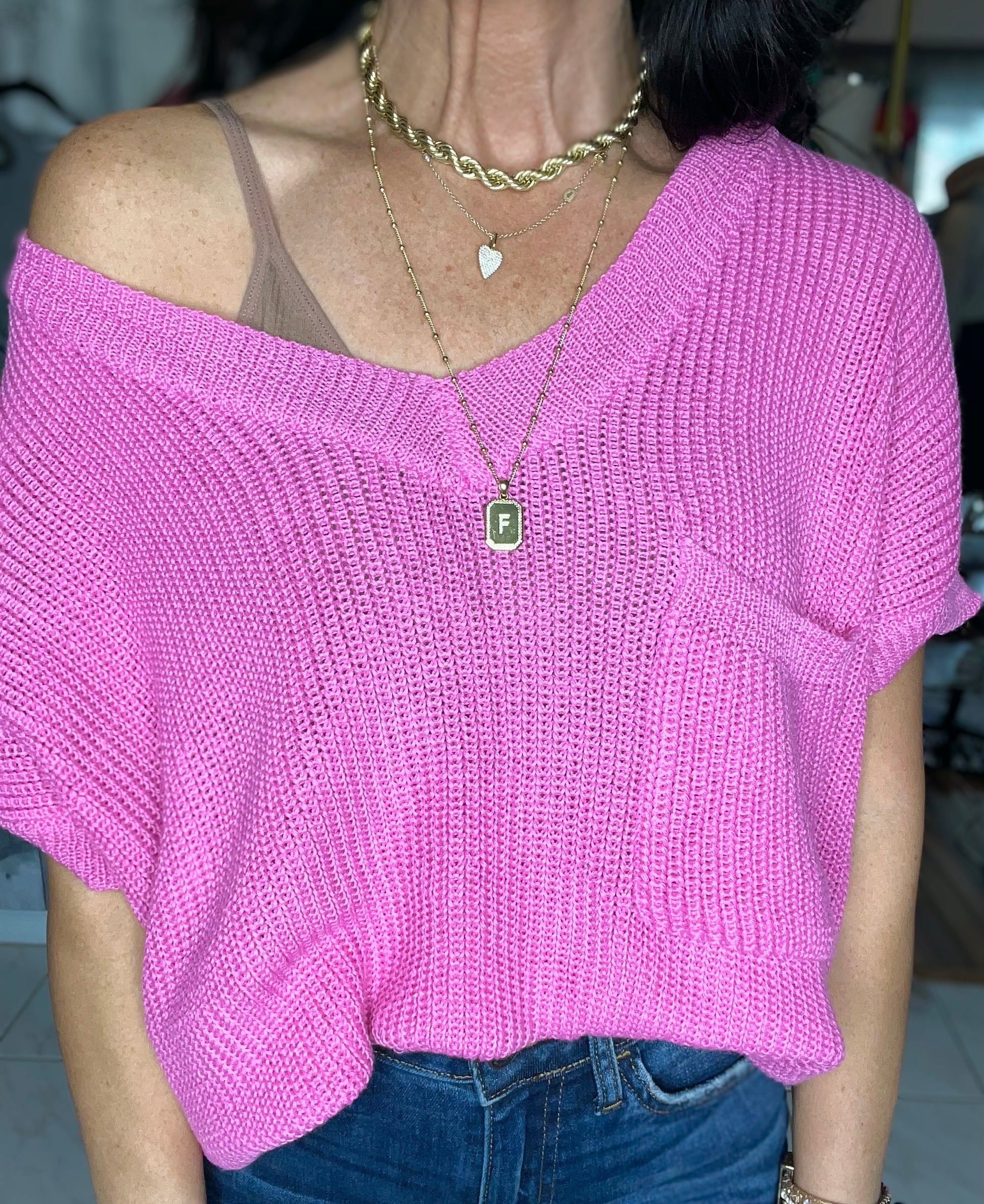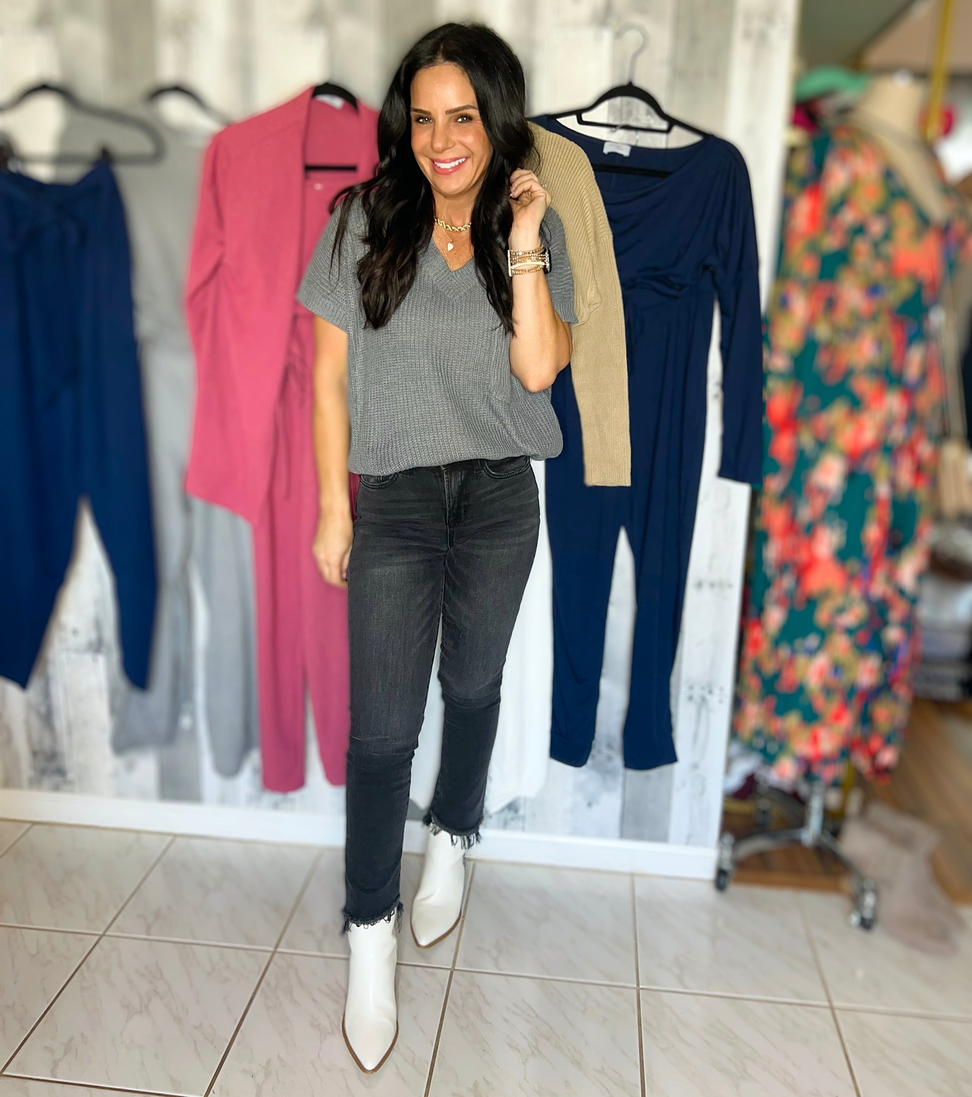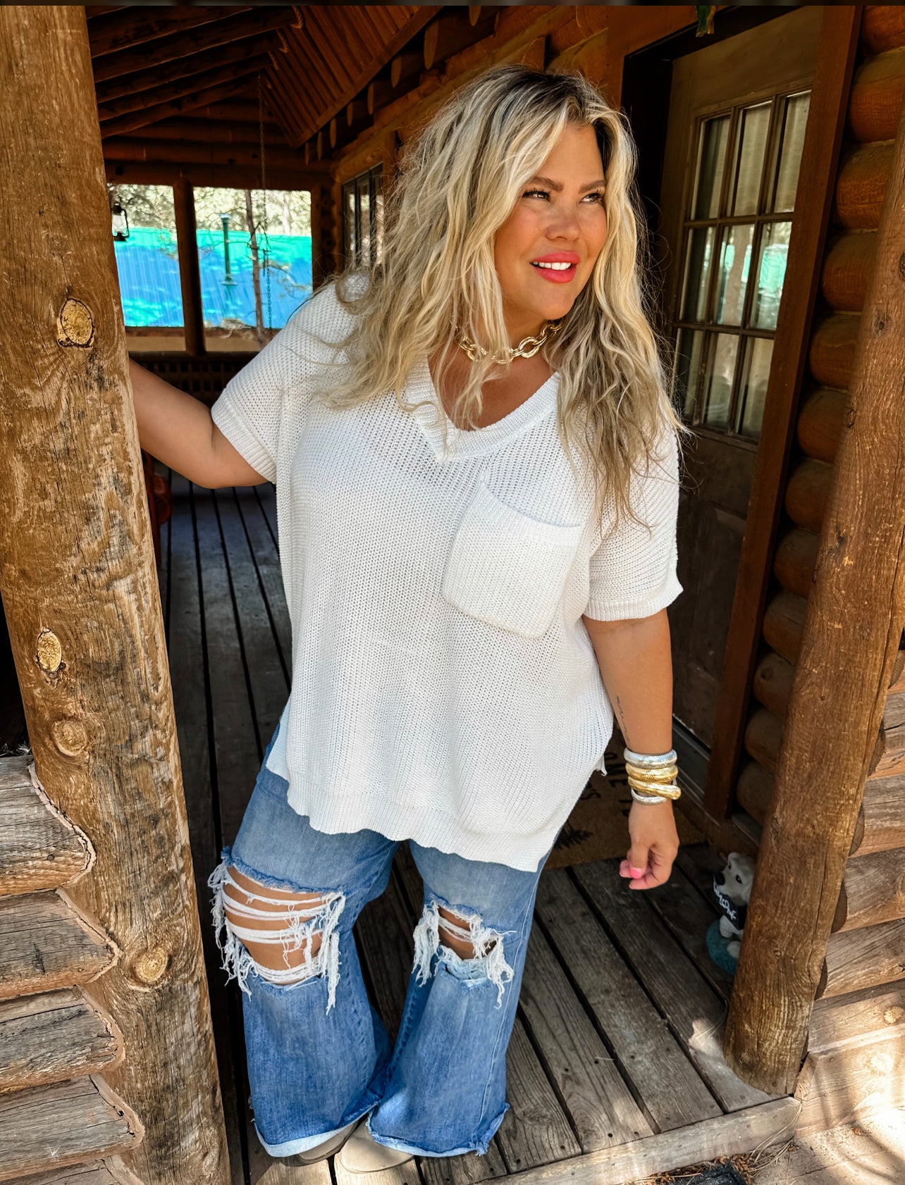 The perfect V-Neck, pocket knit sweater! So casual, yet so classy! This is a medium weight knit and perfect for the Fall/Winter transition. Wear it long, or give it a tuck for a more fitted look!