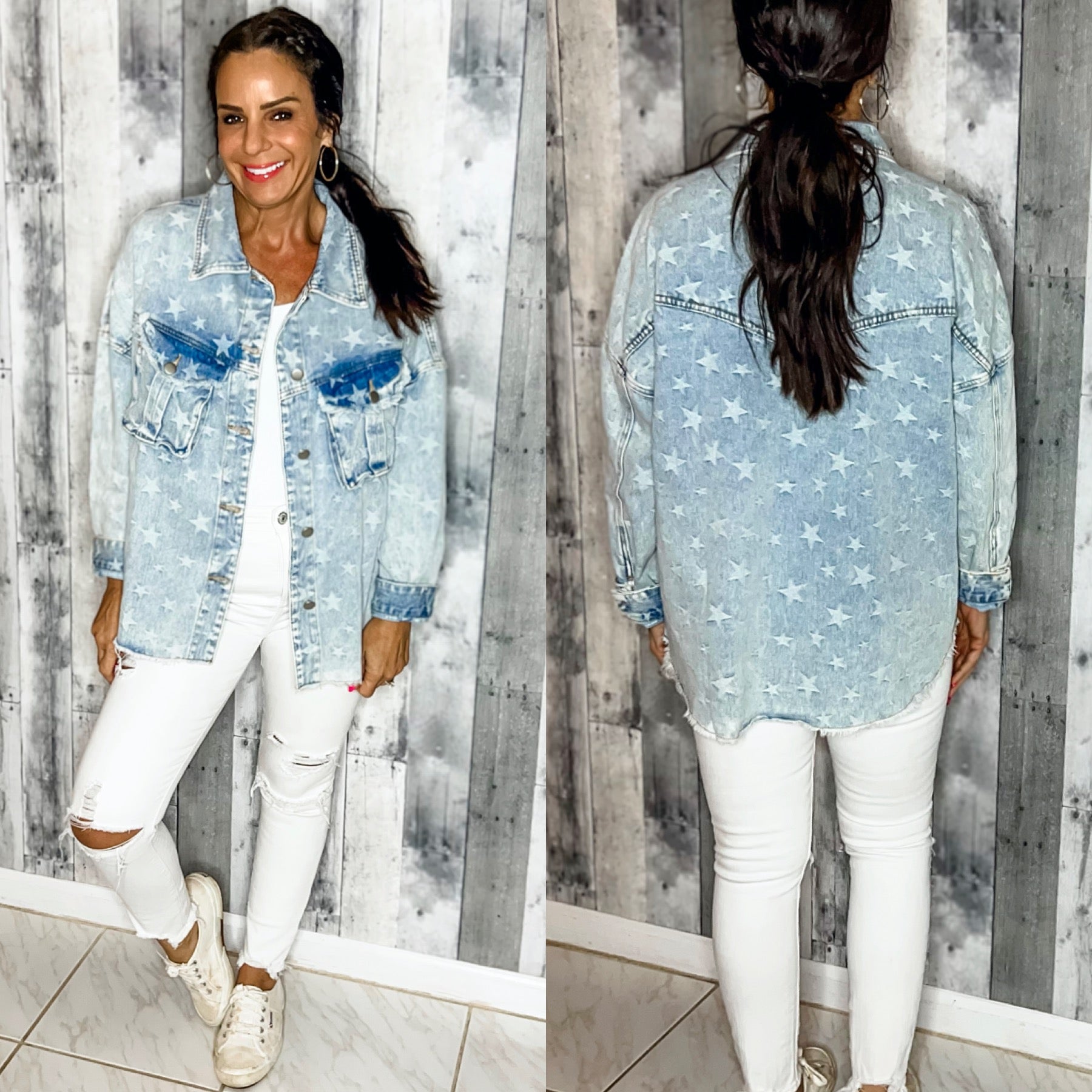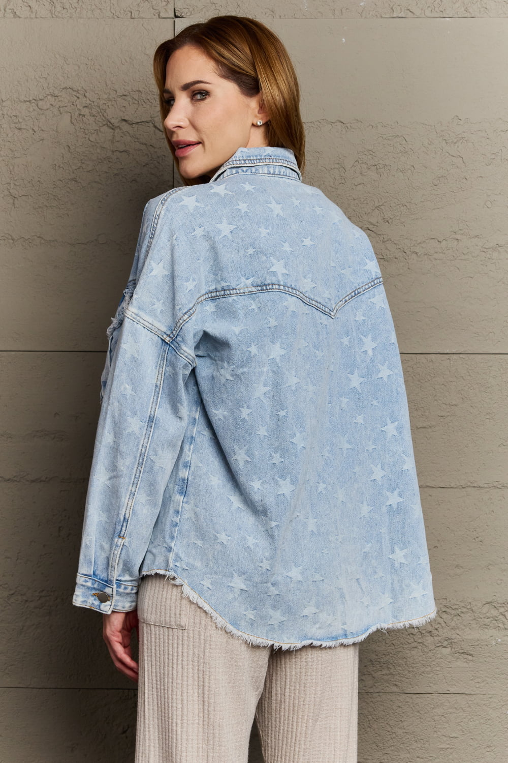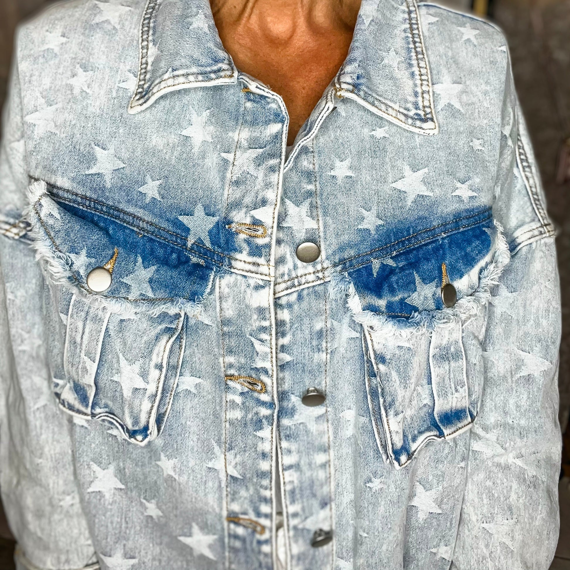 This shacket features a vintage-inspired washed look, giving it a rugged yet fashionable appeal. The distressed star pattern adds a touch of uniqueness to the design, making it stand out from ordinary denim shackets. With its comfortable fit and timeless style, this shacket is perfect for casual outings, concerts, or any event where you want to make a statement.