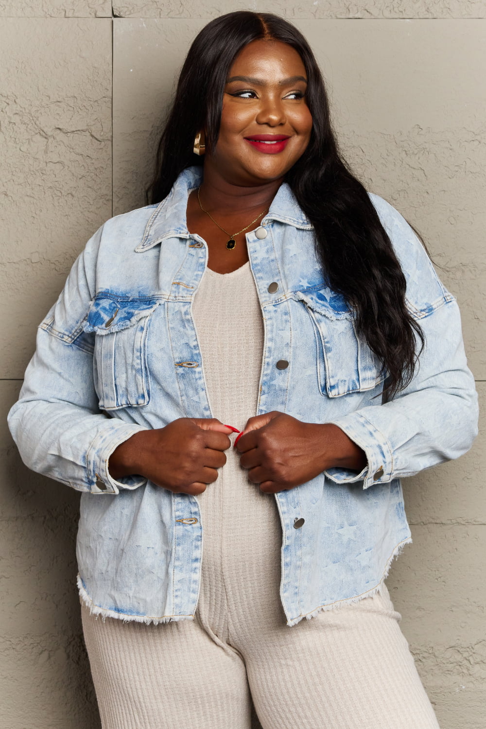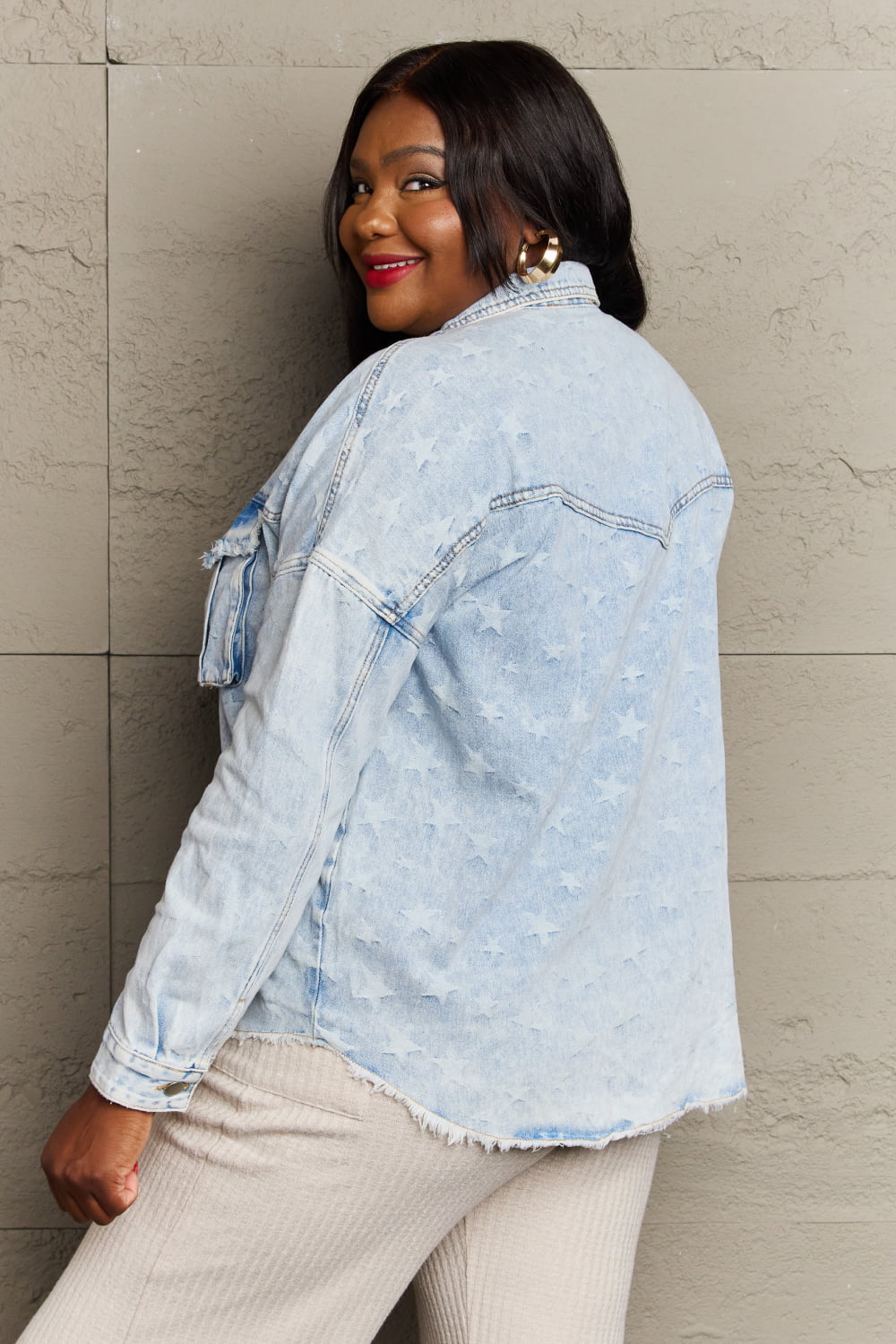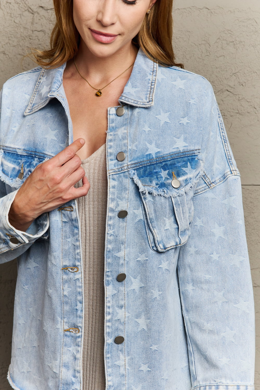 This shacket features a vintage-inspired washed look, giving it a rugged yet fashionable appeal. The distressed star pattern adds a touch of uniqueness to the design, making it stand out from ordinary denim shackets. With its comfortable fit and timeless style, this shacket is perfect for casual outings, concerts, or any event where you want to make a statement.