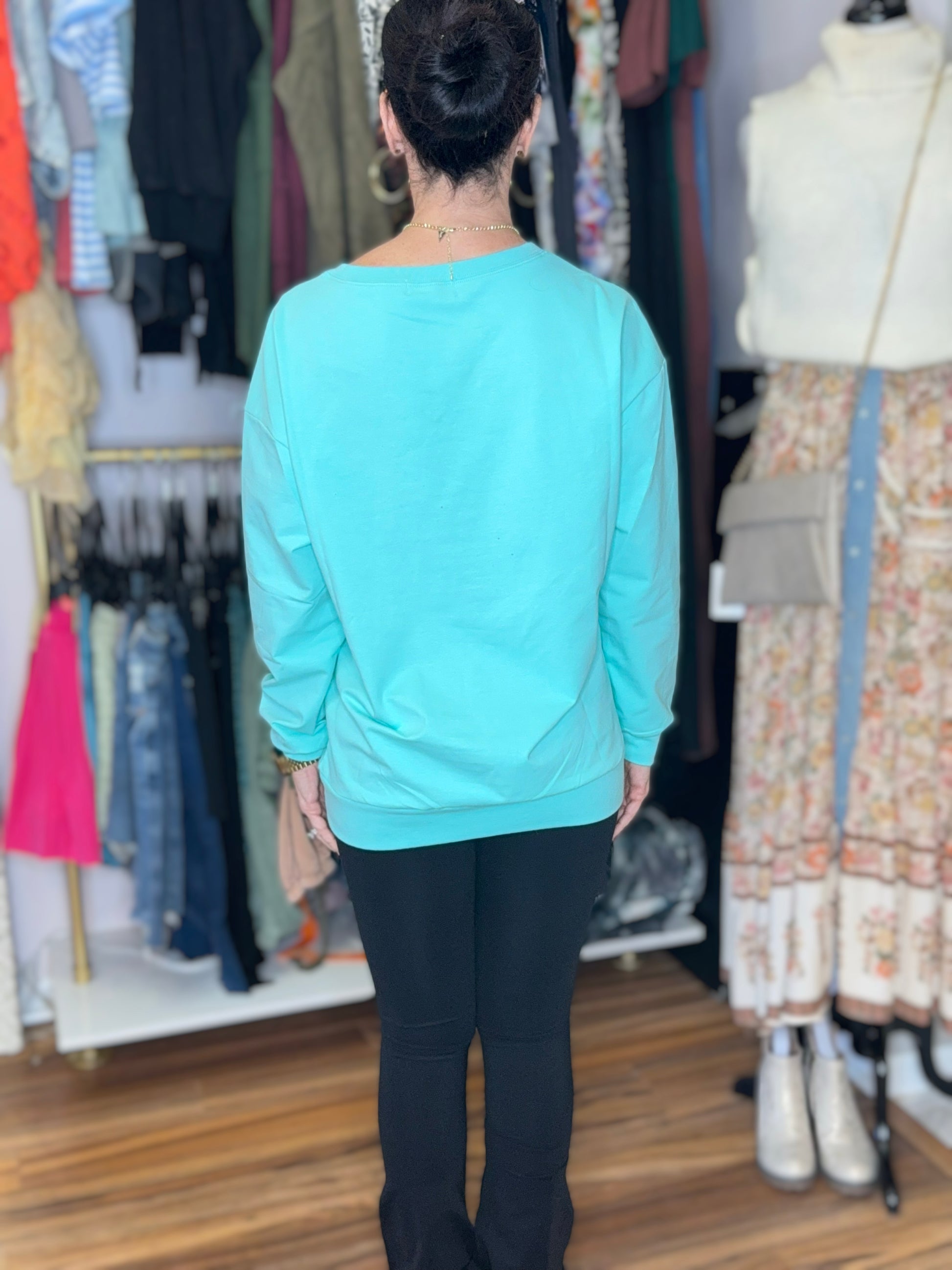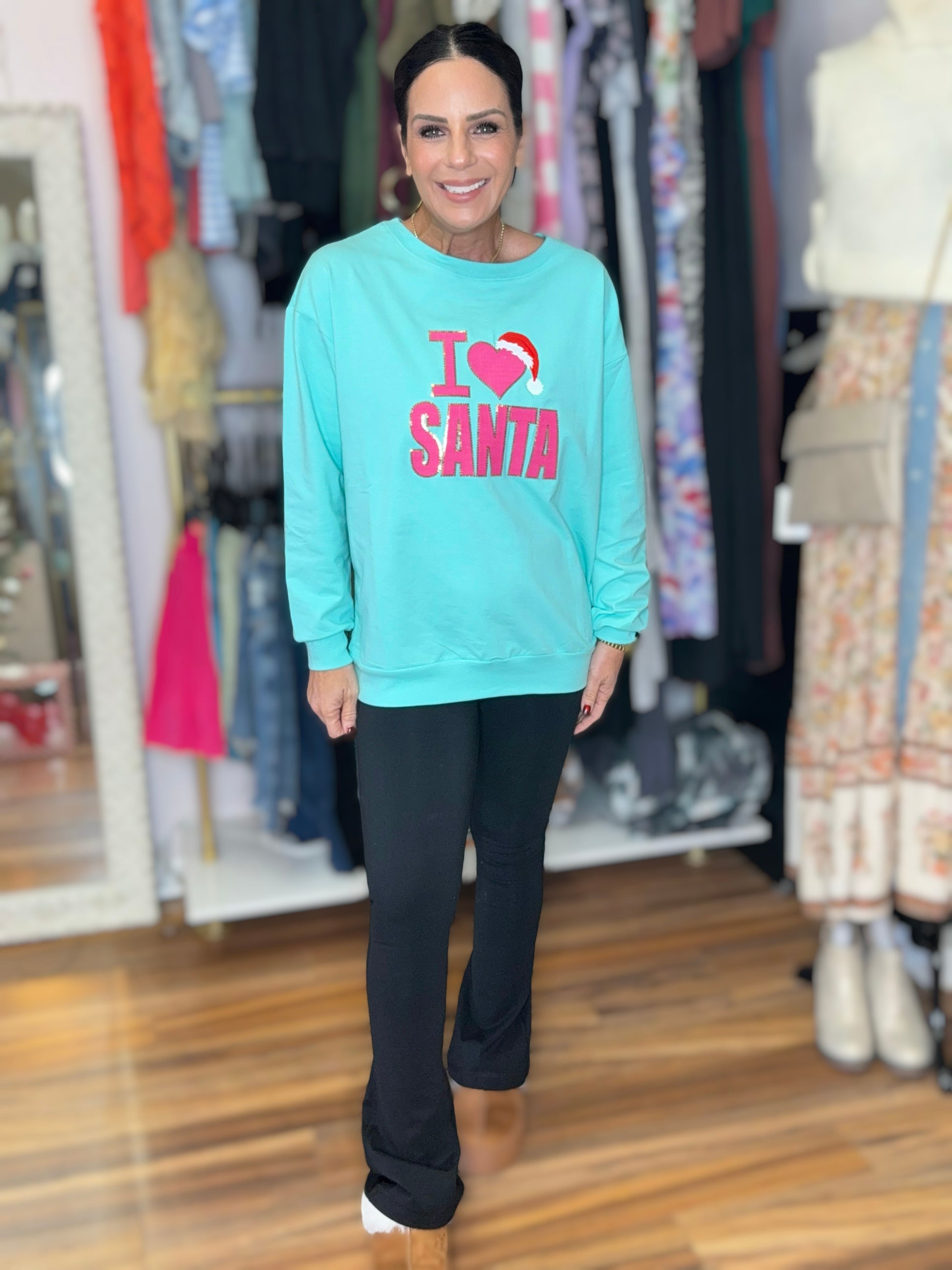 Stay cozy and show your love for Santa with this I Love Santa sweatshirt. With its soft teal body and adorable pink embroidered design, this sweatshirt is perfect for the holiday season. Spread Christmas cheer in comfort and style.