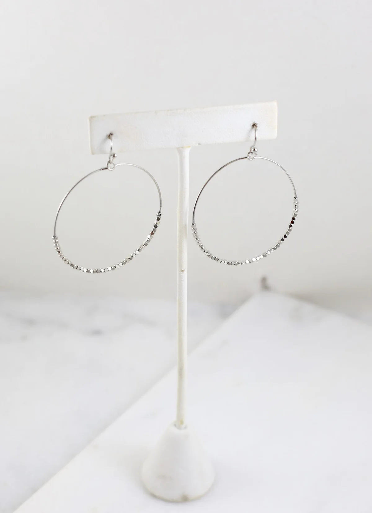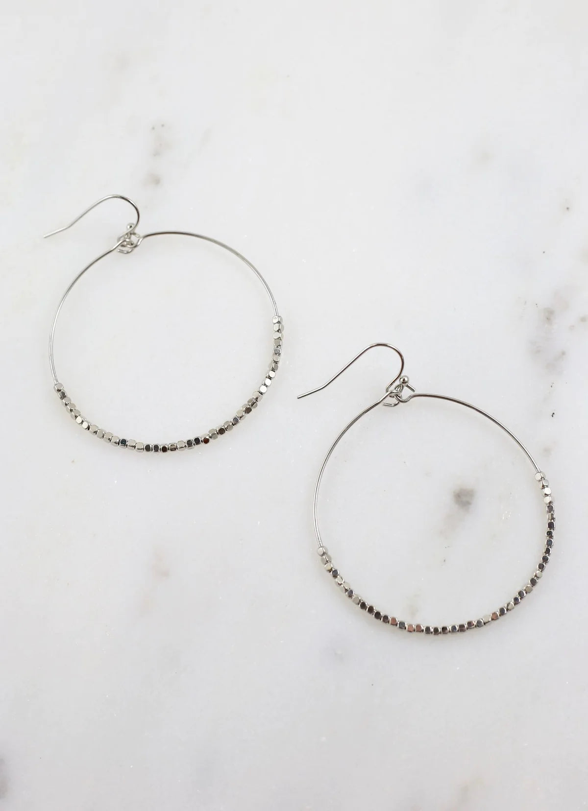 This shiny silver open circle earring is always a customer favorite style! It features square metal beads on a fish hook back.