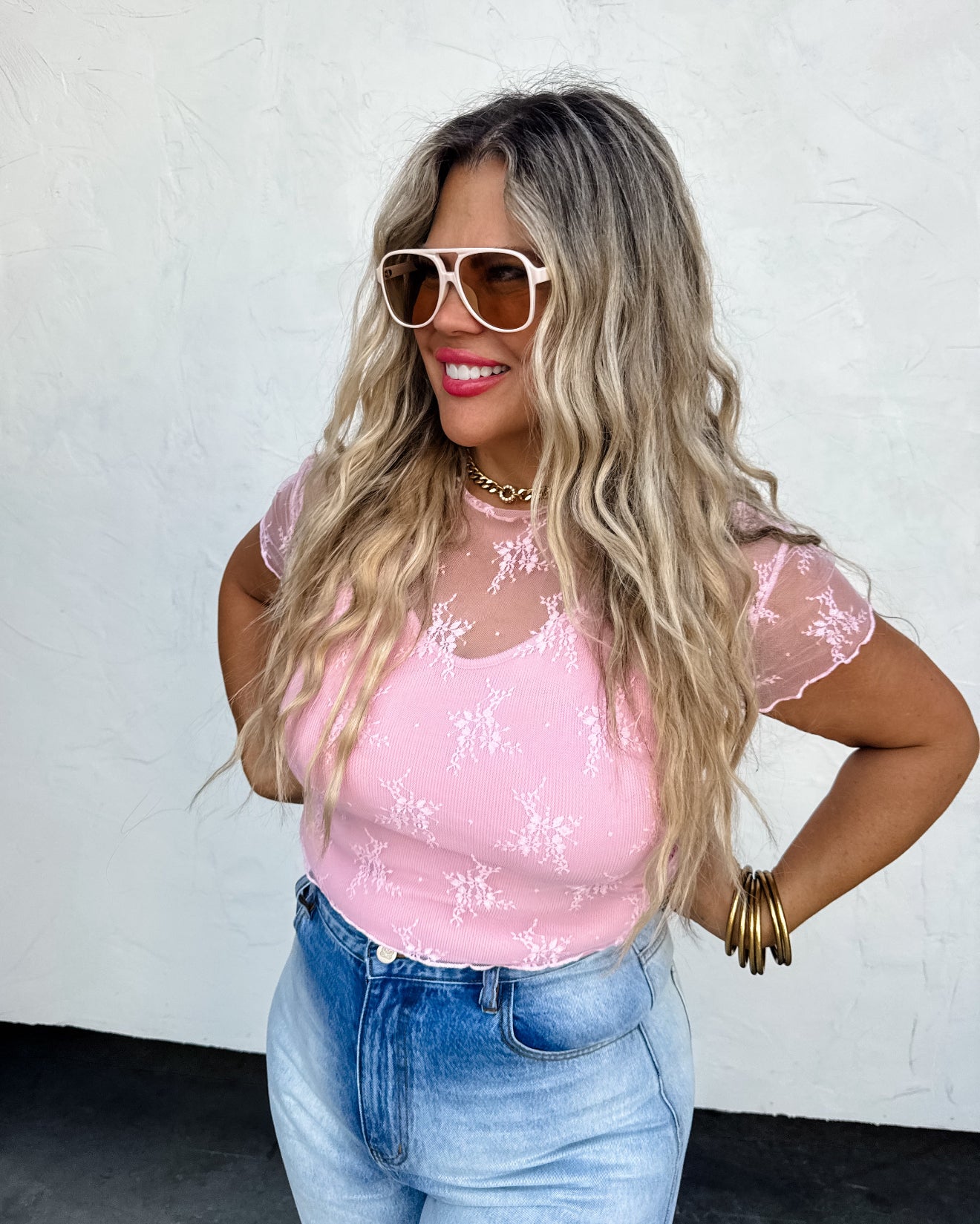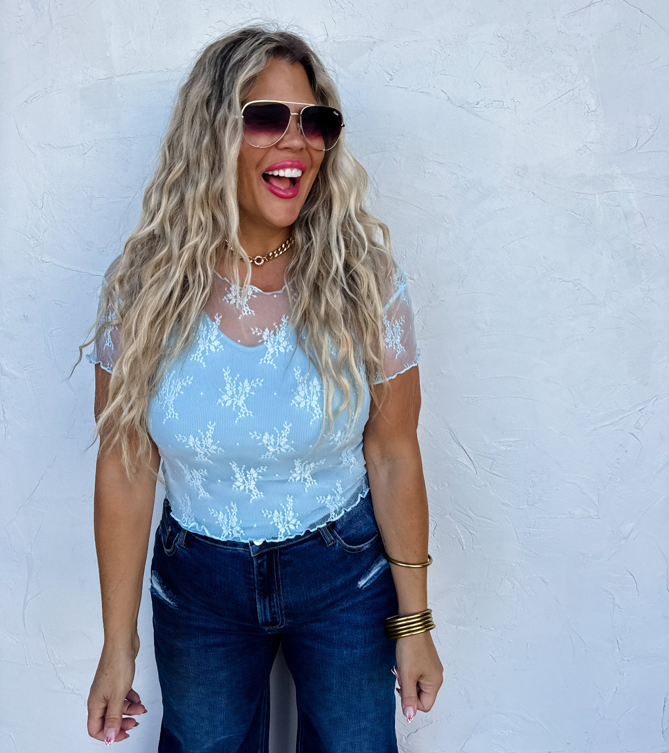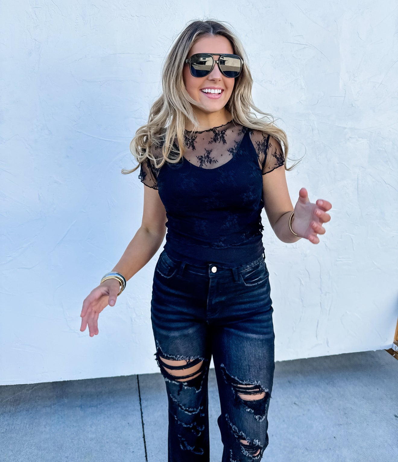 One of our best selling lace tops, now in SHORT SLEEVE! Super cute for layering, this sultry stretchy lacey mesh long-sleeve top features a totally sheer design with floral lace embroidery. Dainty mock neck and thumbhole details. Relaxed fit with a fluttery hemline.