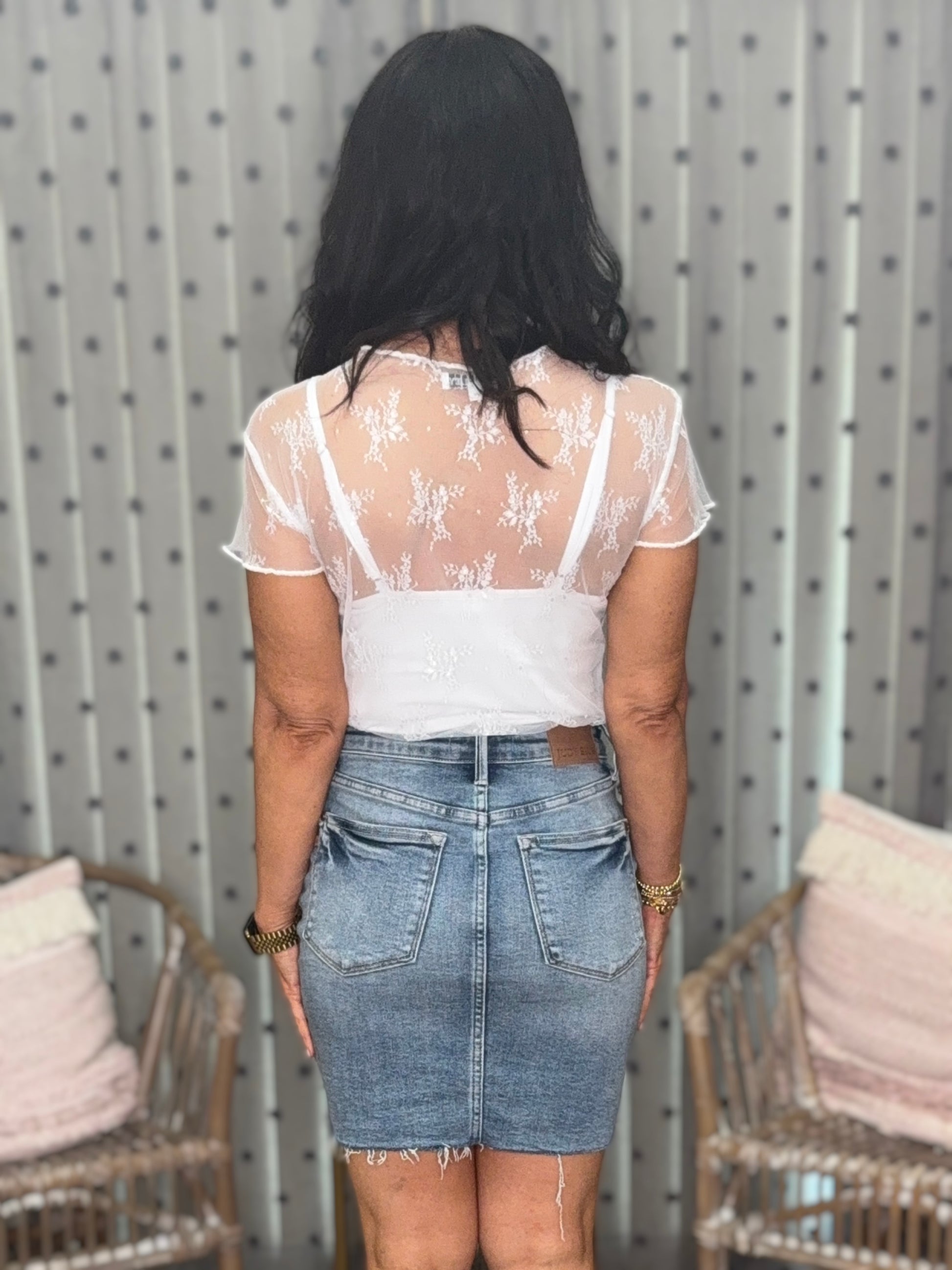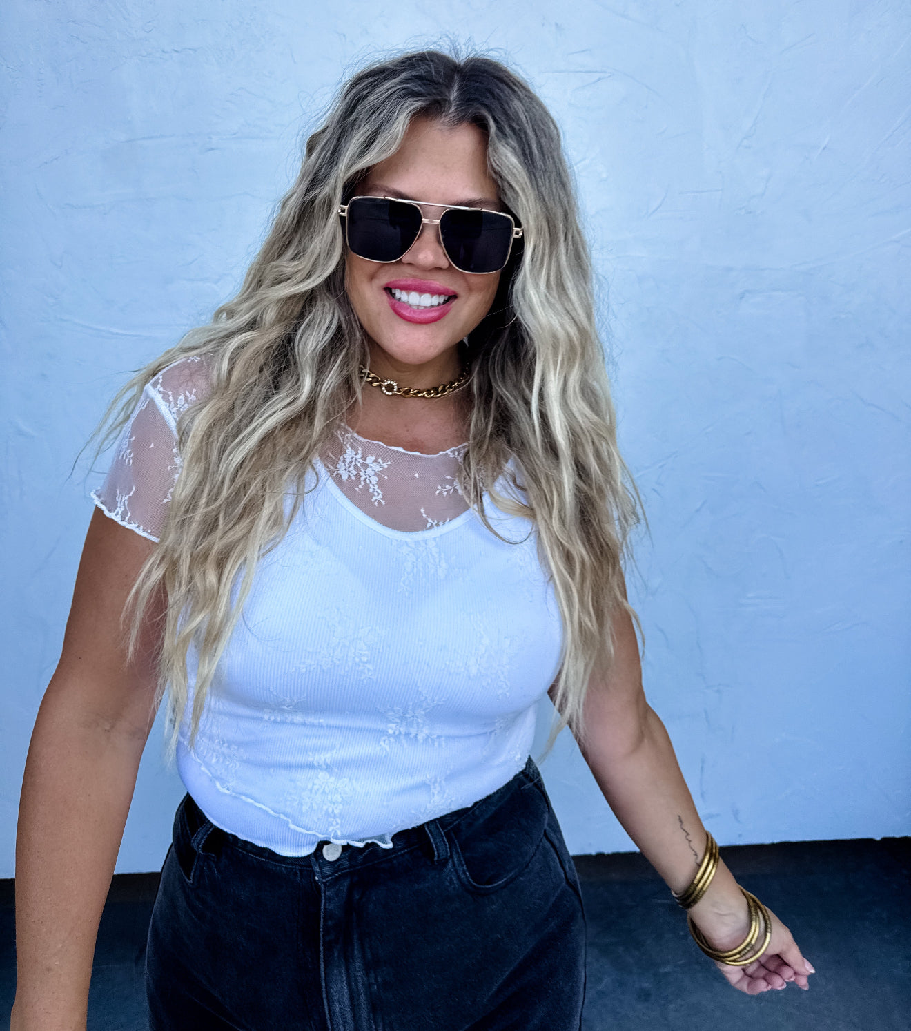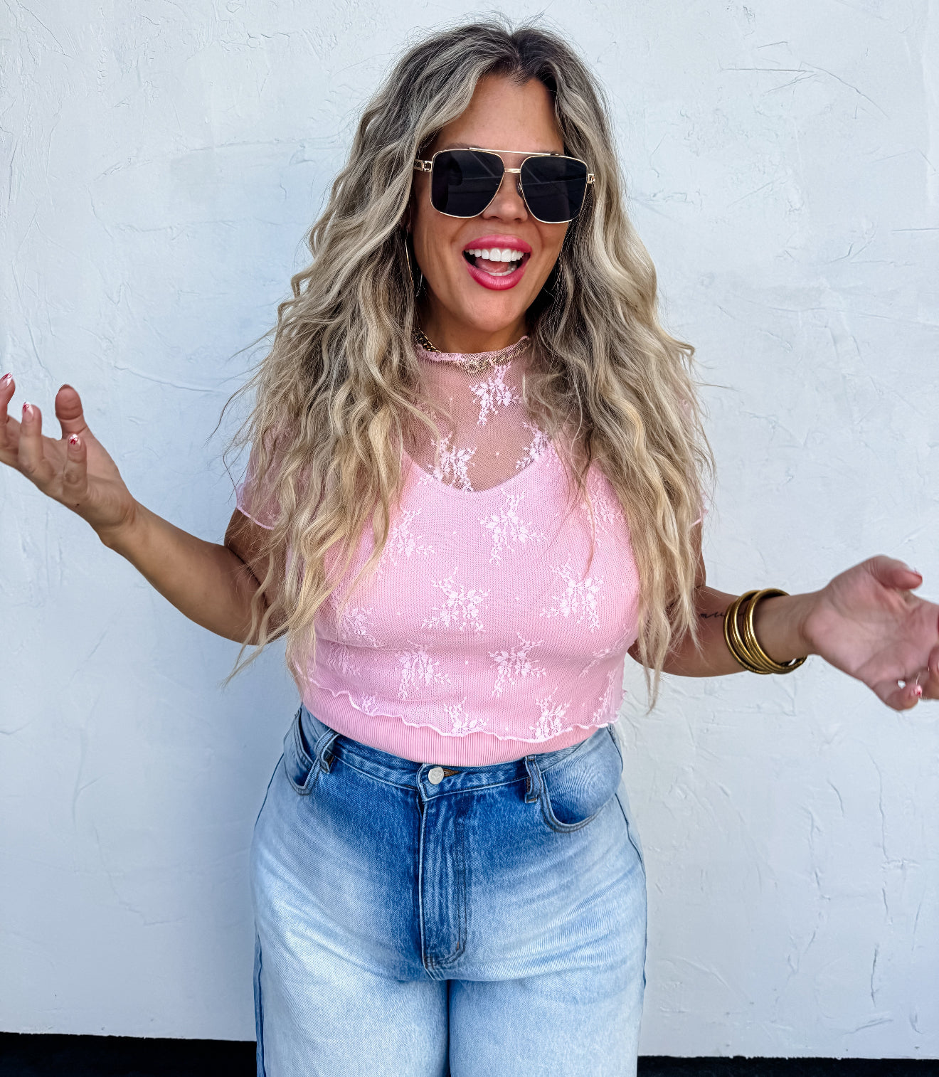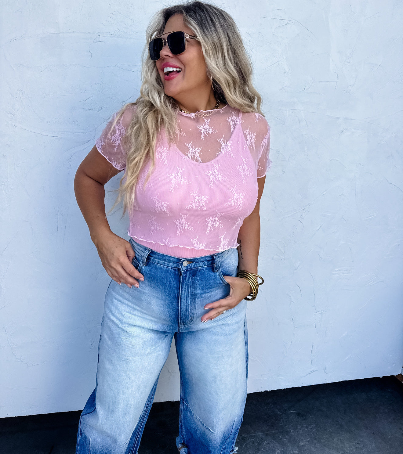 One of our best selling lace tops, now in SHORT SLEEVE! Super cute for layering, this sultry stretchy lacey mesh long-sleeve top features a totally sheer design with floral lace embroidery. Dainty mock neck and thumbhole details. Relaxed fit with a fluttery hemline.