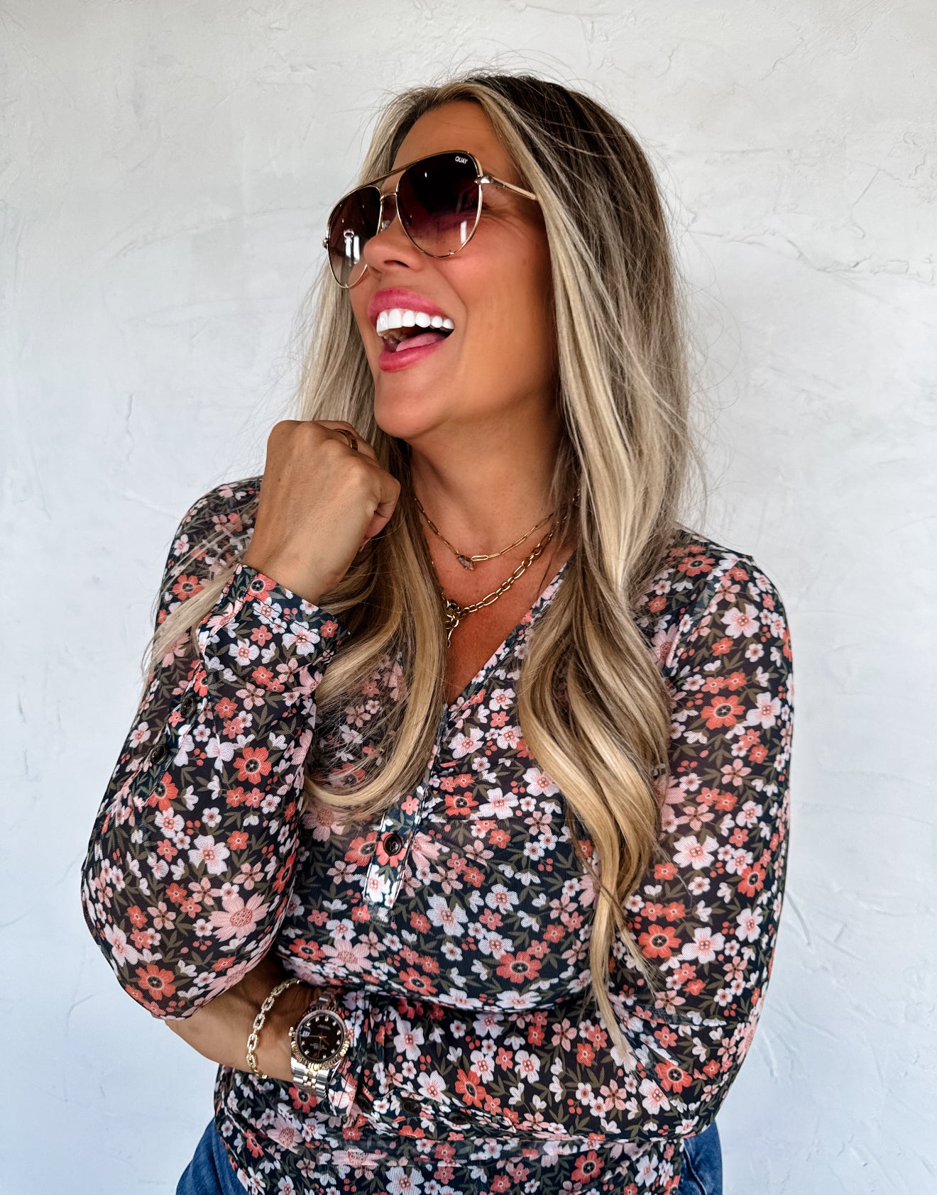 Super cute for layering, our new VNECK mesh tops are sultry and stretchy. Features long-sleeve with button detail neck and cuffs and are a totally sheer design. Perfect worn alone or paired under your favorite cardigan, meg poncho or sweater!