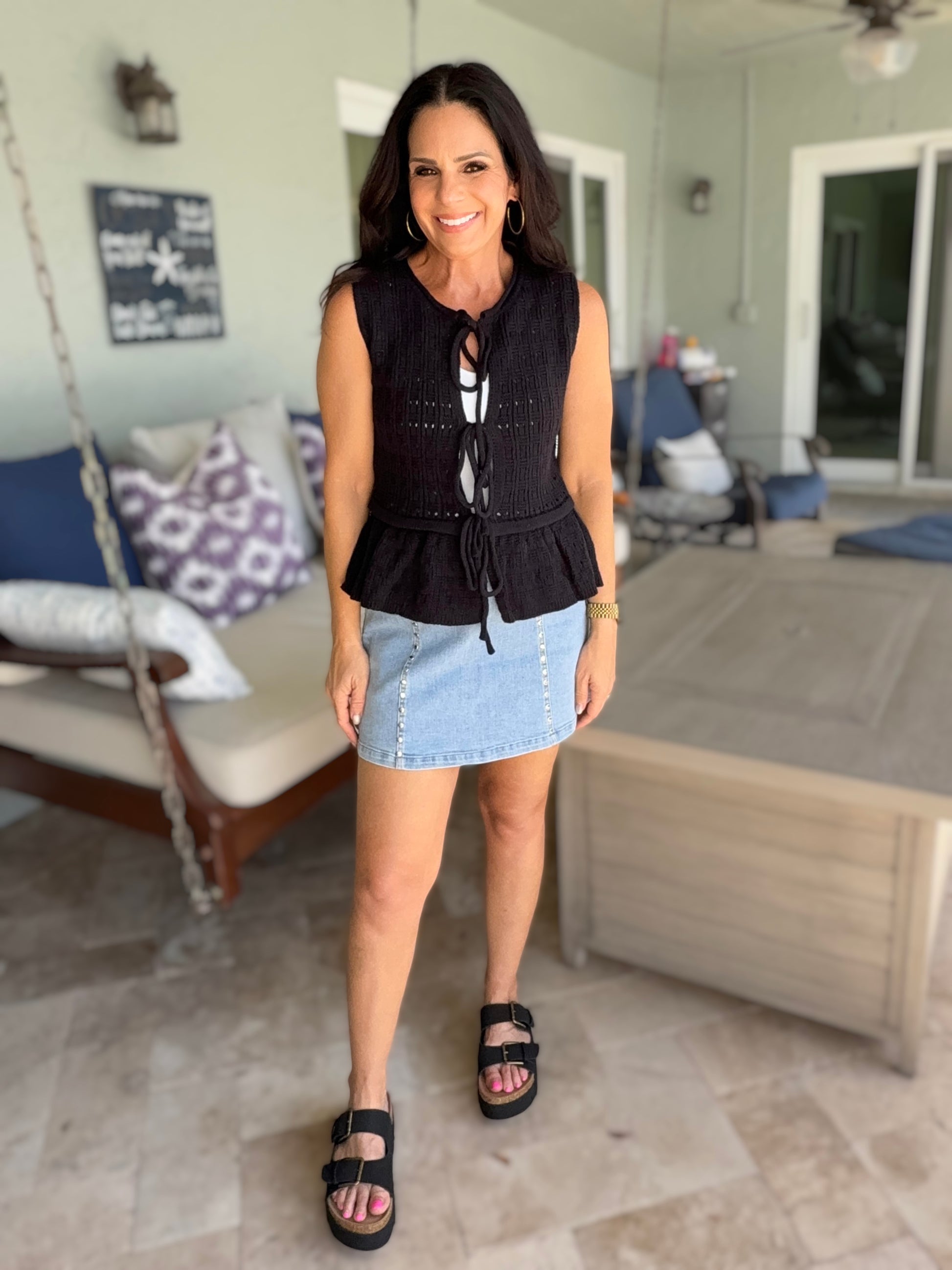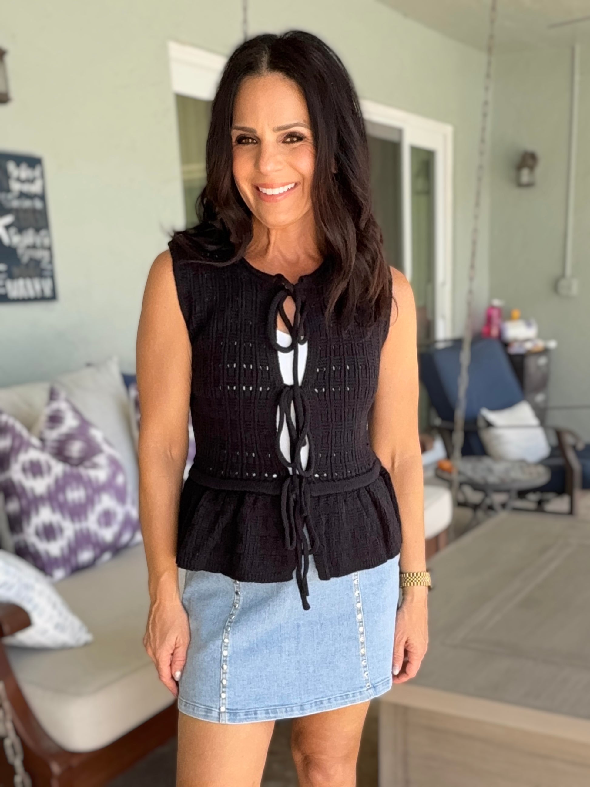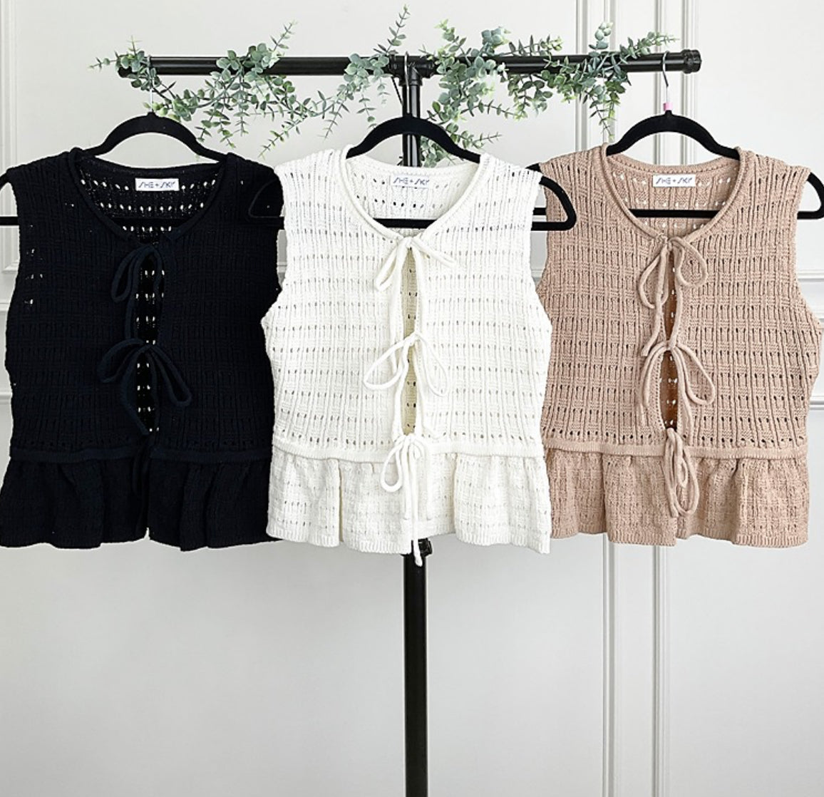 A chic blend of elegance and comfort, this sleeveless sweater vest features a stylish front tie and a playful ruffled hem for a feminine touch. Crafted from a soft, lightweight knit, it drapes beautifully while providing a cozy feel. The versatile design makes it perfect for layering over tanks, blouses, or dresses. Available in three timeless shades—classic black for a sleek look, off-white for effortless sophistication, and taupe for a warm, neutral appeal. Whether dressed up or down, this vest adds a refined yet relaxed charm to any outfit.