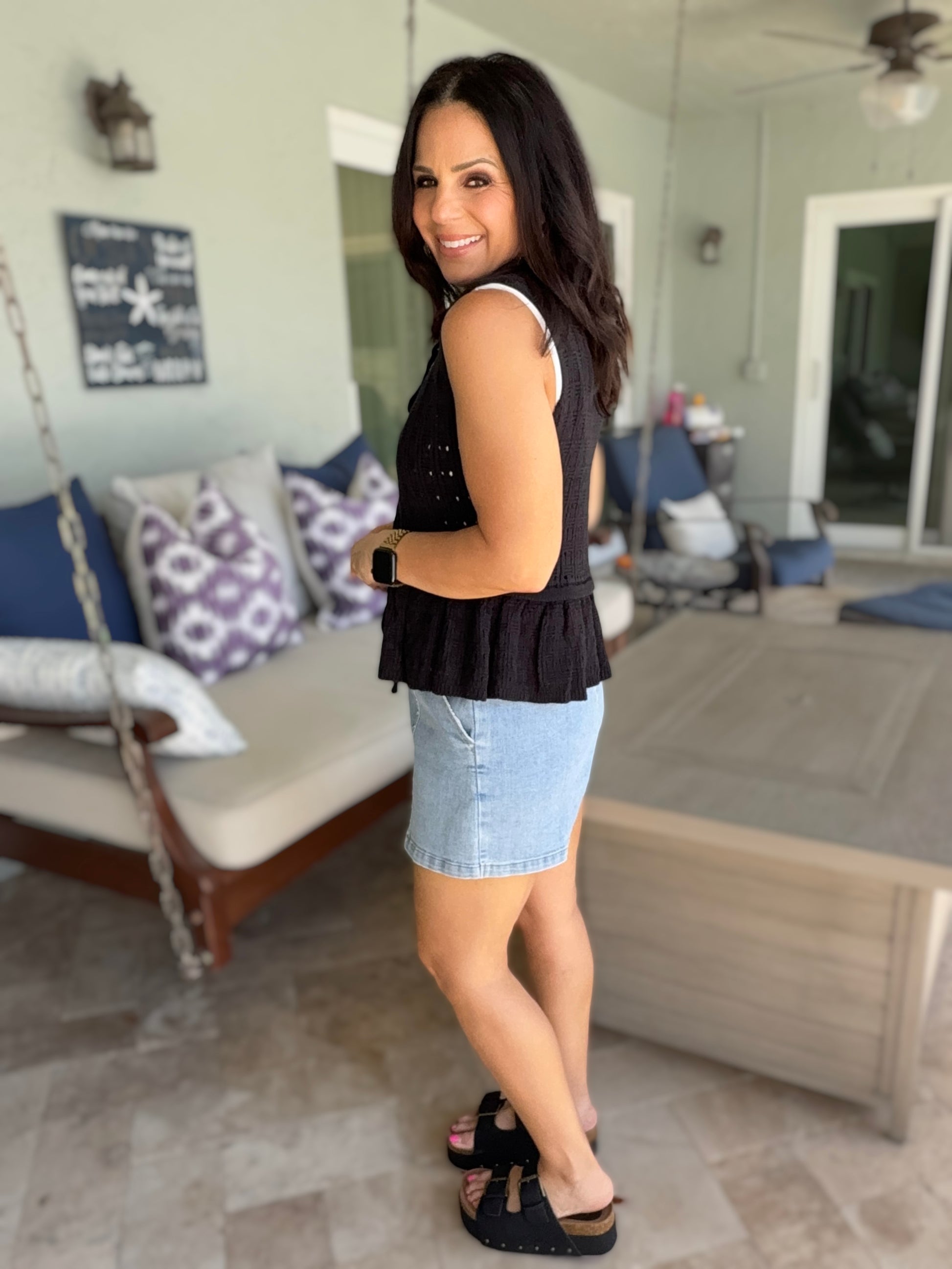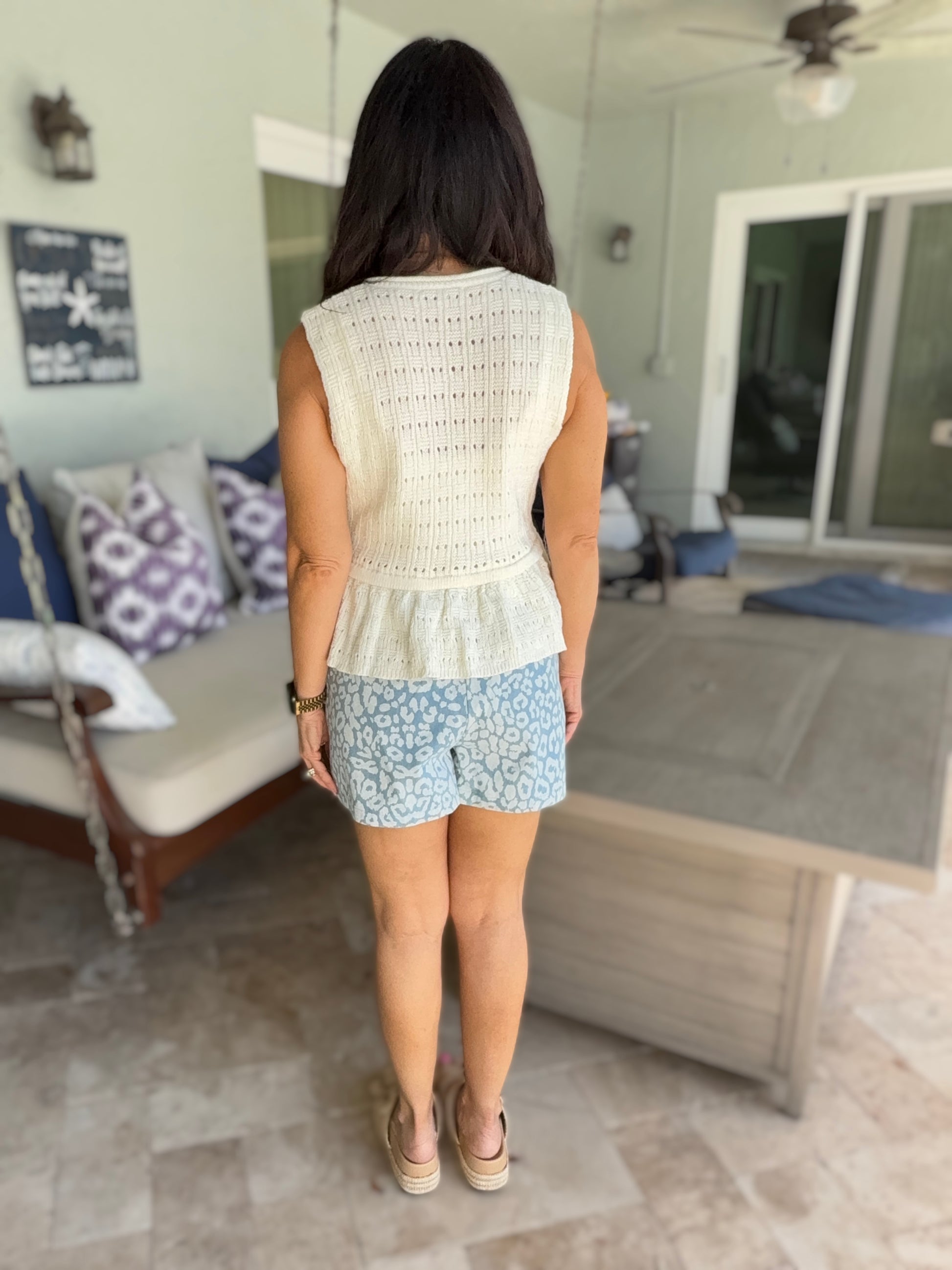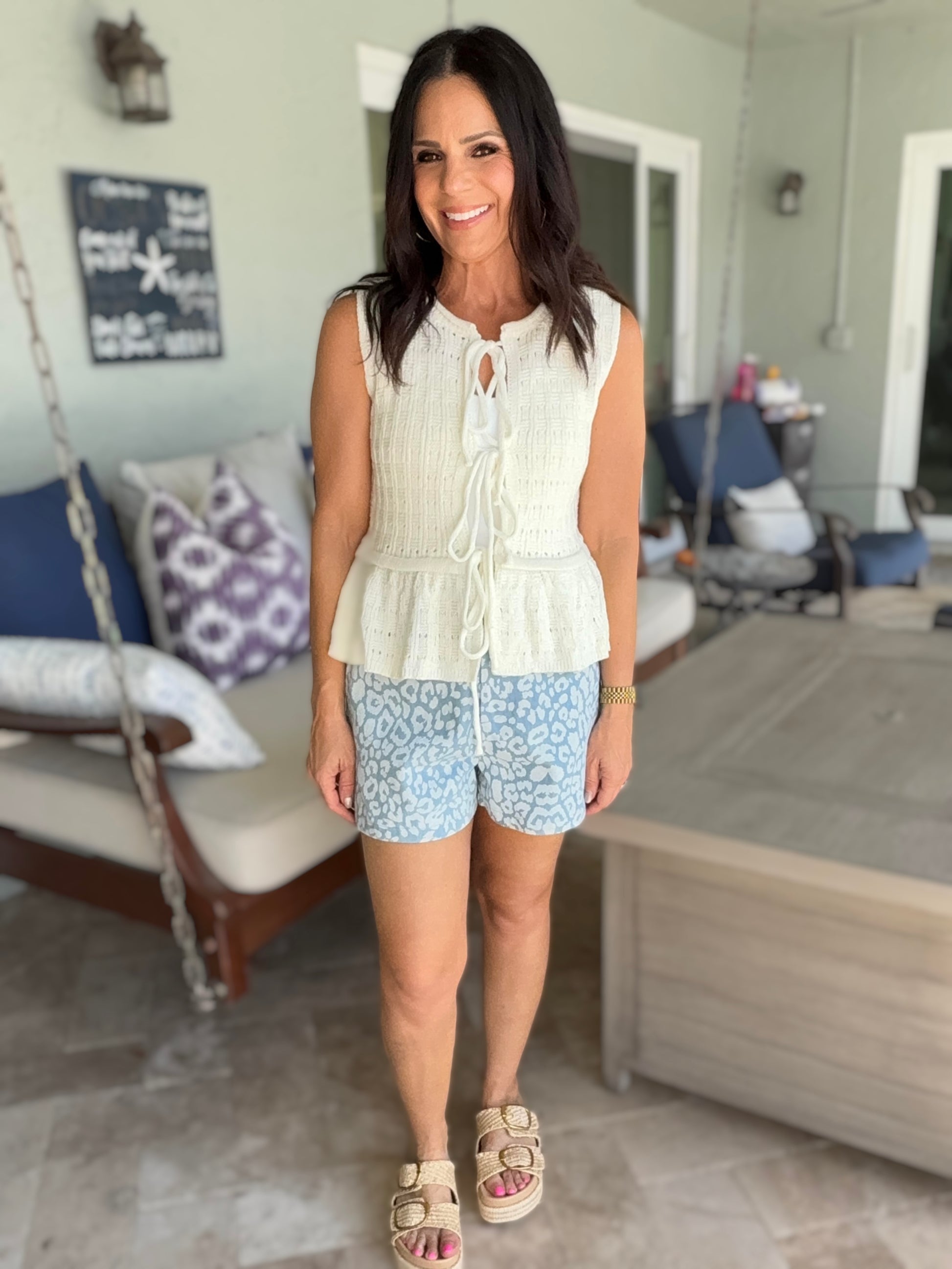 A chic blend of elegance and comfort, this sleeveless sweater vest features a stylish front tie and a playful ruffled hem for a feminine touch. Crafted from a soft, lightweight knit, it drapes beautifully while providing a cozy feel. The versatile design makes it perfect for layering over tanks, blouses, or dresses. Available in three timeless shades—classic black for a sleek look, off-white for effortless sophistication, and taupe for a warm, neutral appeal. Whether dressed up or down, this vest adds a refined yet relaxed charm to any outfit.