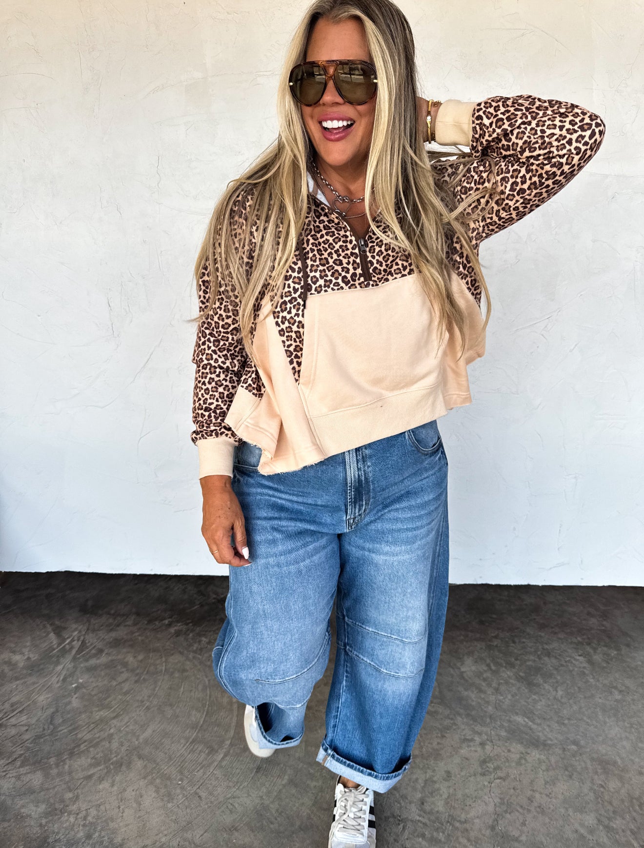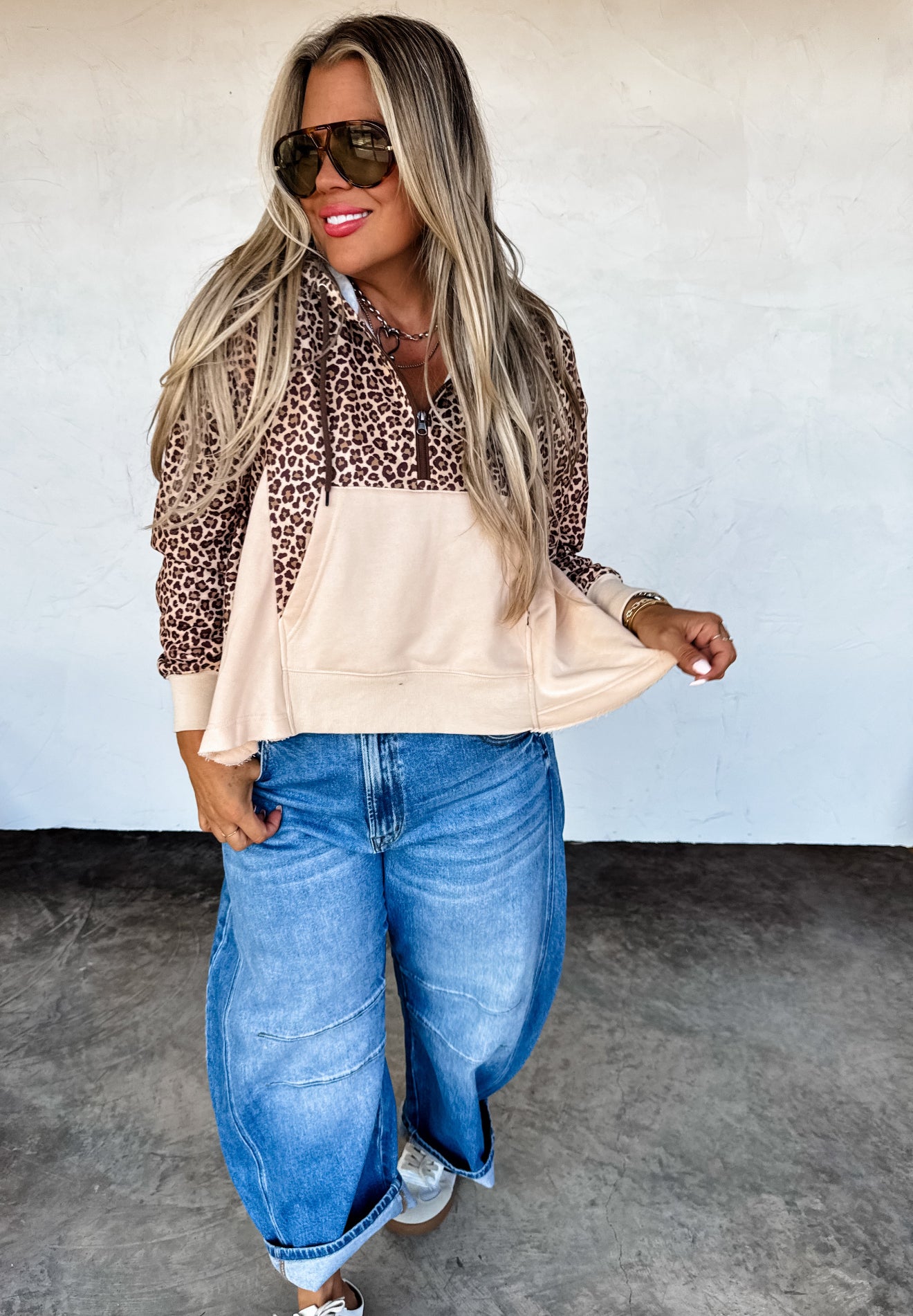 This half-zip hoodie pullover features a relaxed, swing-style fit. With a super soft texture, roomy hood, kangaroo pockets, and an easy half-zip neckline, it’s the perfect throw-on layer for effortless everyday style.