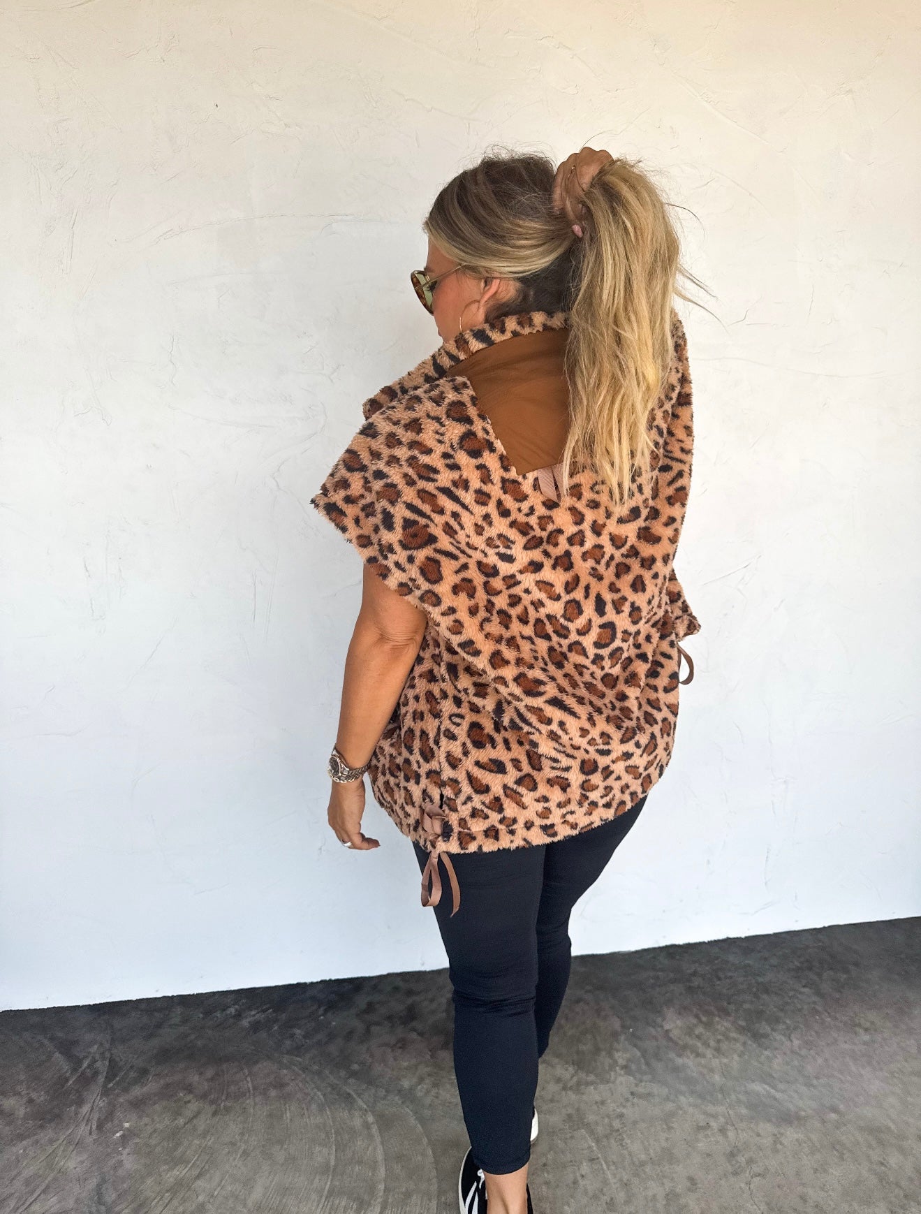 These stylish vests feature bold colors and prints in soft, plush faux fur sherpa, giving it a cozy and luxurious look. It has a high collar and longer cap sleeve design with snap button closures down the front. Also features side pockets and side tie strings for cinching or wearing shorter if preferred. Perfect for layering, it adds a fun, fashionable edge to any outfit.