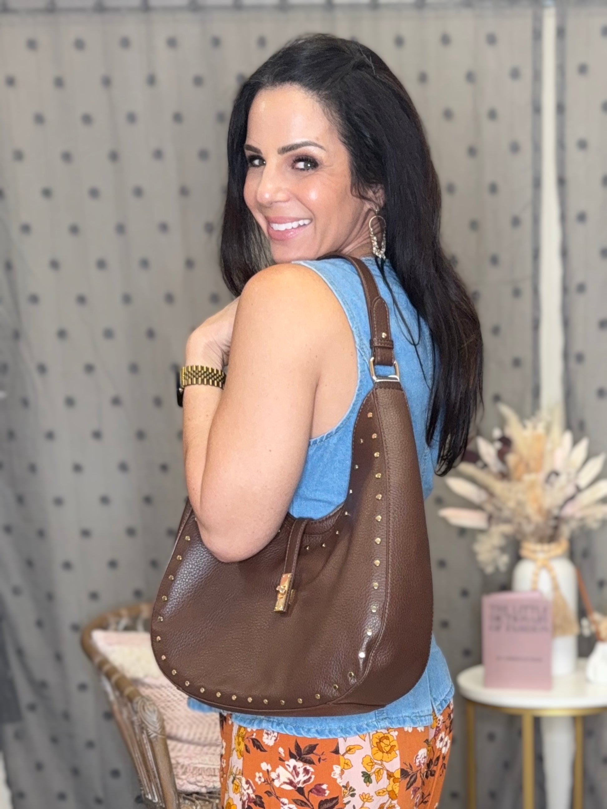 Introducing a hobo bag that effortlessly blends edge with elegance, crafted from pebbled vegan leather. The exterior boasts stud embellishments and gold hardware, while the turn lock loop closure adds a touch of sophistication. Inside, a printed fabric lining, one zip pocket, and two slip pockets ensure your essentials are stylishly organized.