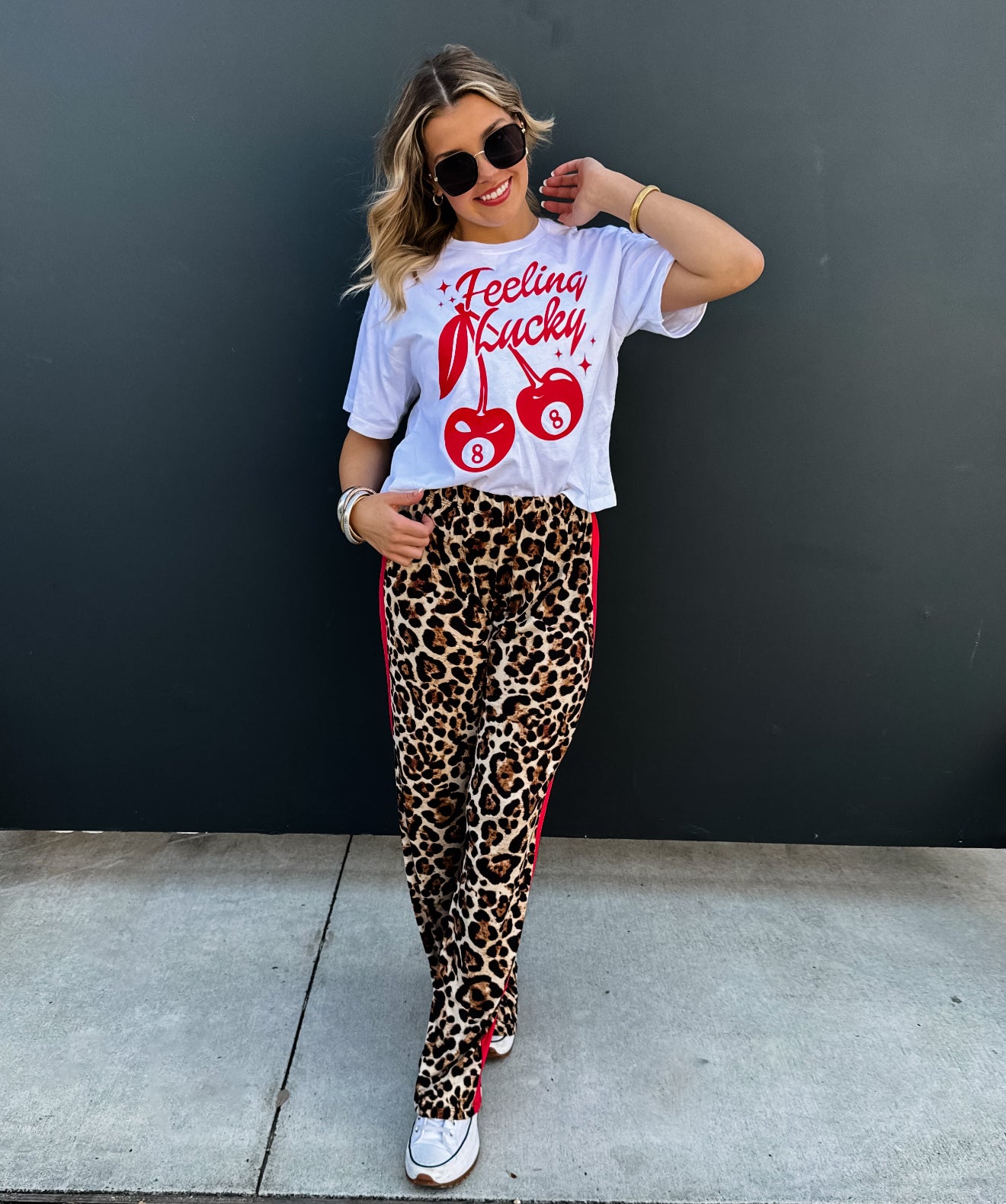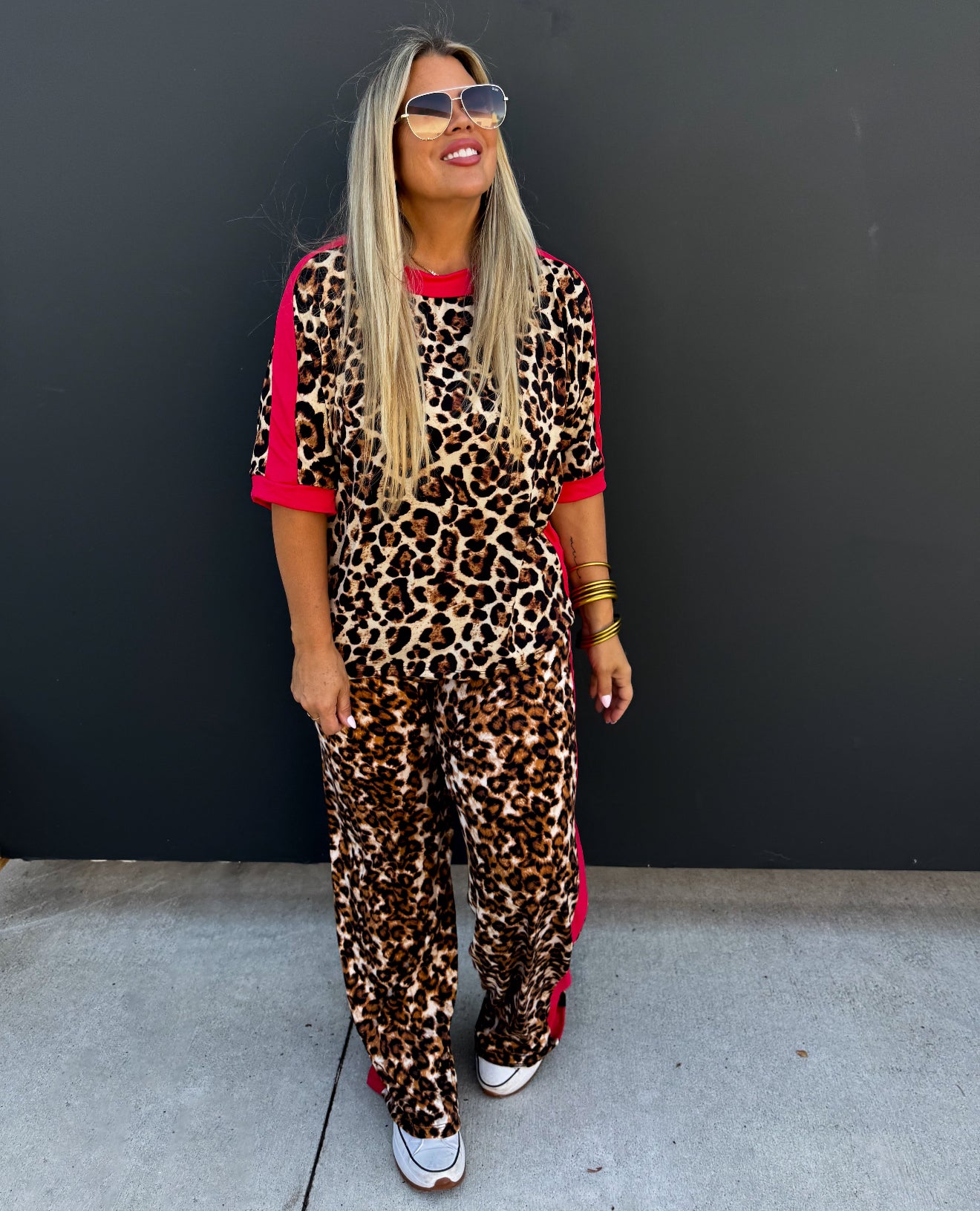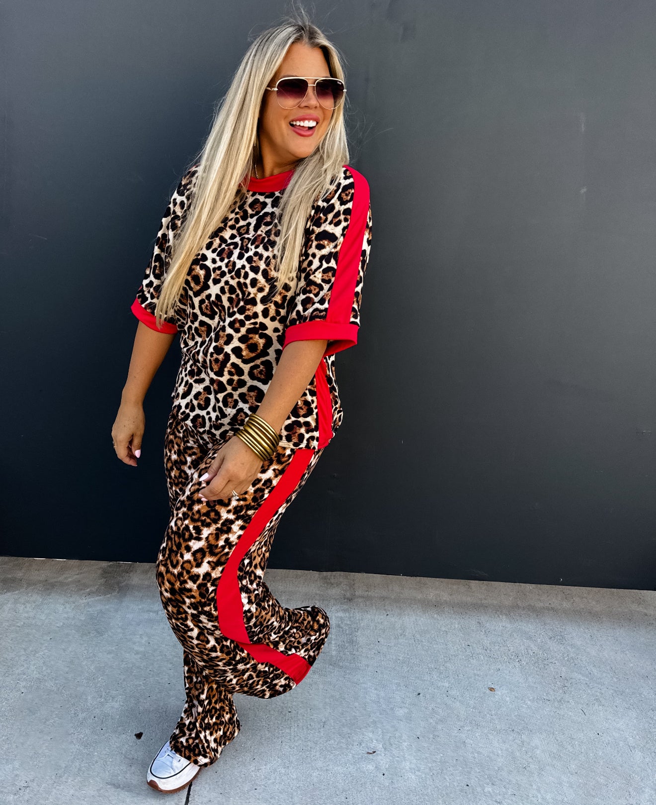 Introducing our Wild Heart Cheetah Pants!  So on trendy and such a fun red stripe flare added to the side!  Features side pockets. So stretchy and soft!