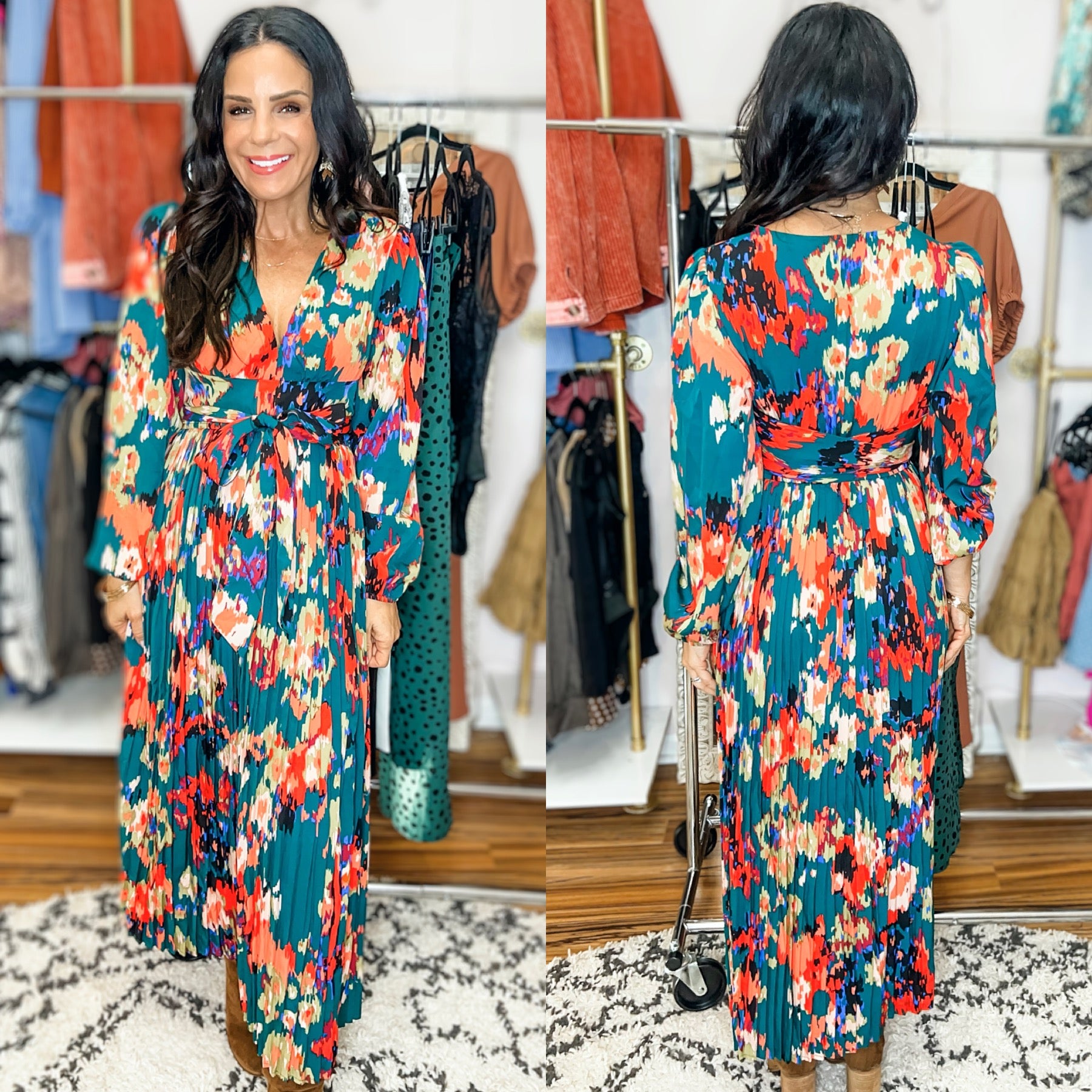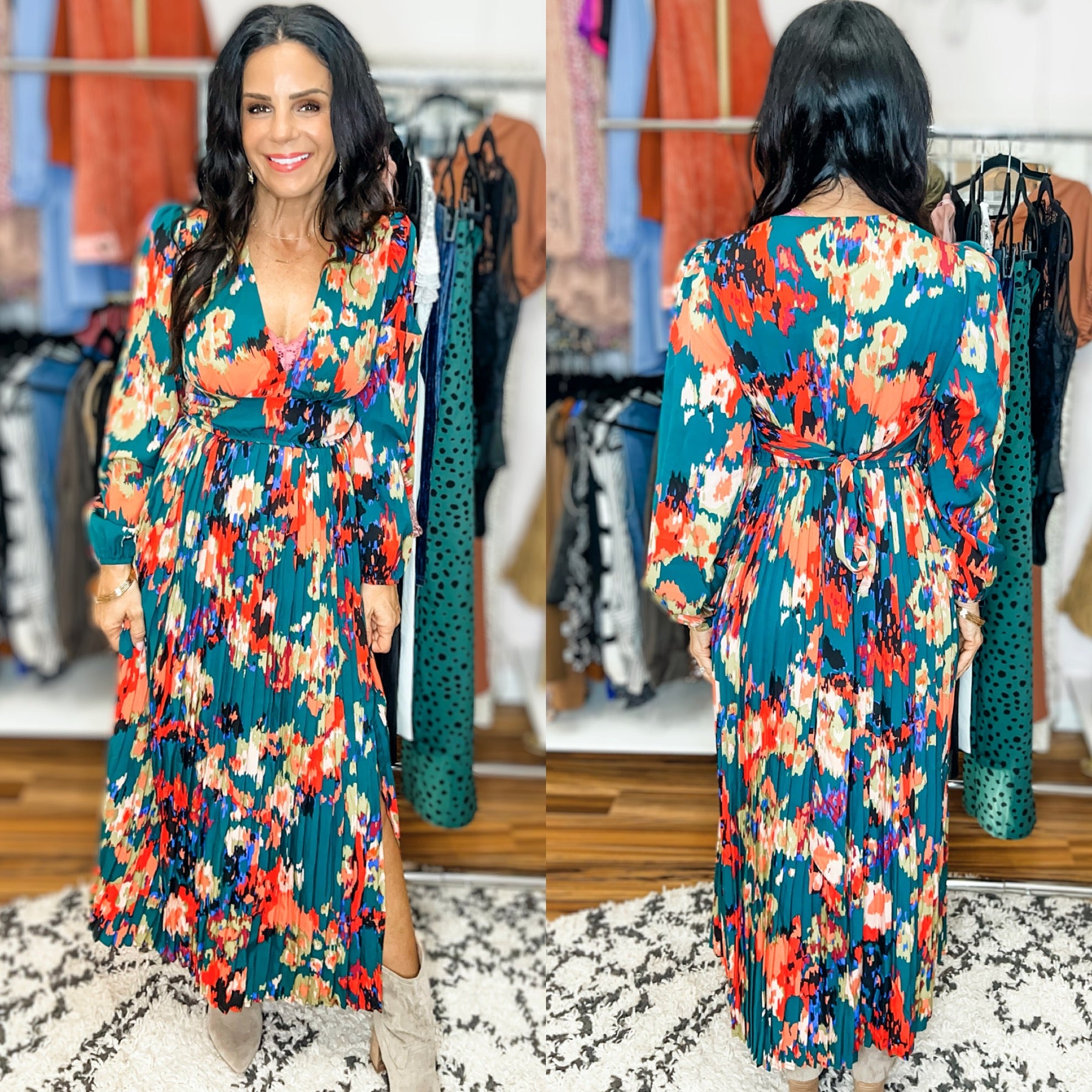 Meet the Winston, a stunning multicolored dress with a dark teal green background.  Features a deep V-neckline.  Simply add a bralette under if you prefer a more modest front.  Maxi length pleated skirt with a slit on the left side, and an attached belt which you can tie in the front or the back.  Shoulders have a slight puff and long sleeves with elastic at the wrists.  Overall, a very luxe look and feel! Material is not stretchy, so if you have a larger bust or are between sizes, size up.