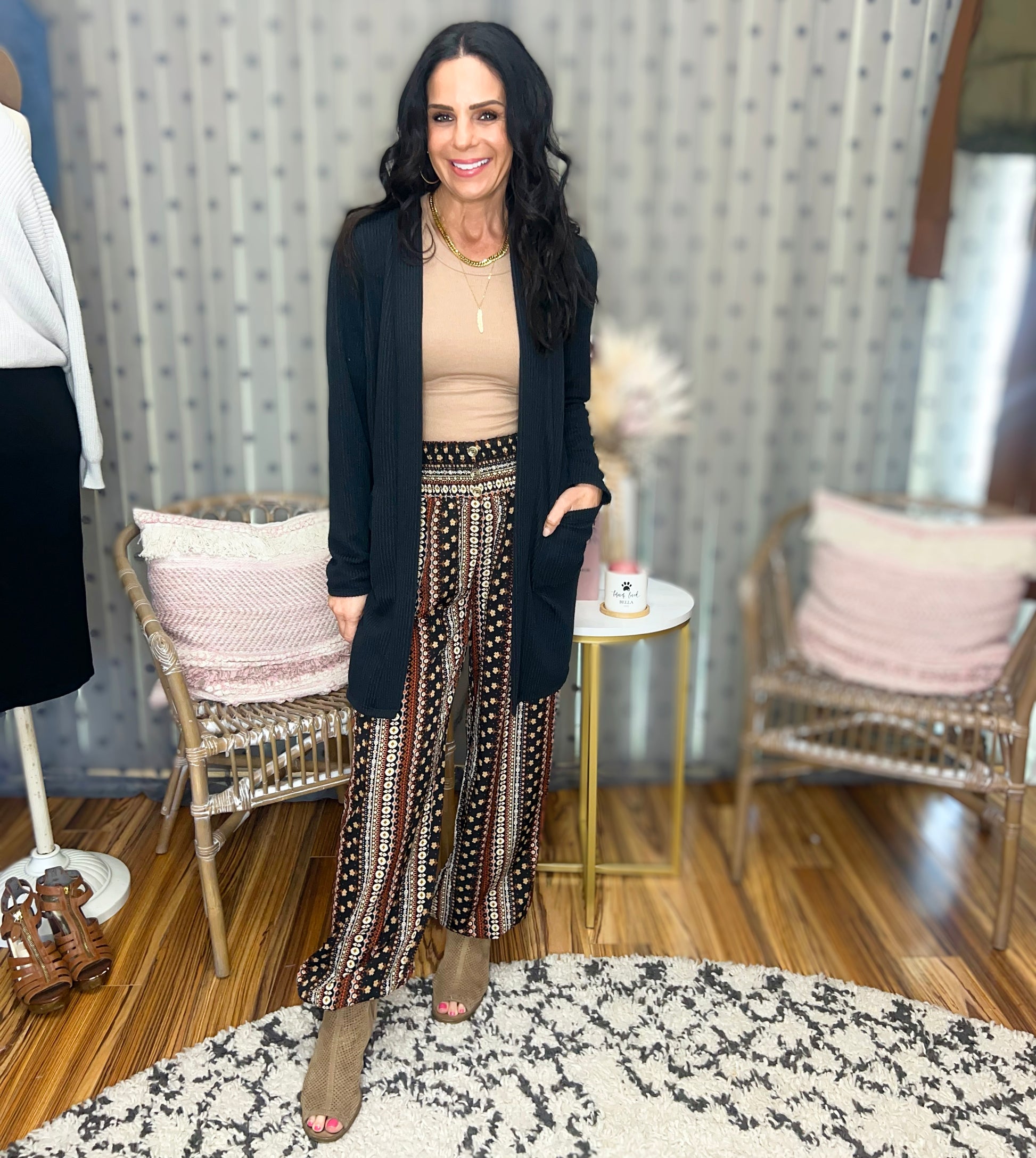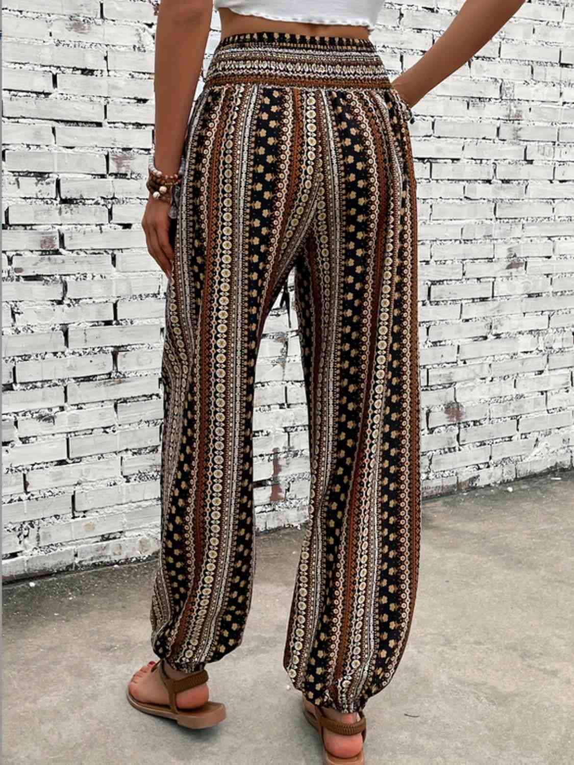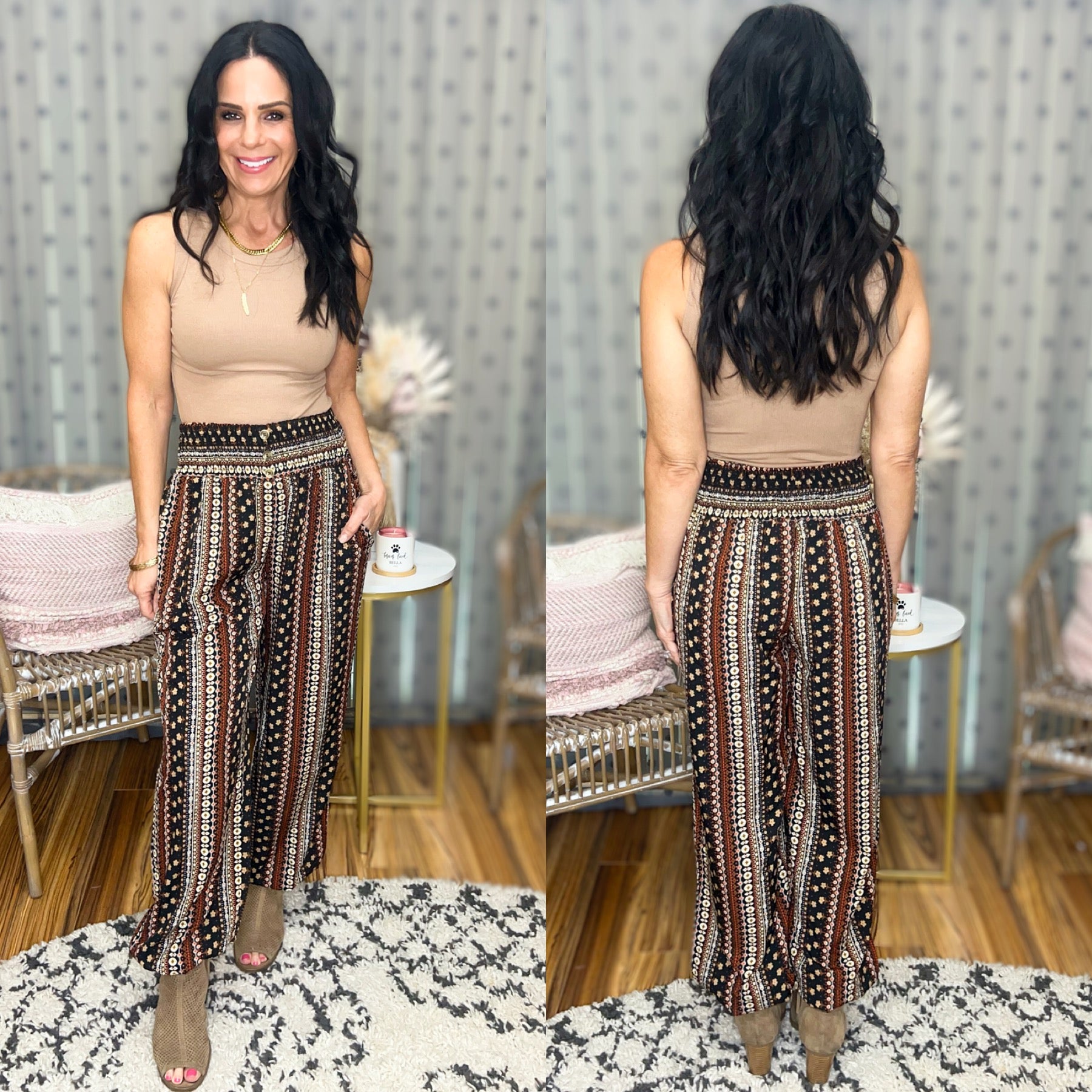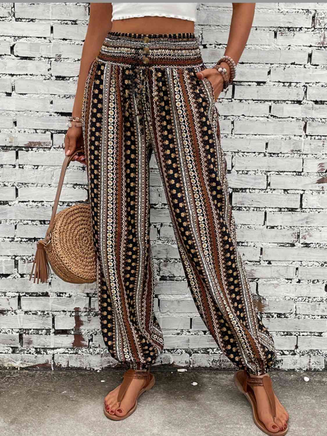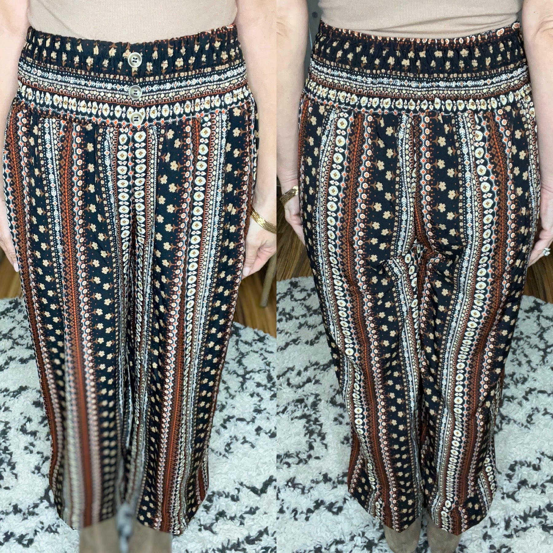 Meet the Whitney, a boho-inspired pair of pants featuring a smocked waist with decorative buttons, side pockets and elastic at the ankles.  The print features colors perfect for Fall, including black, white, tans, browns and reds.  Comes S-2XL.