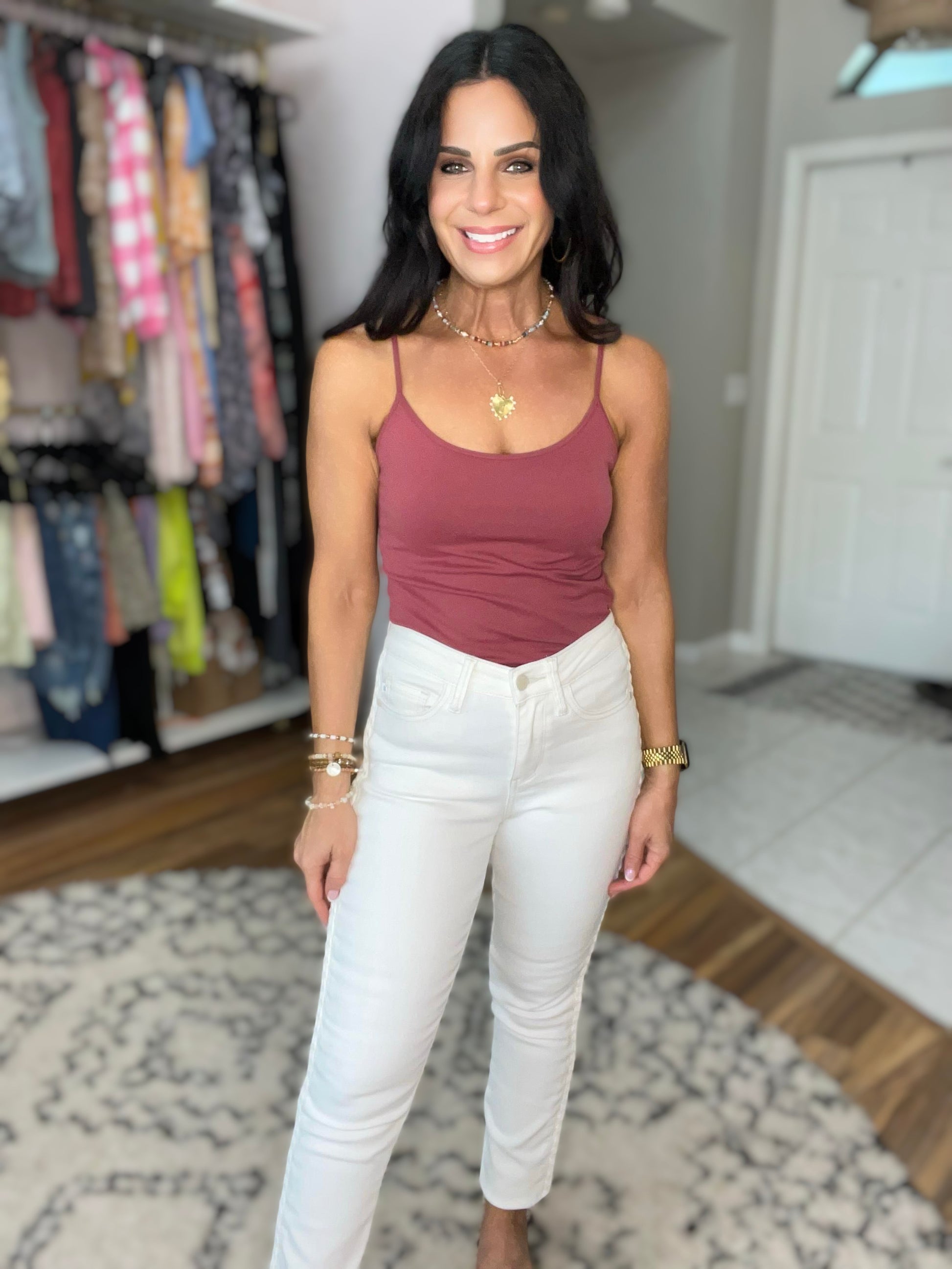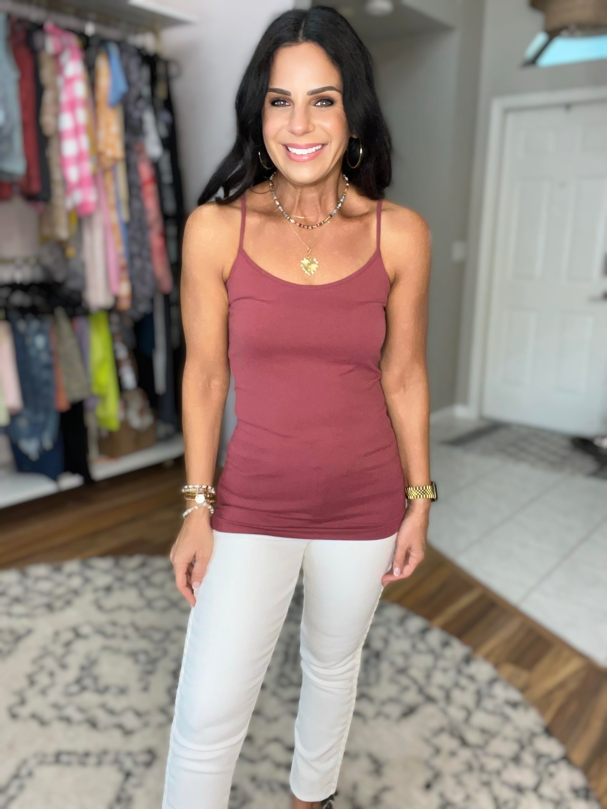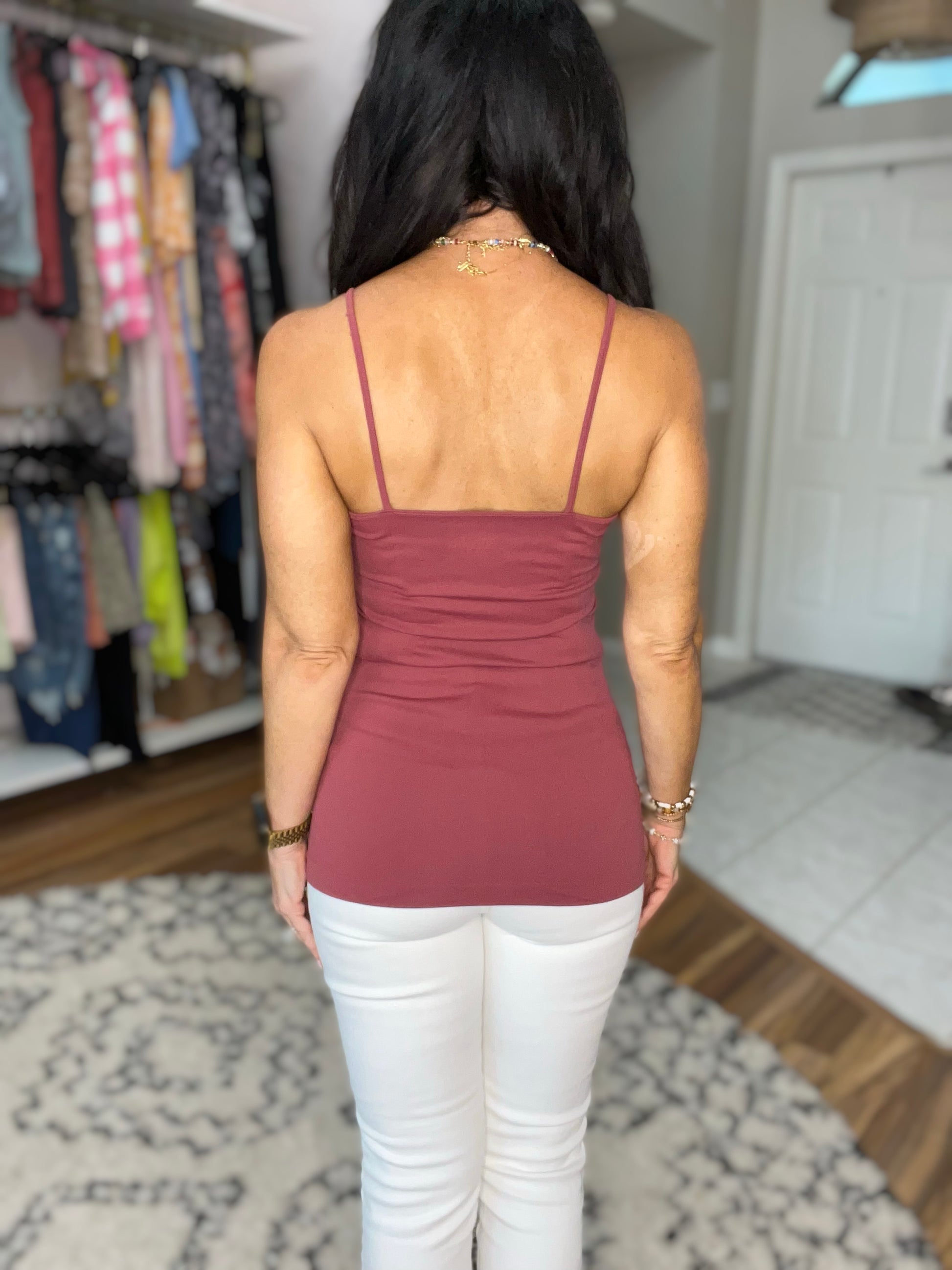 A solid seamless cami tank with a slightly rounded neck, perfect for layering. Comes in a maroon and pewter.