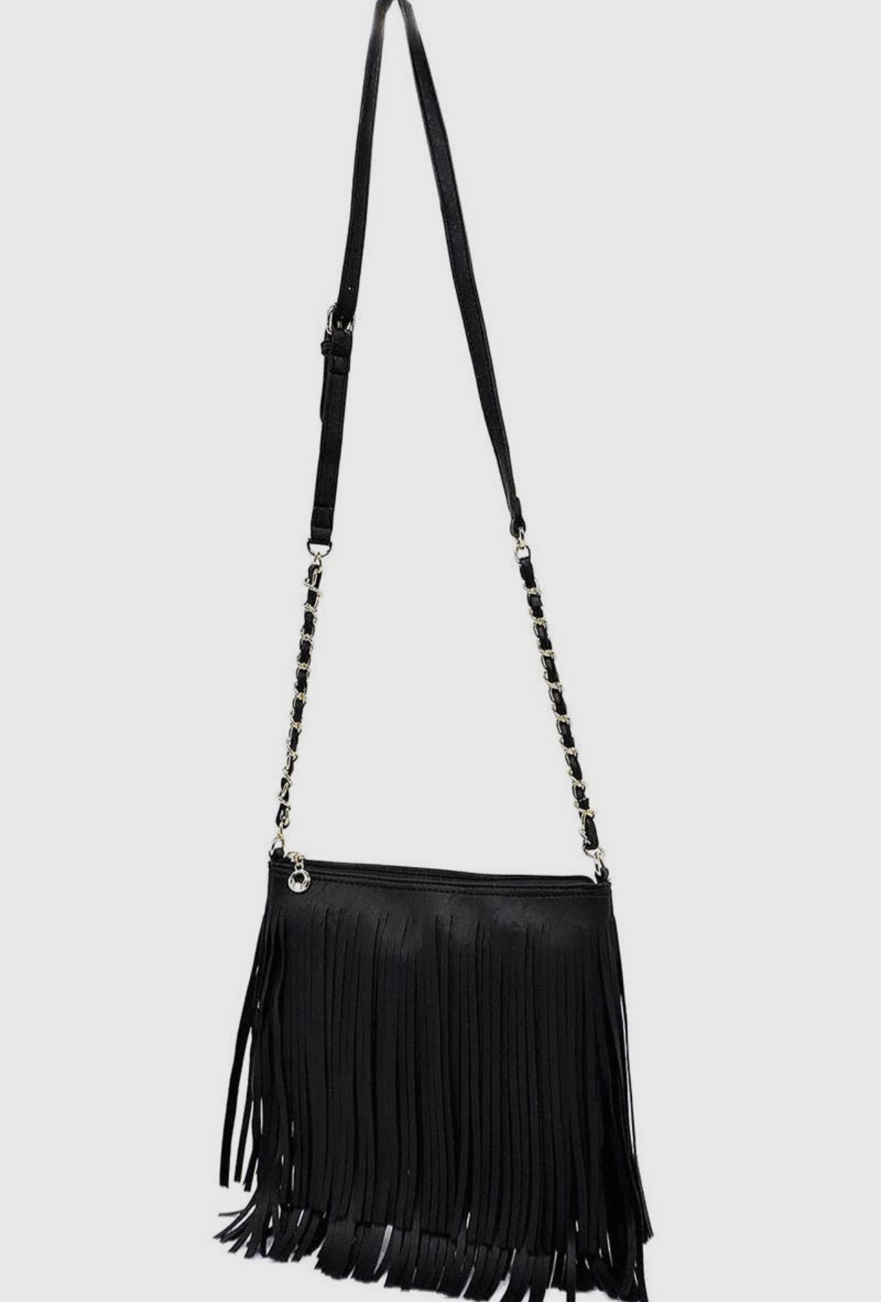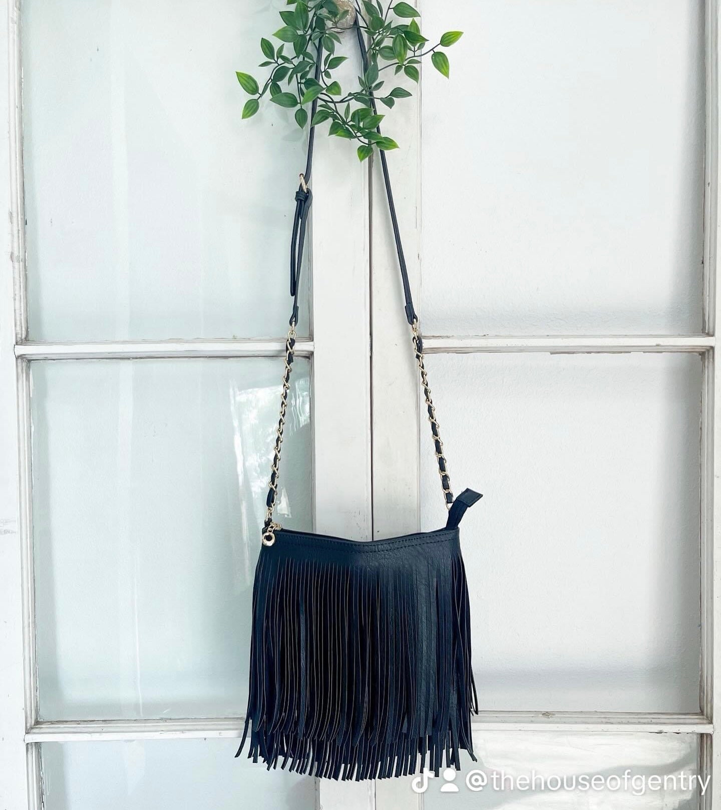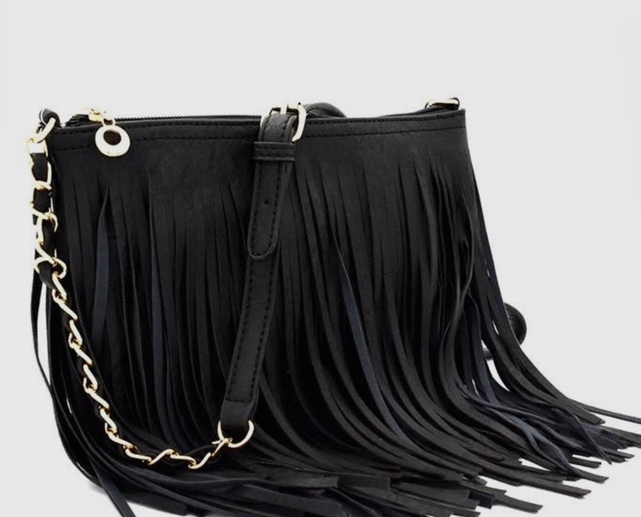 A boho girl’s dream. This fringe messenger bag is the perfect size and can be worn crossbody or over the shoulder. Interior has a black & white striped design with a zippered inner pocket and 2 small inner pouches.