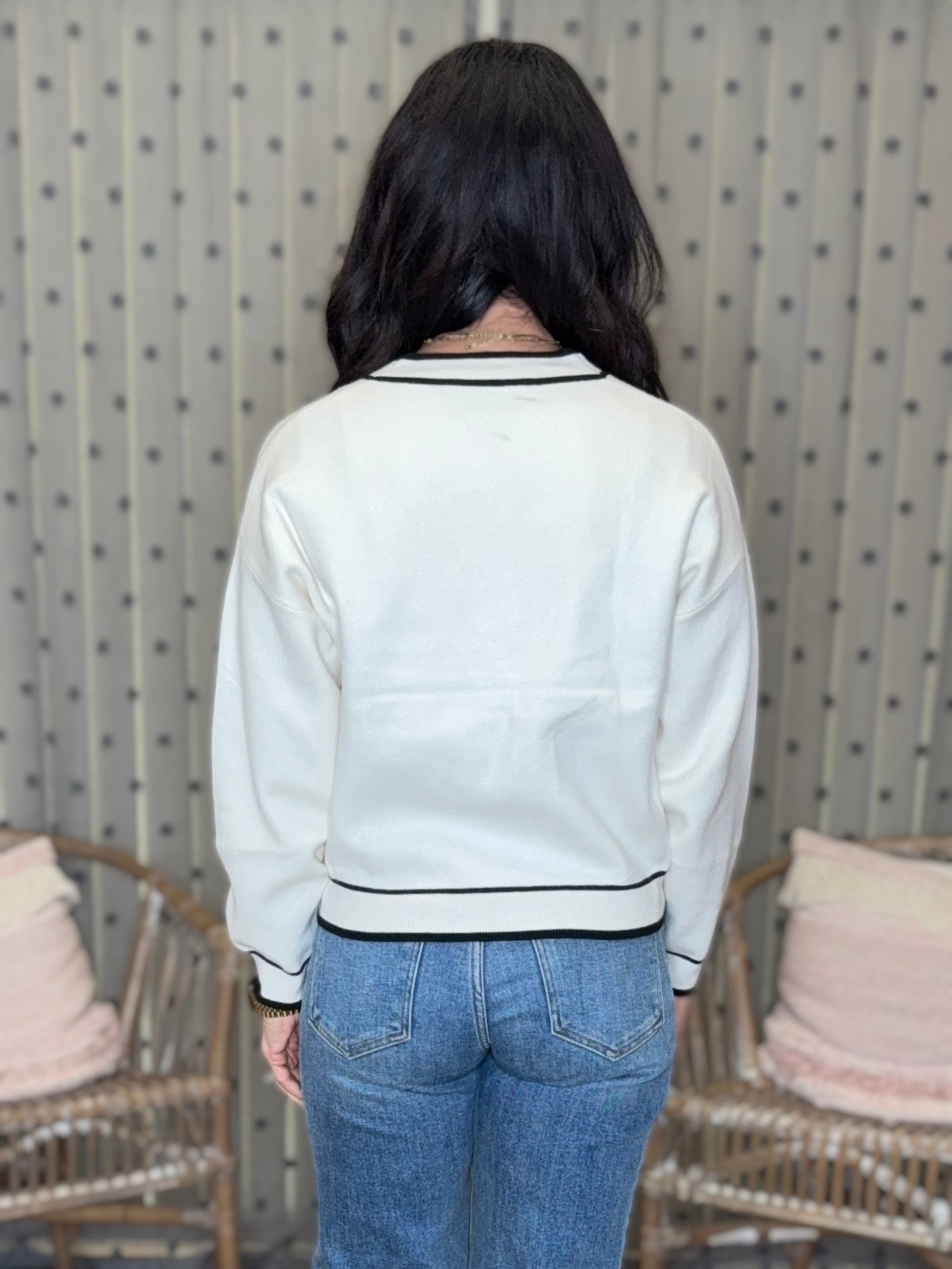 Chic, crisp, and totally timeless—the Uptown Cardigan gives classic prep a modern refresh. This soft knit sweater features a flattering cropped fit, bold black trim, and faux pocket detailing for that elevated, tailored vibe. Pair it with denim, trousers, or over a dress—it’s the ultimate wardrobe staple for year-round style.