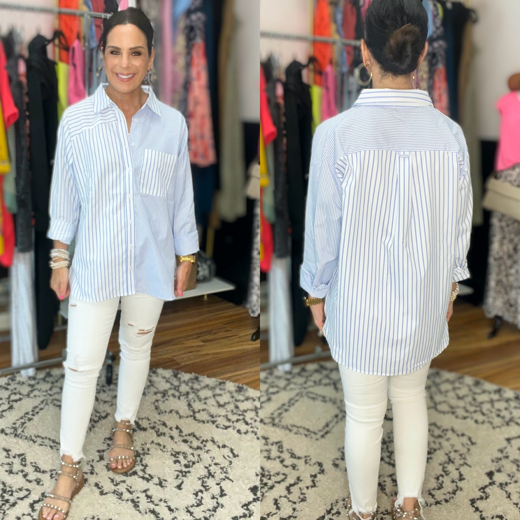 Score a style win with the This or That Striped Button Down. Made with woven poly for a lightweight, comfy feel. A collared neckline, front patch pocket, and front button closures add function and flair. Cuffed button sleeves, a side slit, and high low scooped hem bring a touch of whimsy. Back pleat detail for extra sass.