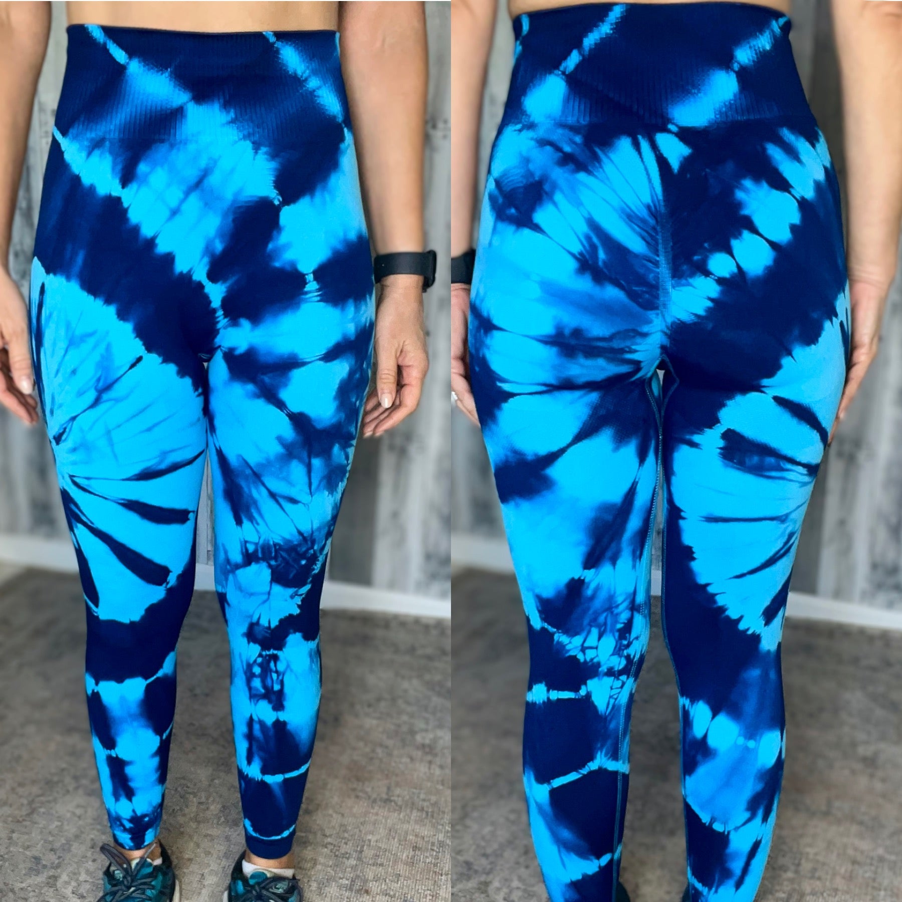 Meet the Tina, a two-piece athletic set in a bright aqua & navy tie-dye.  Top is a tank style with removable padding.  Pants are high-waisted with a thick yoga waistband.