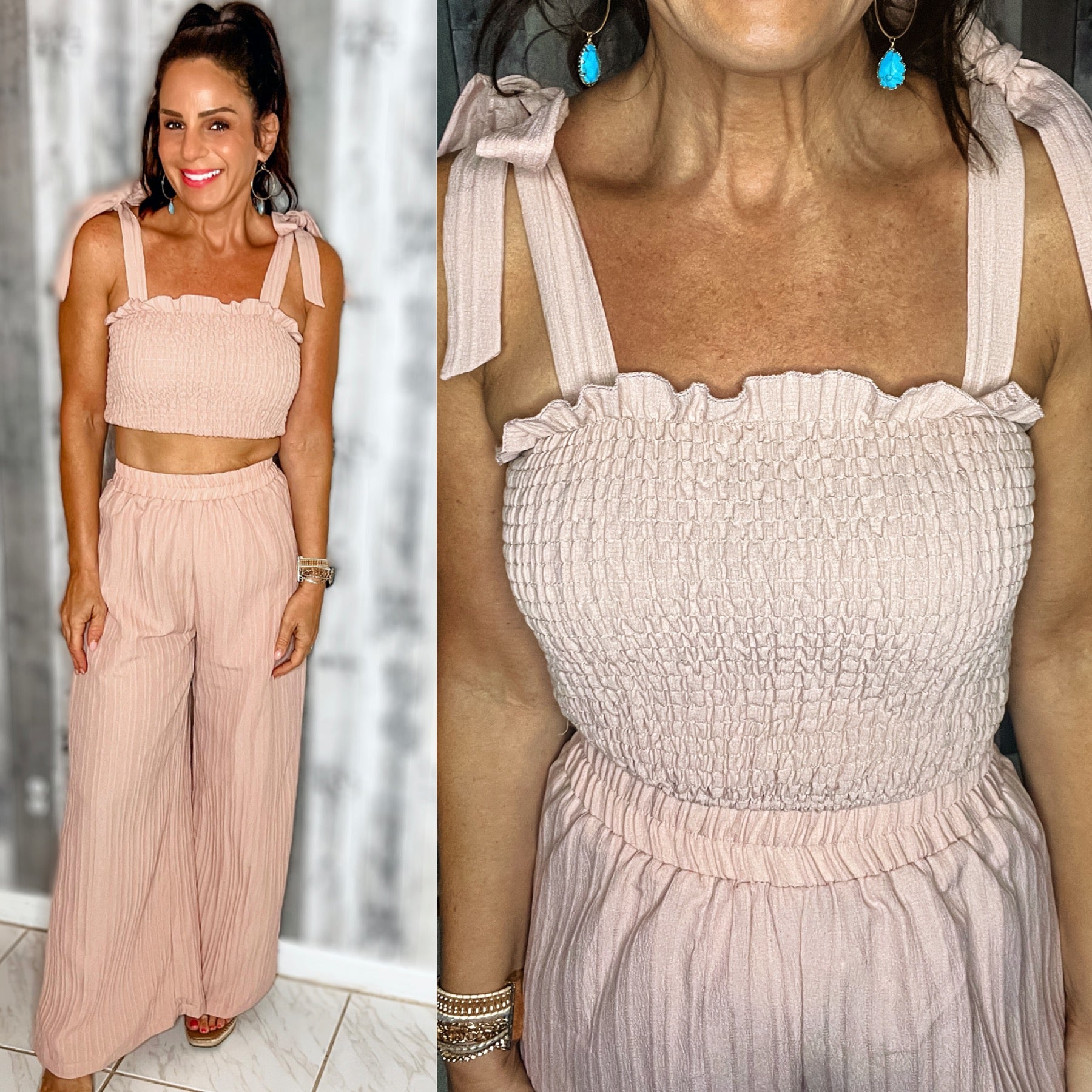 Camille Tie Shoulder Smocked Crop Top and Wide Leg Pants Set