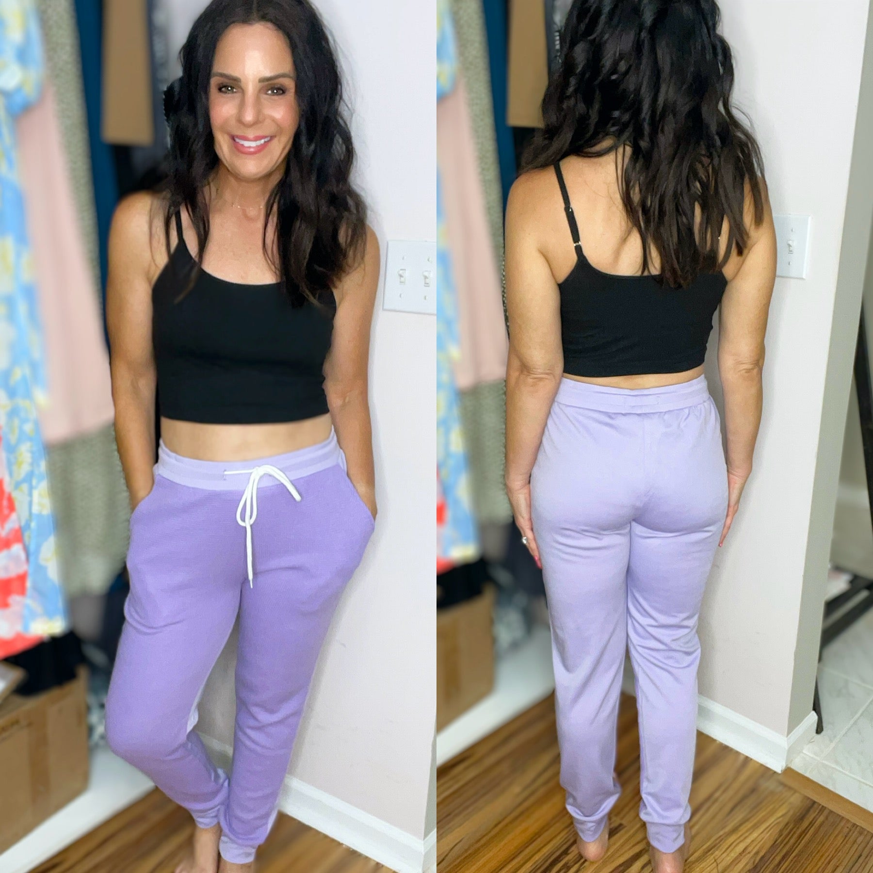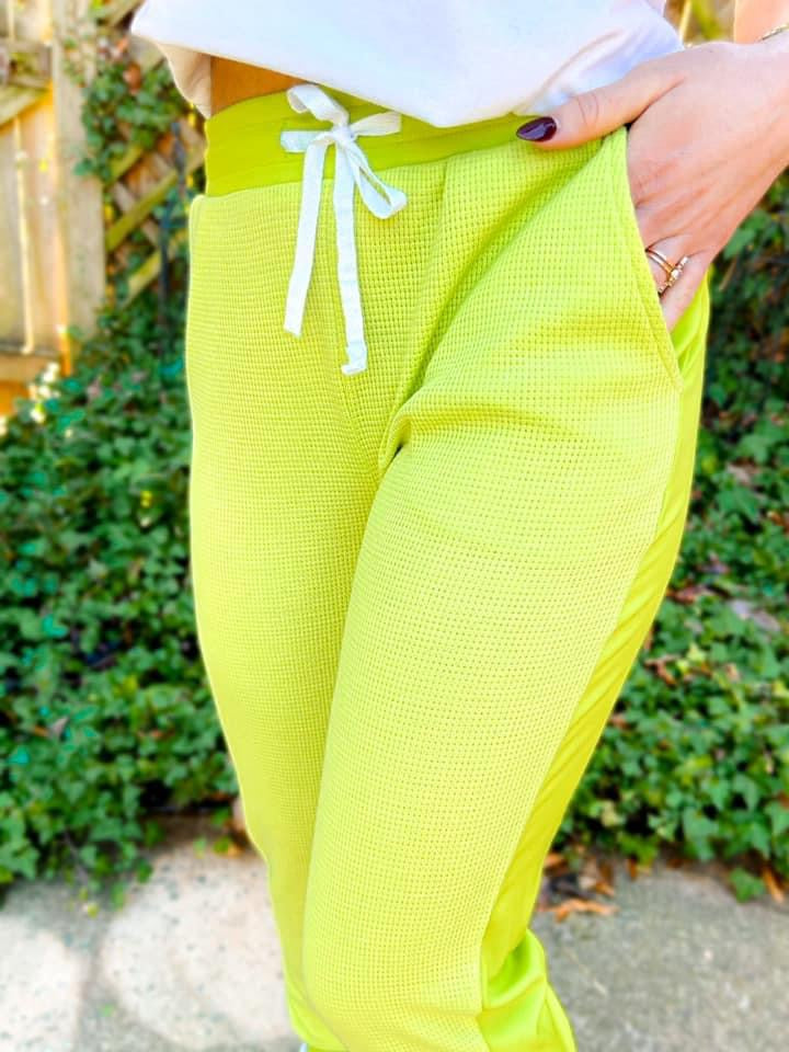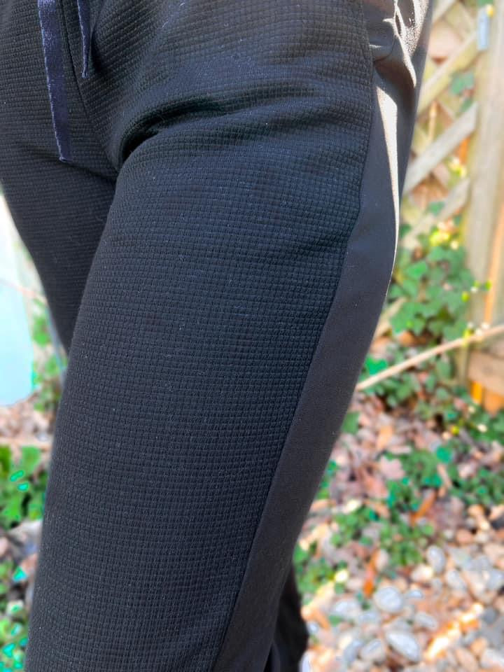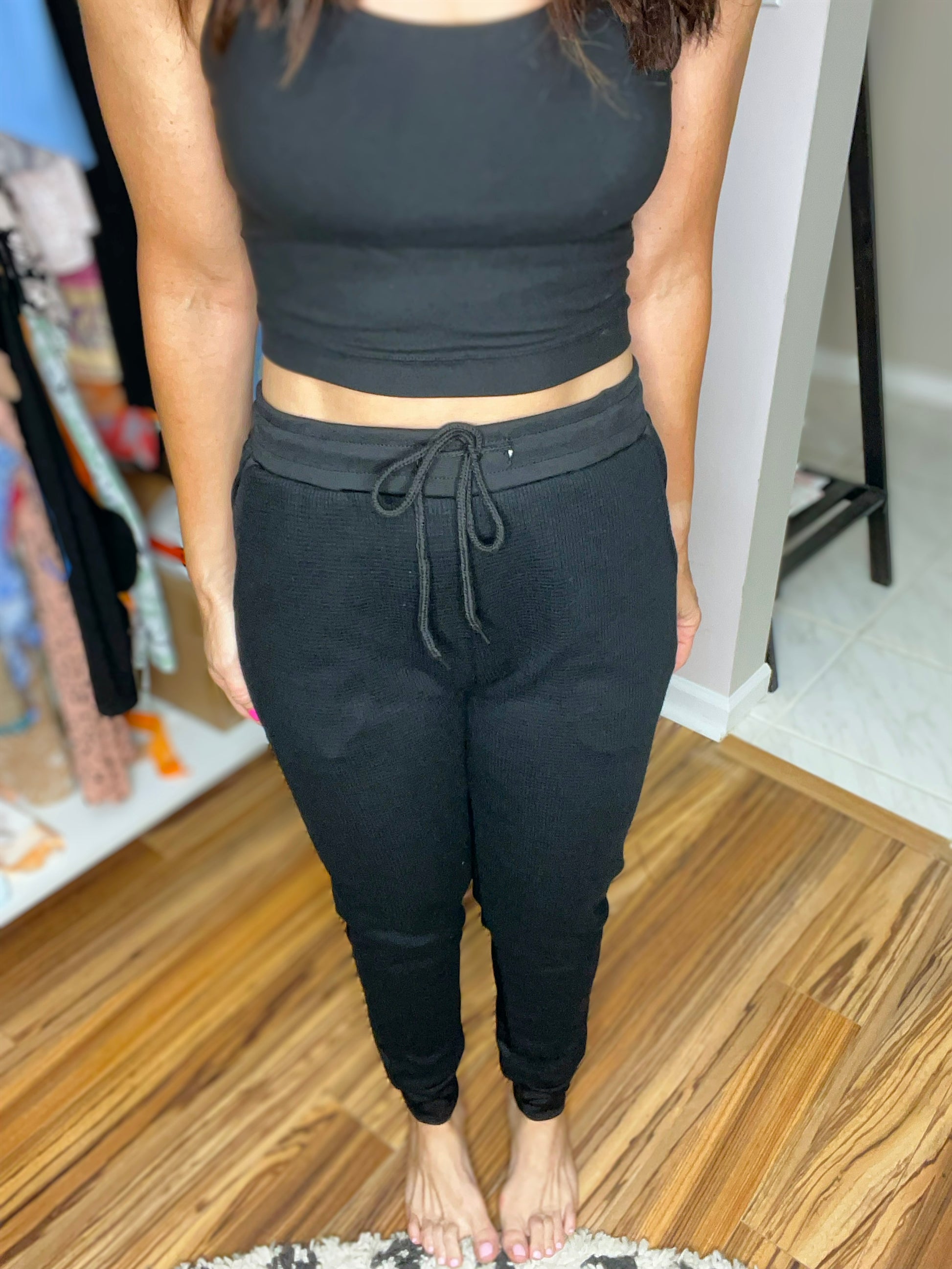 Come meet your new favorite home to HomeGoods, planes to Europe, high fashion joggers! These two tone, two fabric pants combines the right amount of comfort with the right amount of style to give your everyday plans the right amount of oomph! Features an ultra soft waffle knit front with a cooling athletic fabric in the back, mid to high rise waistline, pockets, functional shoestring tie, great stretch, & a moveable bottom hemline to help with all different heights.