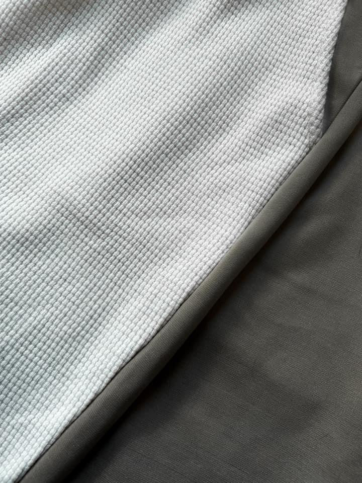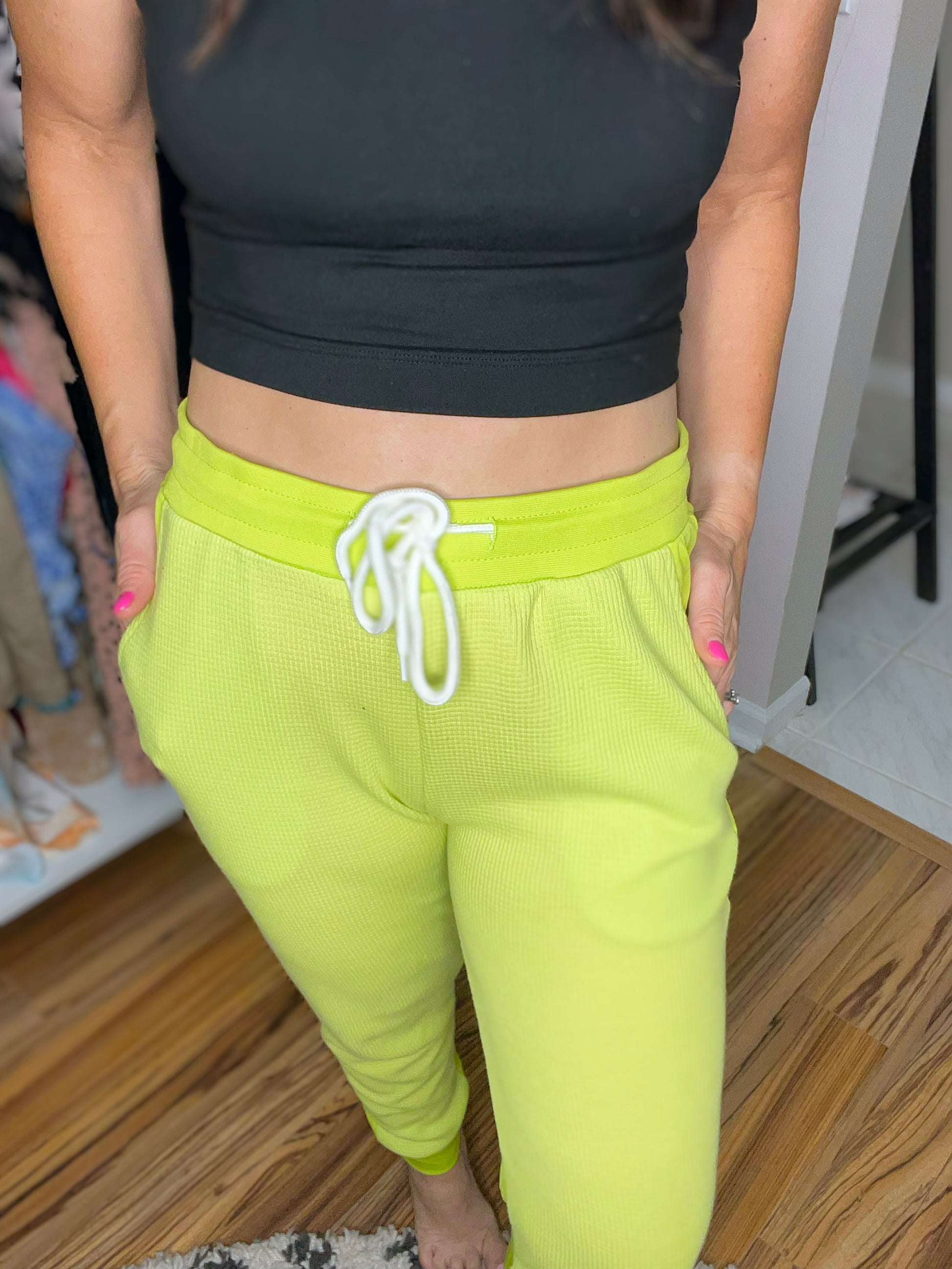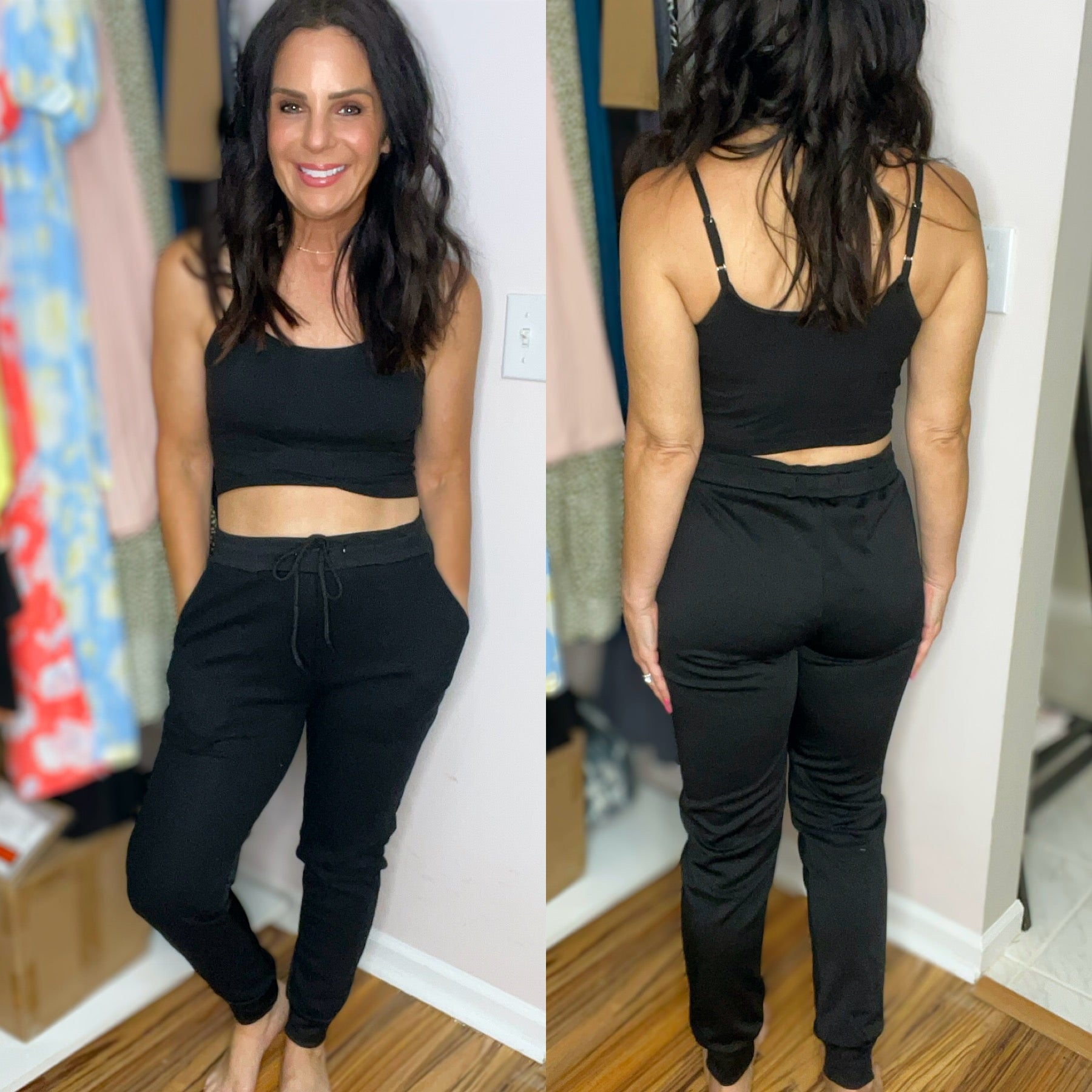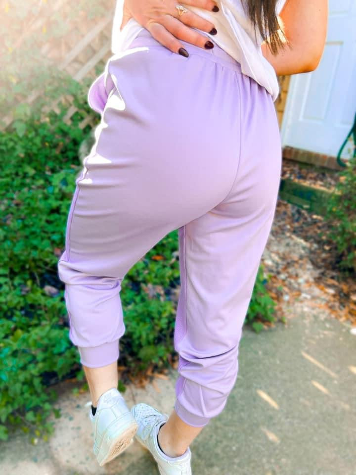 Come meet your new favorite home to HomeGoods, planes to Europe, high fashion joggers! These two tone, two fabric pants combines the right amount of comfort with the right amount of style to give your everyday plans the right amount of oomph! Features an ultra soft waffle knit front with a cooling athletic fabric in the back, mid to high rise waistline, pockets, functional shoestring tie, great stretch, & a moveable bottom hemline to help with all different heights.