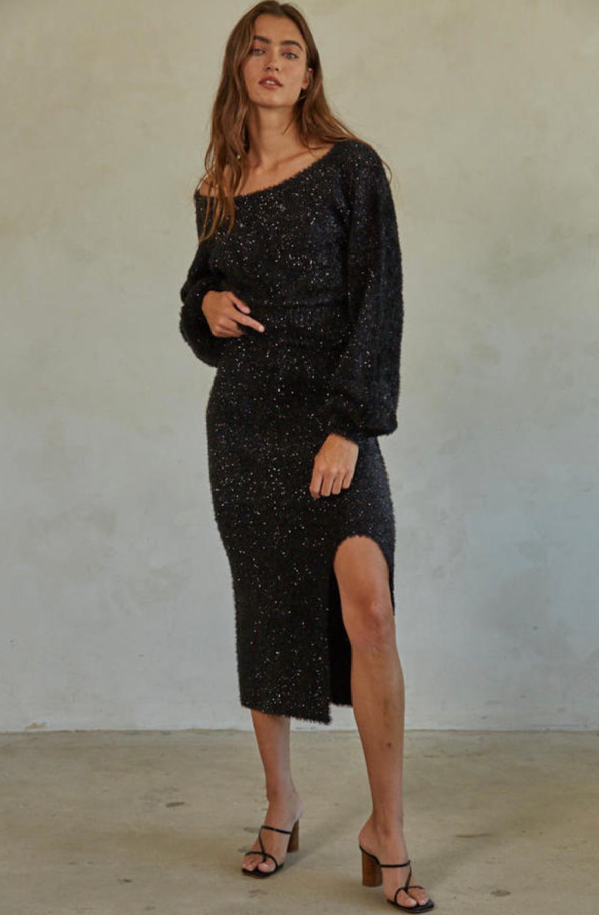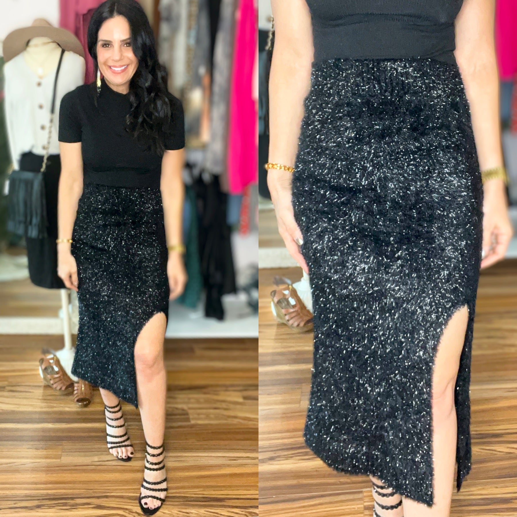 Who's ready for those holiday parties? The Tove skirt is perfect! It is a knit sweater ribbed midi pencil skirt with a front slit. The subtle "furry shimmer" makes this easy to dress up, but it would also be cute worn more casual with a graphic tee and sneakers! Has nice stretch to it. Matching Tove top sold separately.