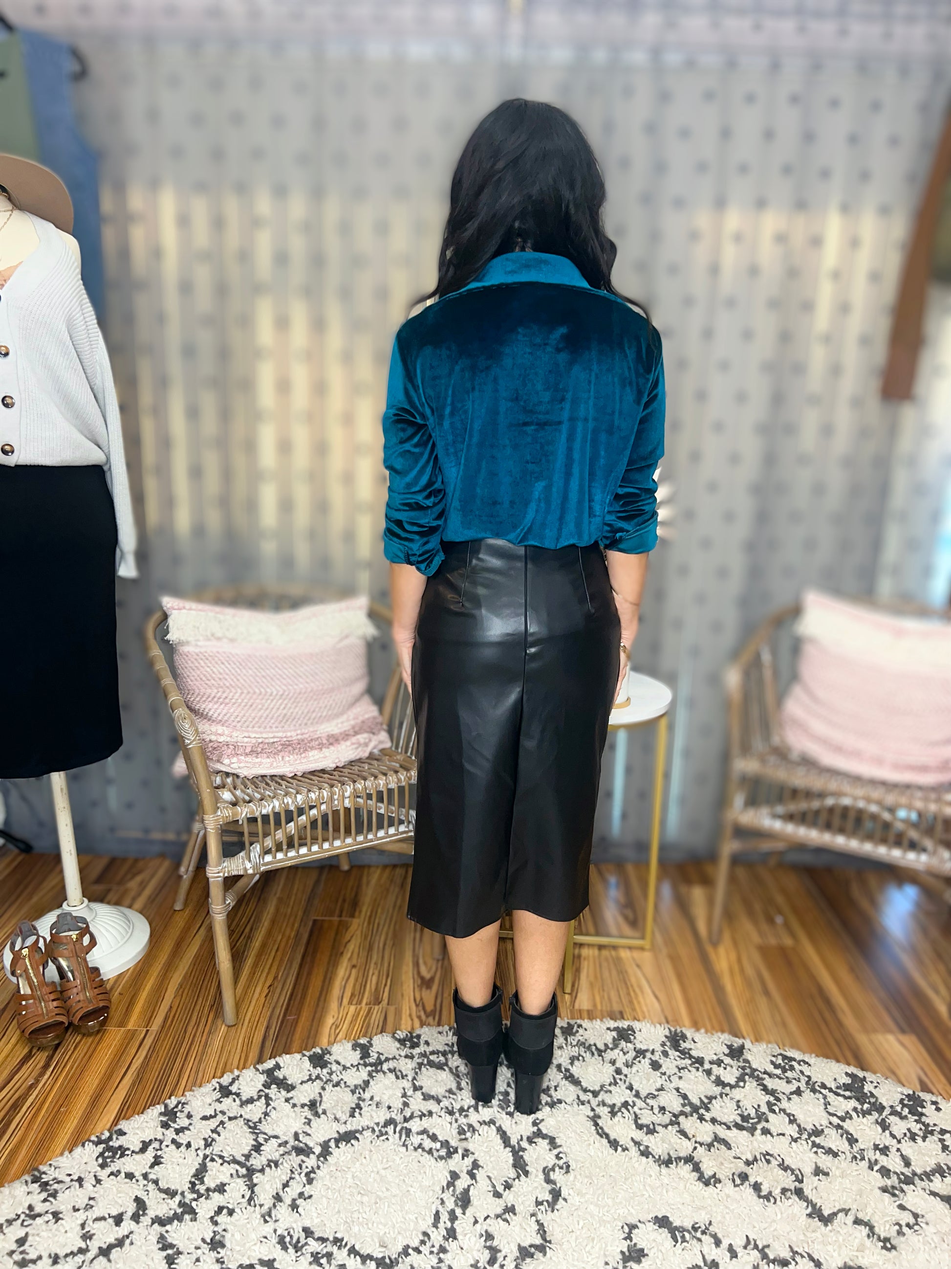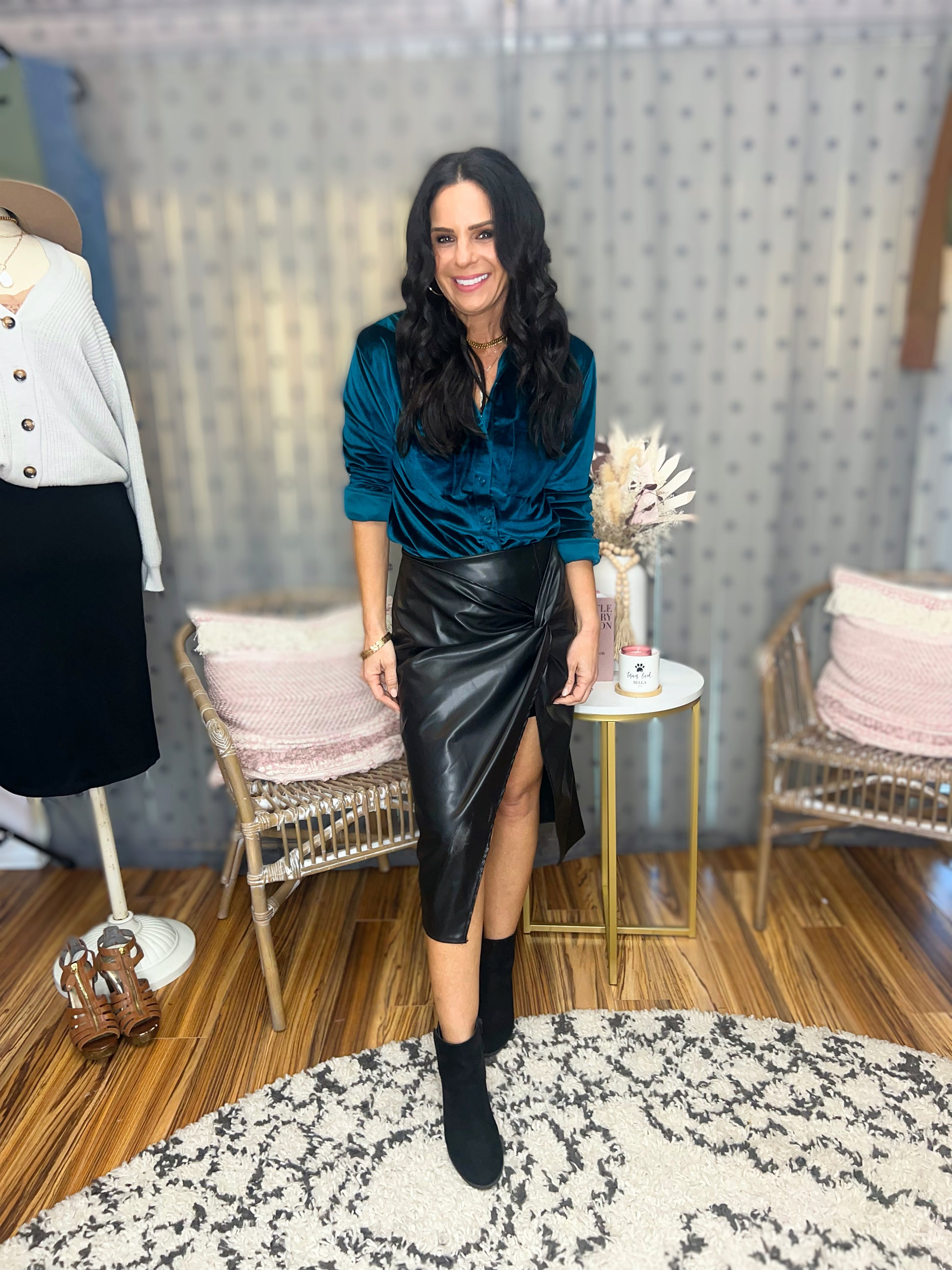 Looking for a trendy but classy faux leather skirt? Meet the Tori!  Features a back zipper and twist front detail with a shorter lining underneath and high slit on the left leg. Does have nice give so if between sizes, you could size down.
