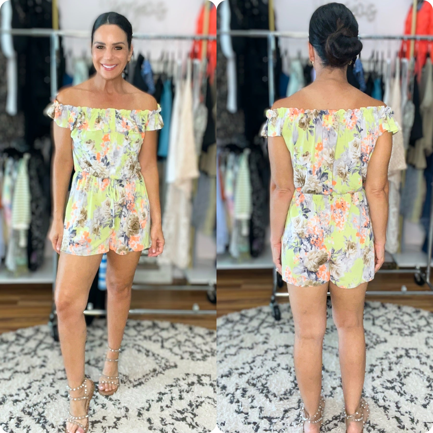 Find your perfect romper with our Until I Found You Off Shoulder Romper in Floral! This unique piece features a Bulgari-inspired design and playful cased elastic details, including the neckline and waistline. With functional side pockets and a front faux button closure, this romper is both stylish and functional. Plus, the decorative waistline tie adds a touch of quirkiness. Get it before it's gone!