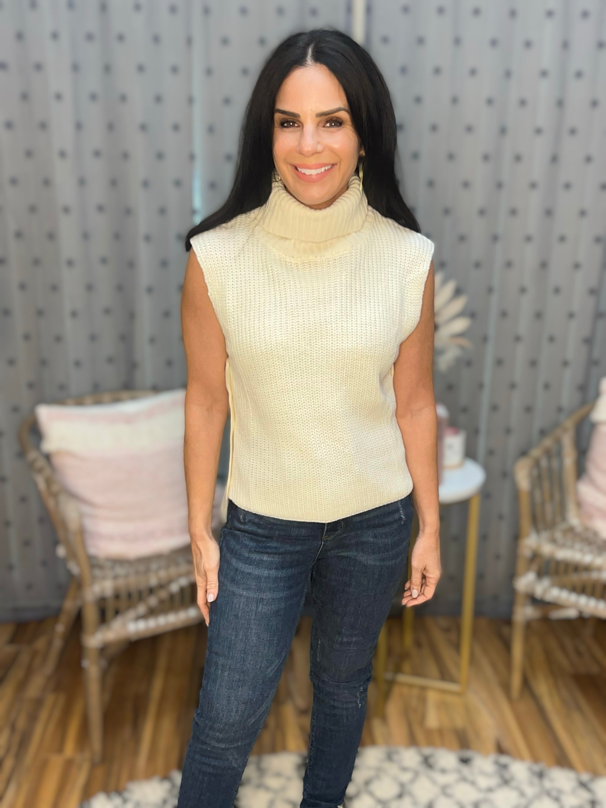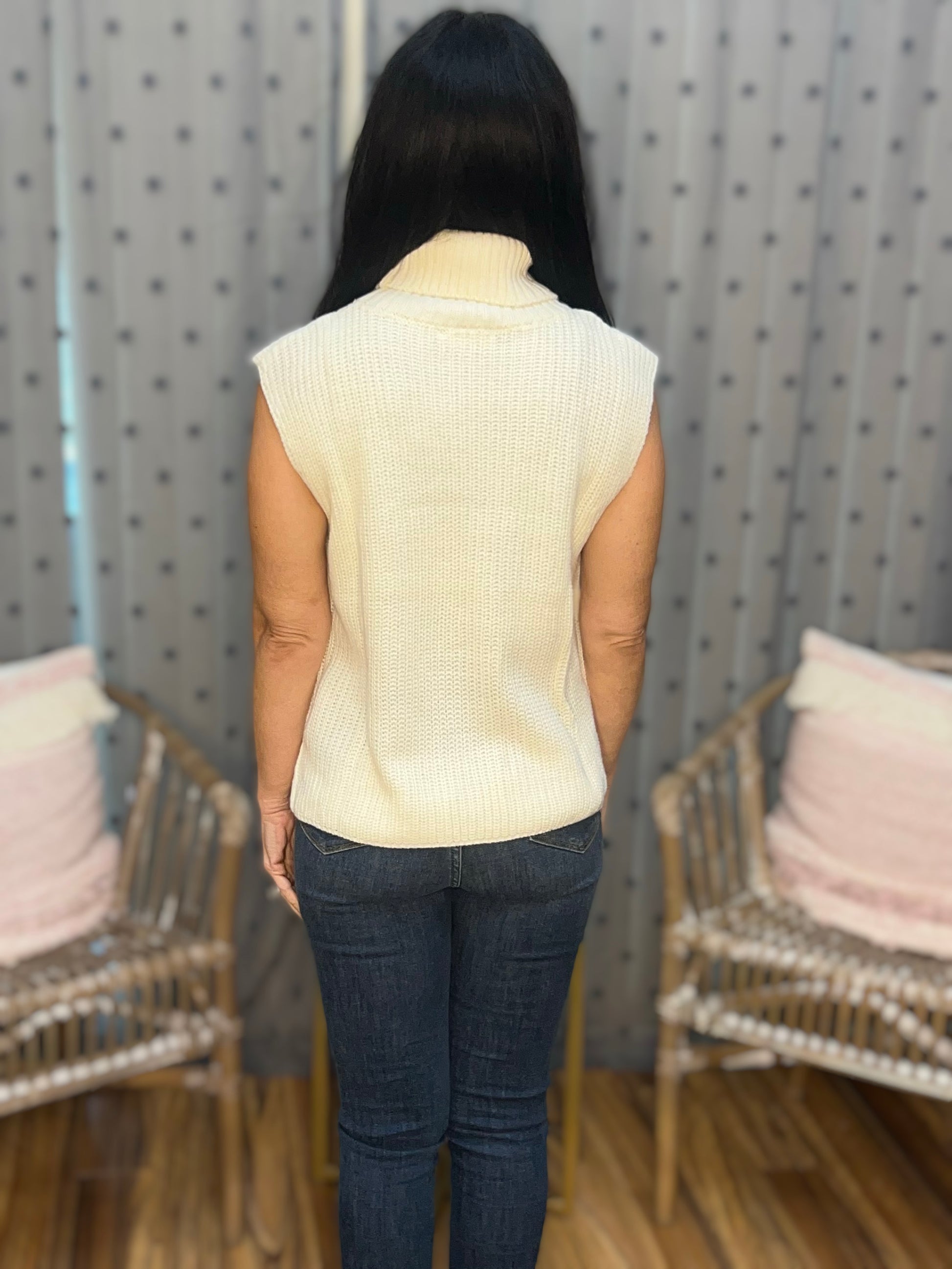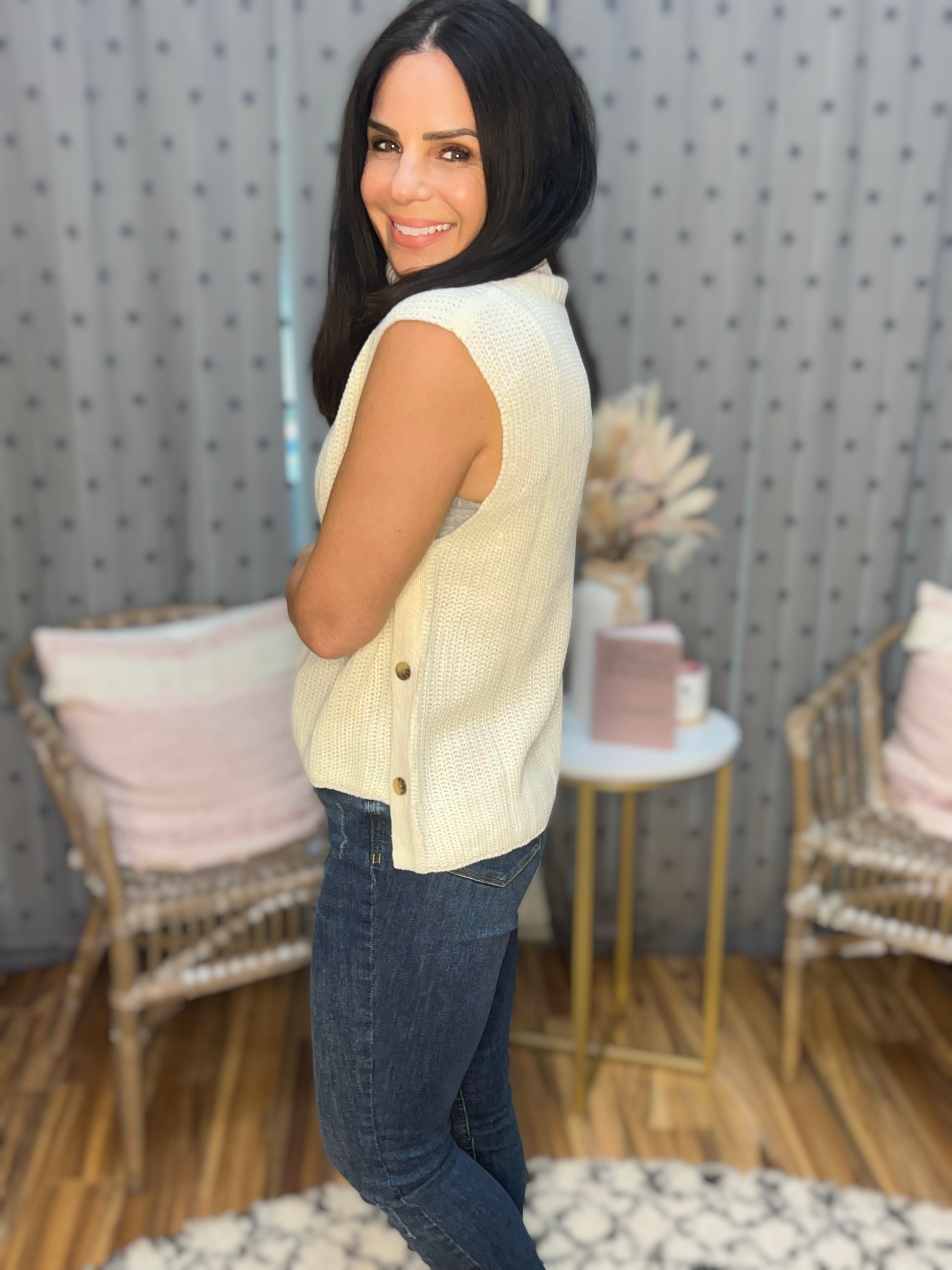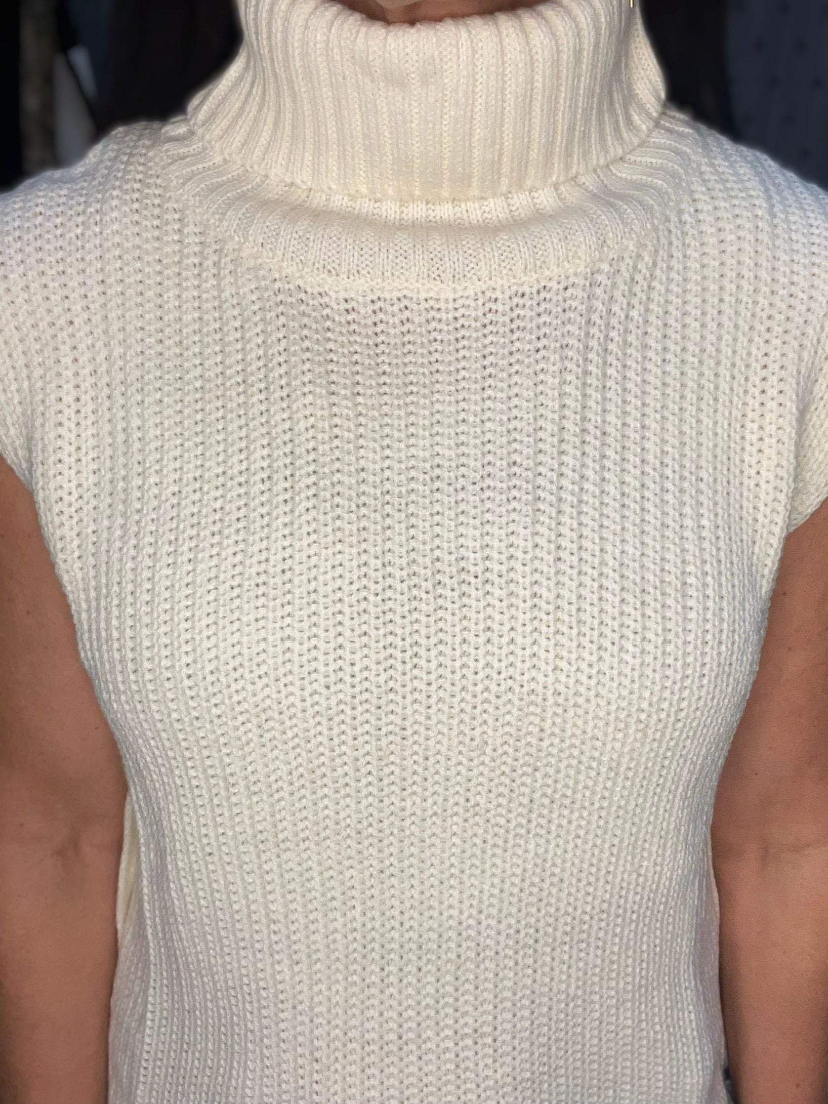 Meet the Carina, a sleeveless turtleneck sweater in a cream-colored chunky knit with functional decorative buttons down each side. Back is a little longer than the front. 100% acrylic