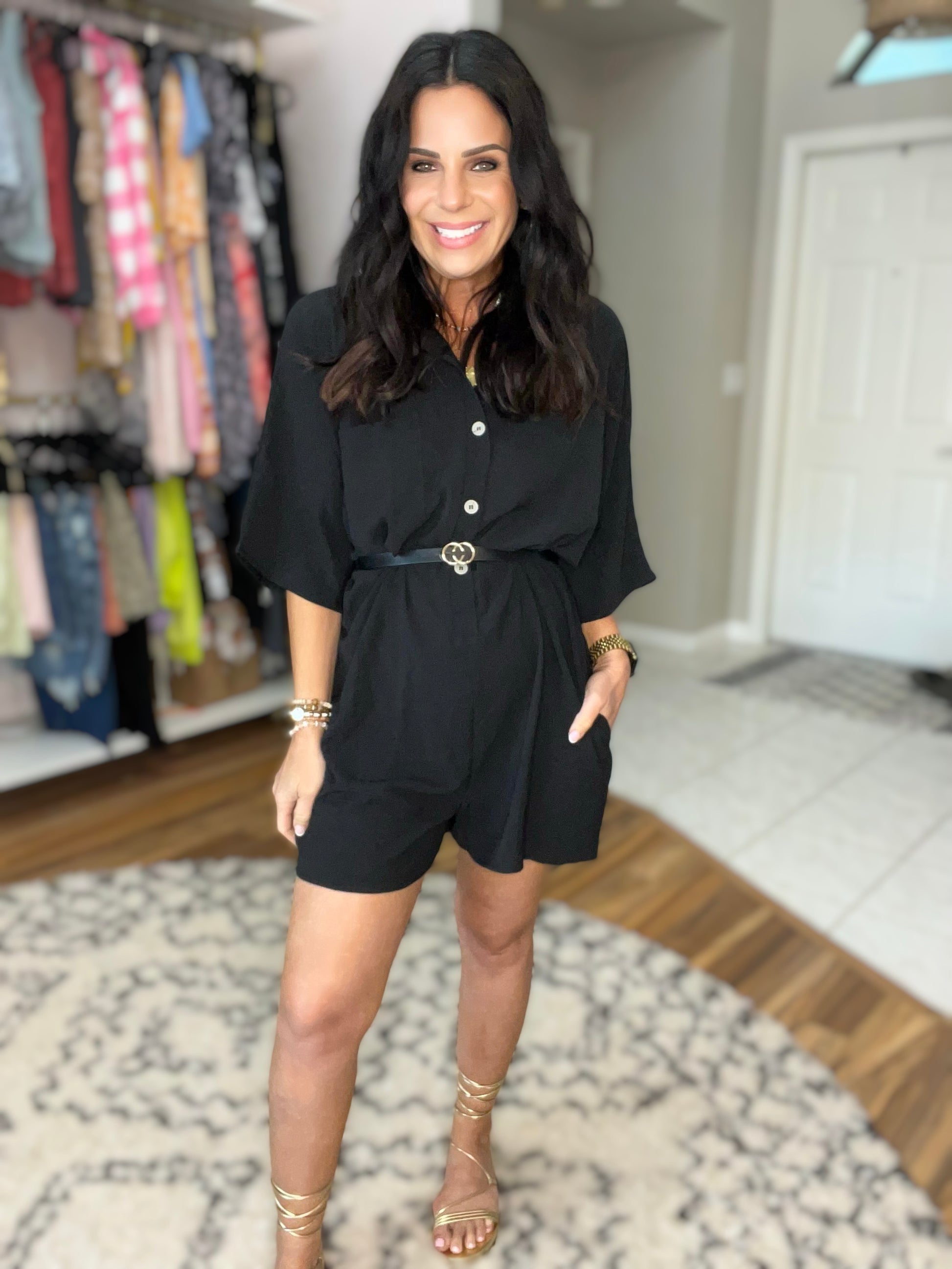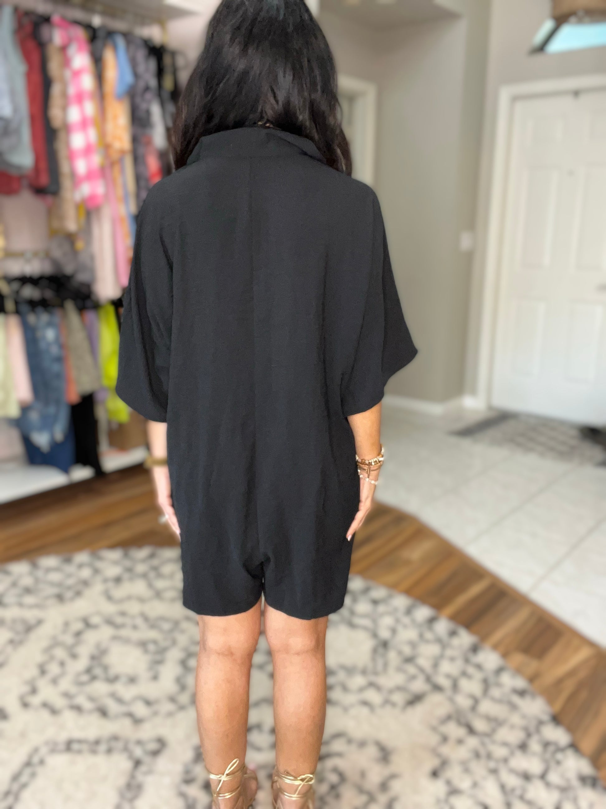 Introducing the Up Early V-Neck Romper - this summers most stylish must-have! Its button front, collared neckline, and convenient side seam pockets provide a relaxed, effortless look. Crafted with air flow crinkle poly, you'll stay cool and chic all day long.