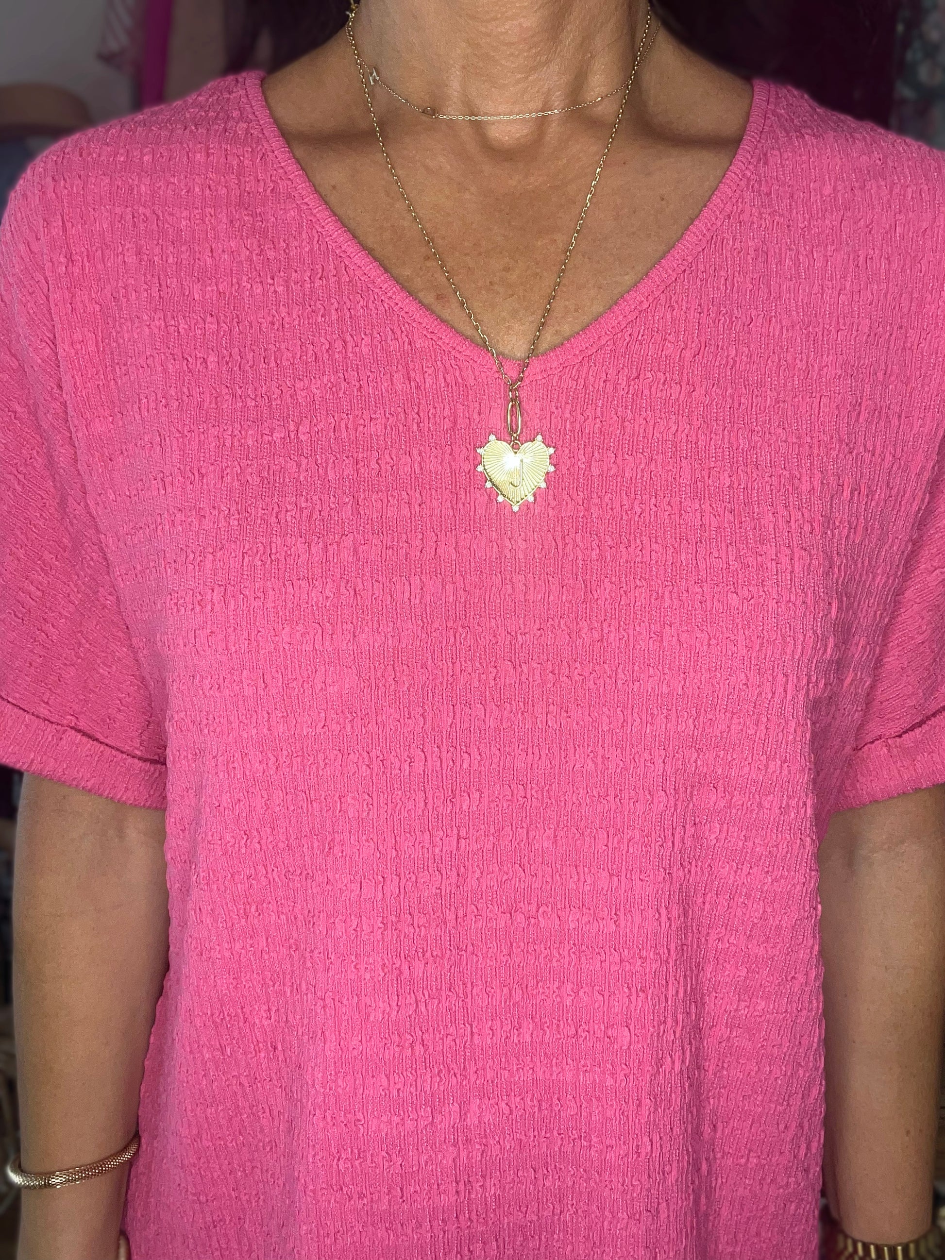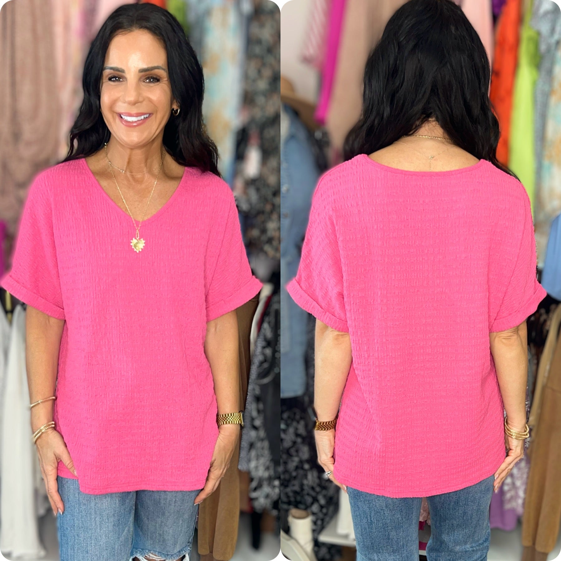 Meet the Amanda, a textured, oversized wide-neck top with cuffed short sleeves in a beautiful bright pink color if you prefer more fitted, you could size down in this one