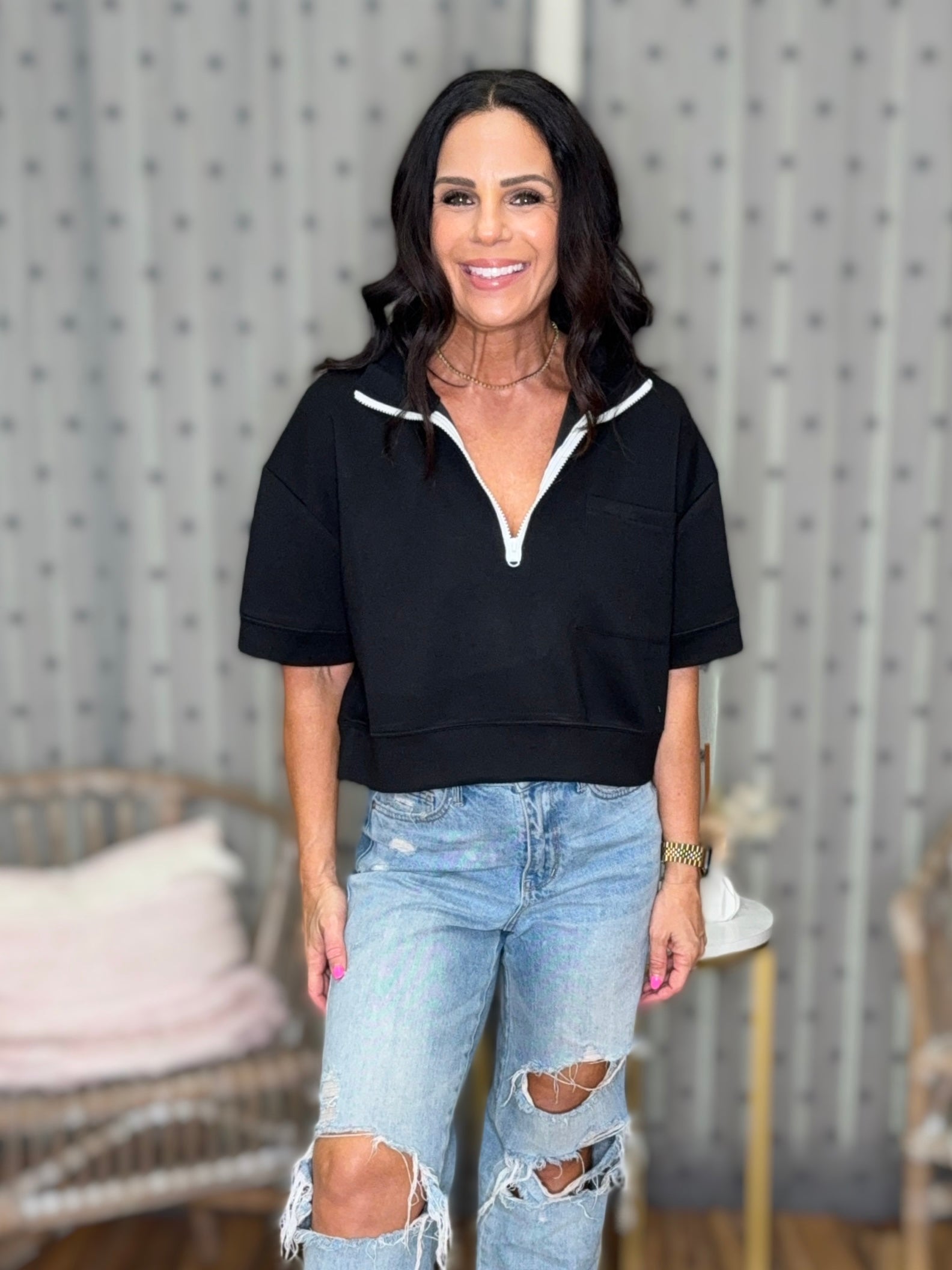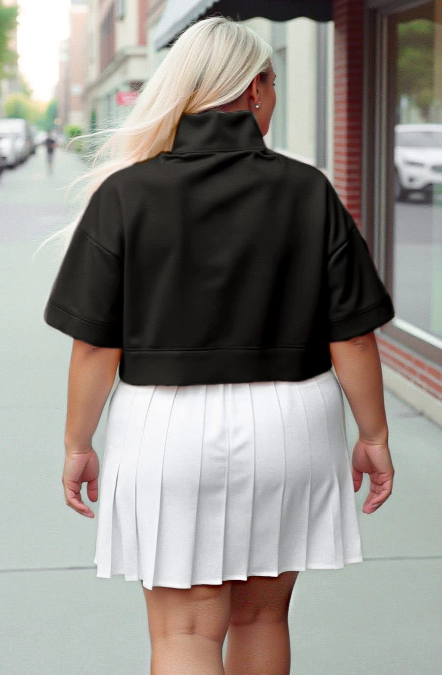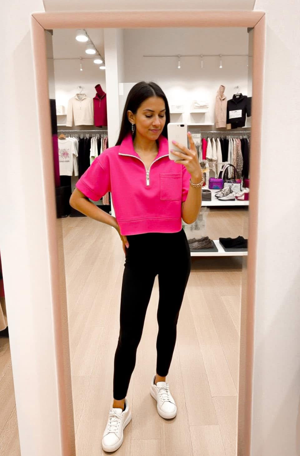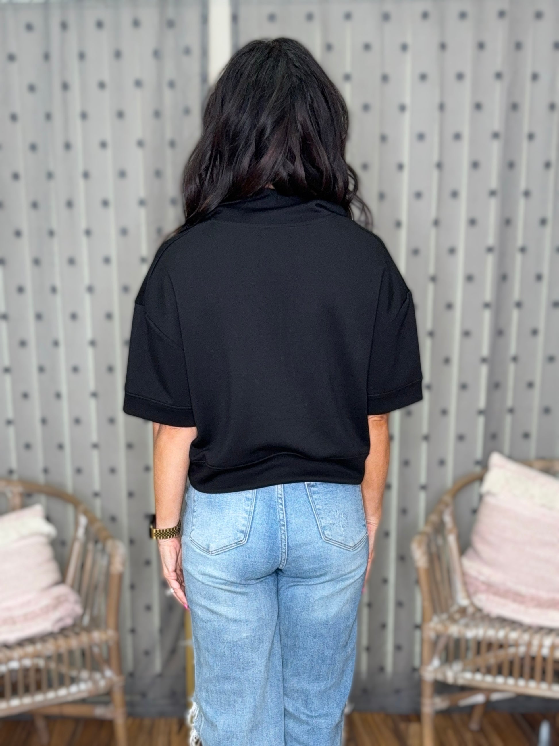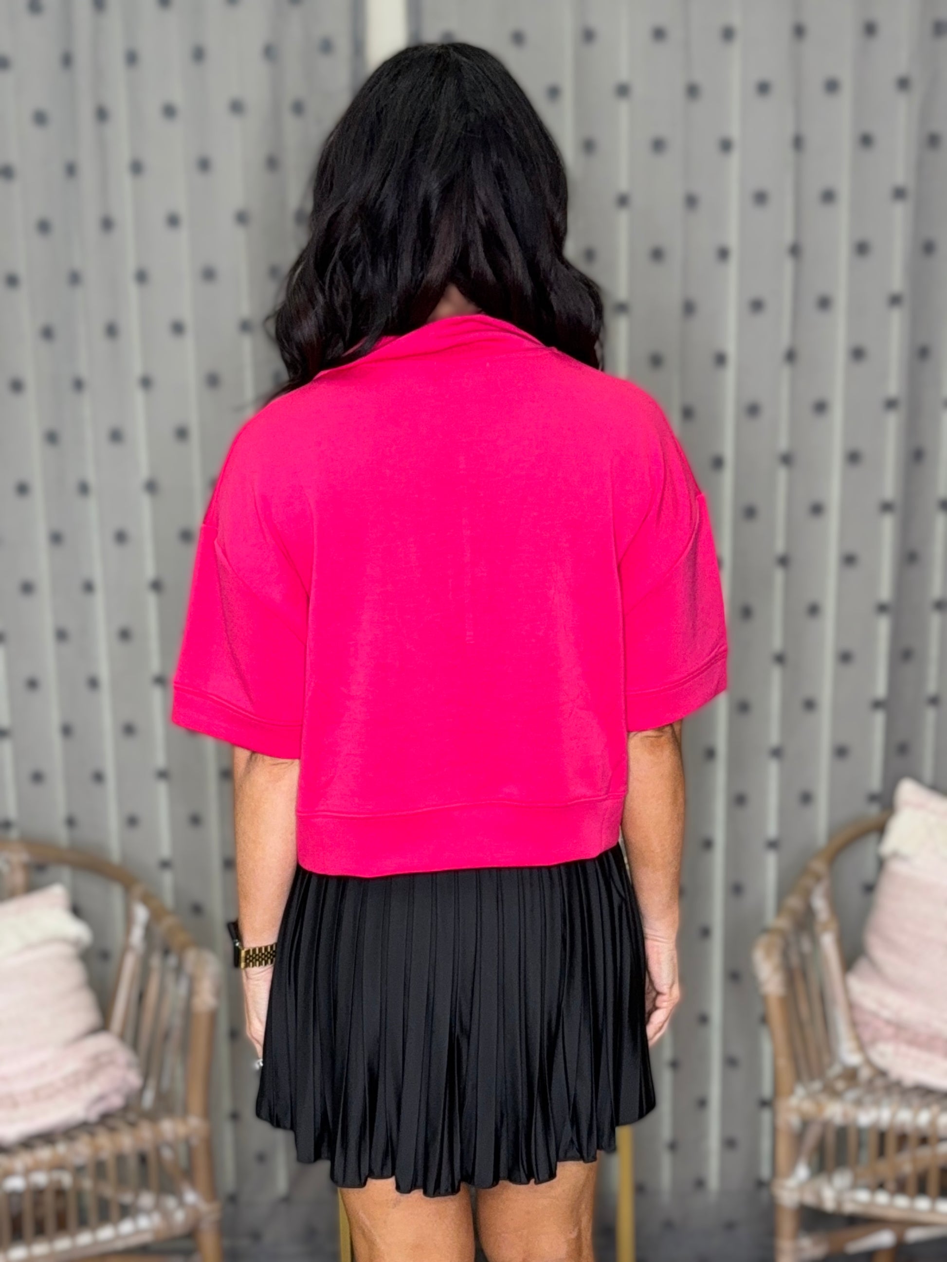 Casually cool with a side of sporty chic. Designed with a modest midi crop length for both our crop top lovers and our less risqué babes alike. The flattering extended-length short sleeves and loose fit will keep you cool in all senses of the word… and so will the ultra lightweight fabric. Perfect for all seasons - but really shines in the summer when you want to feel cute without overheating. The functional zipper gives you options - zip it up for a sleek, sporty feel or zip it down for a pop-up skin. Choose between black or hot pink.